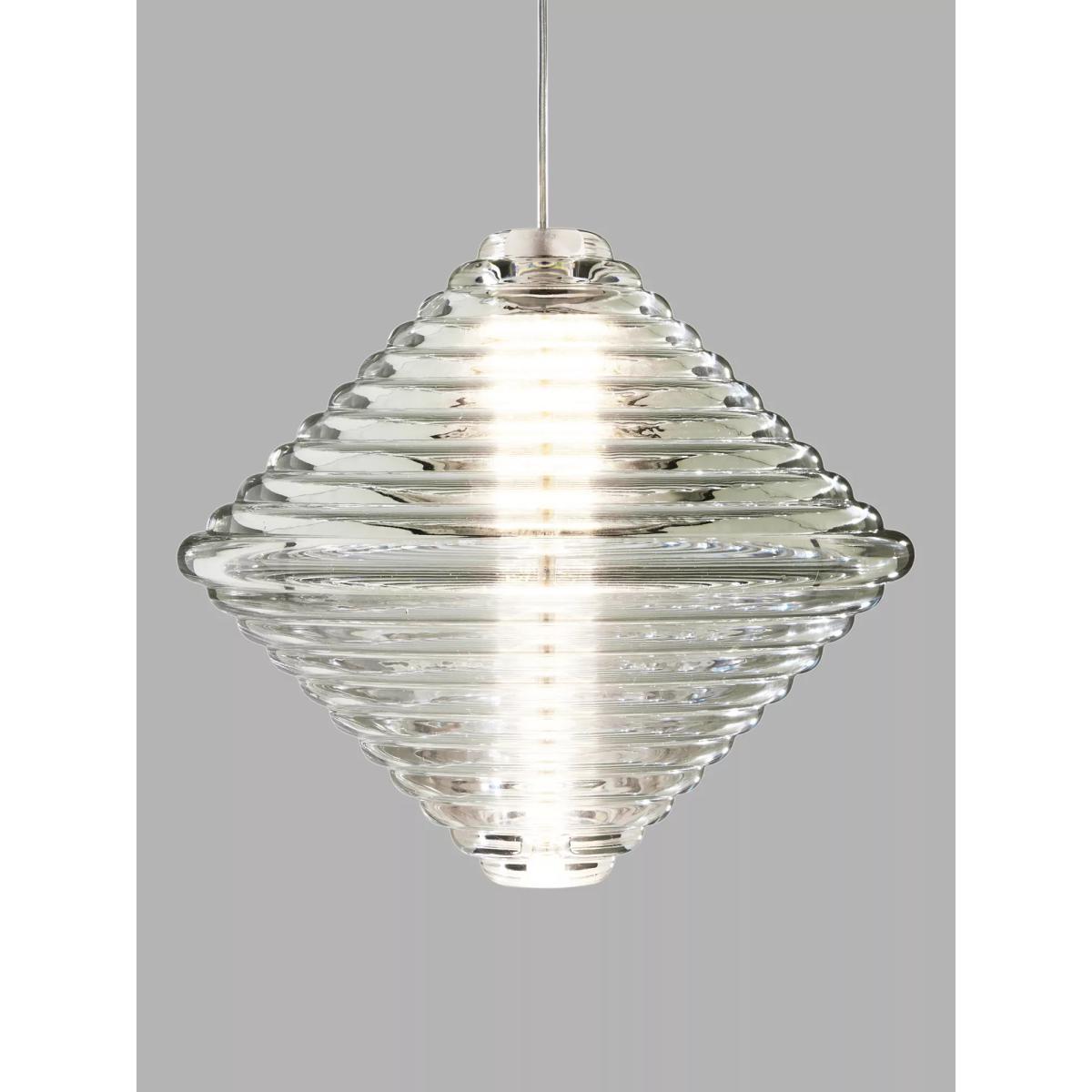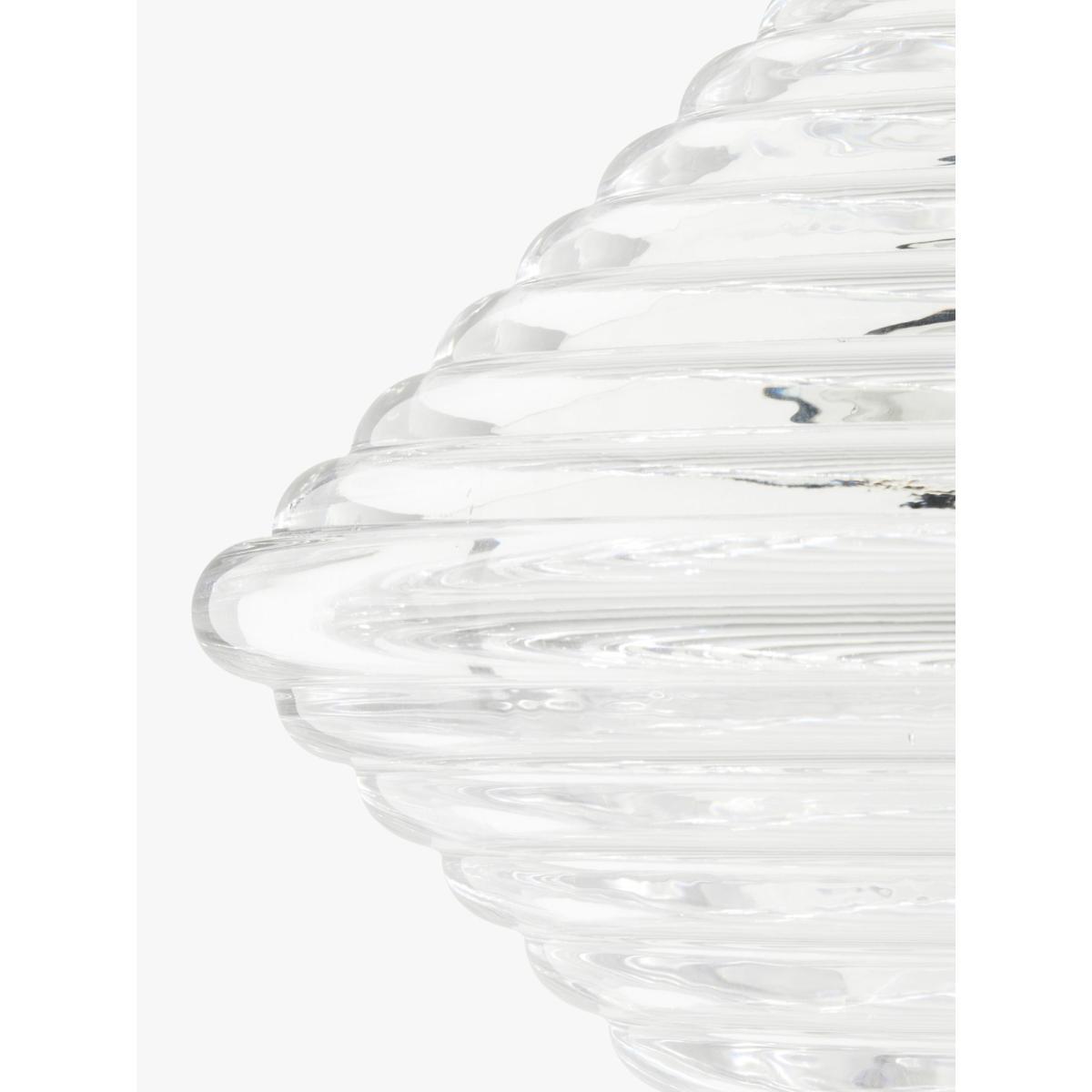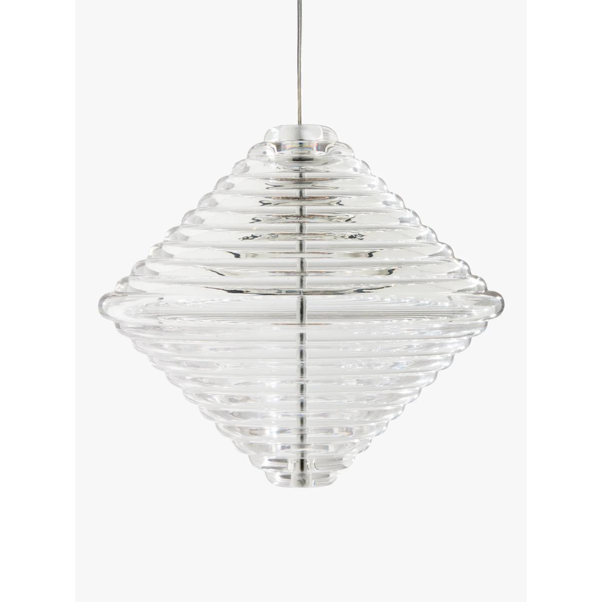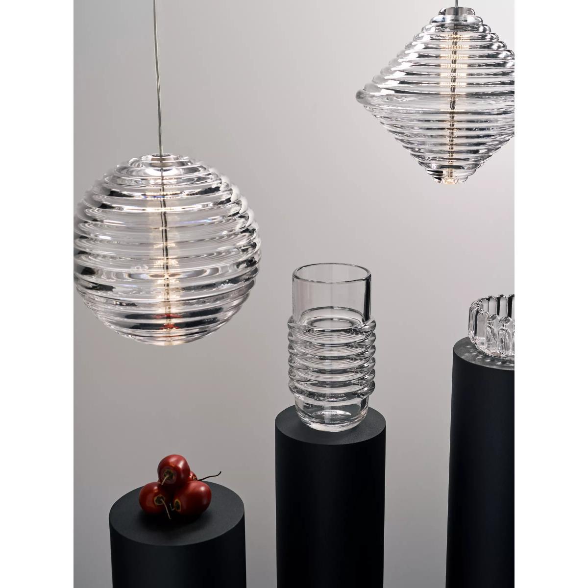 Press, by Tom Dixon, is a series of lights made from the thickest and most transparent glass with a satisfyingly rounded linear surface detail. Aptly named Cone, this bold ceiling pendant is reminiscent of a shipping buoy and its ribbed glass design diffuses the light from the integrated LED, creating linear and stripey patterns. Press is manufactured by dropping massive globs of molten glass at 1,200 degrees centigrade, pressed in iron moulds under tons of pressure to create immensely durable lights. This light is height-adjustable at the point of installation.