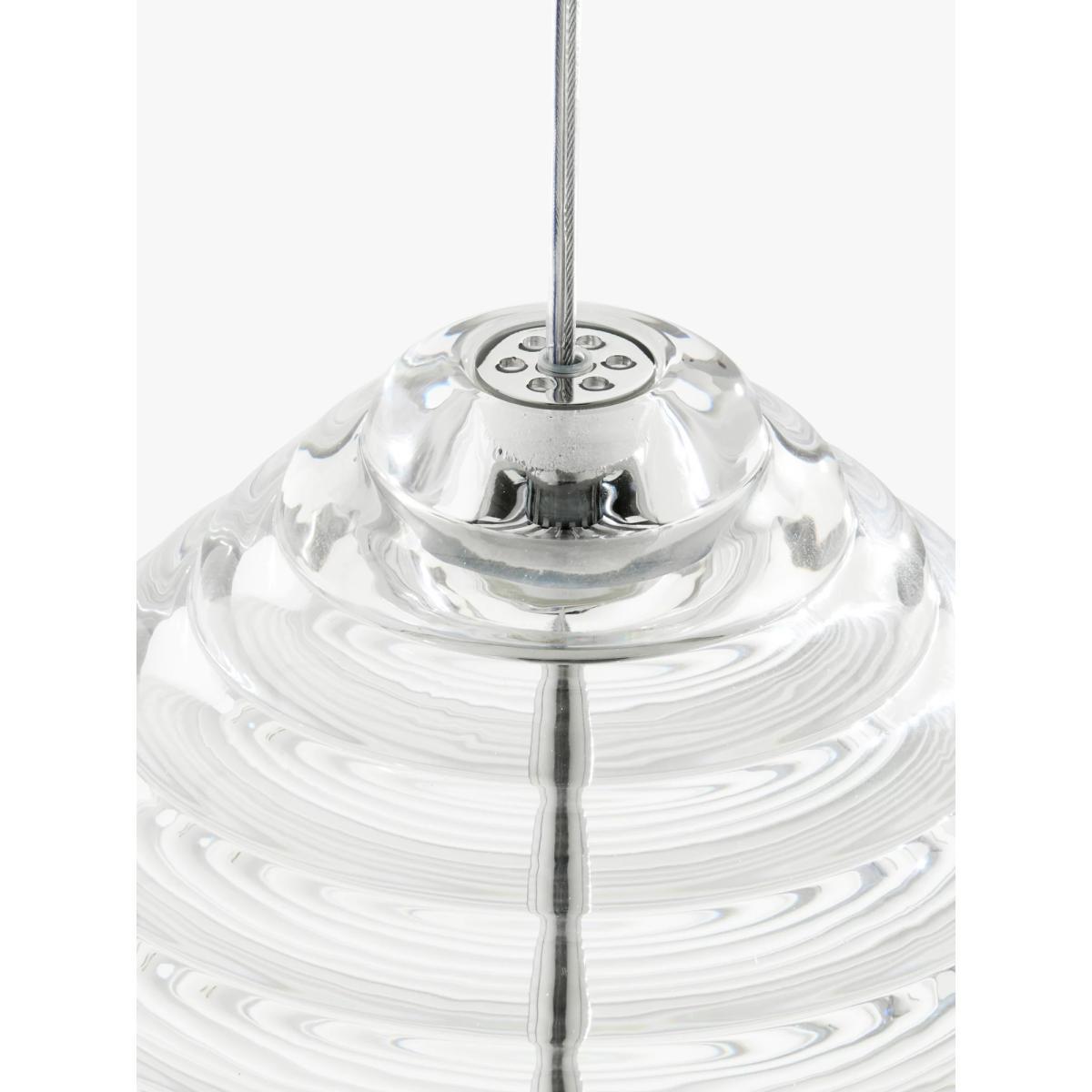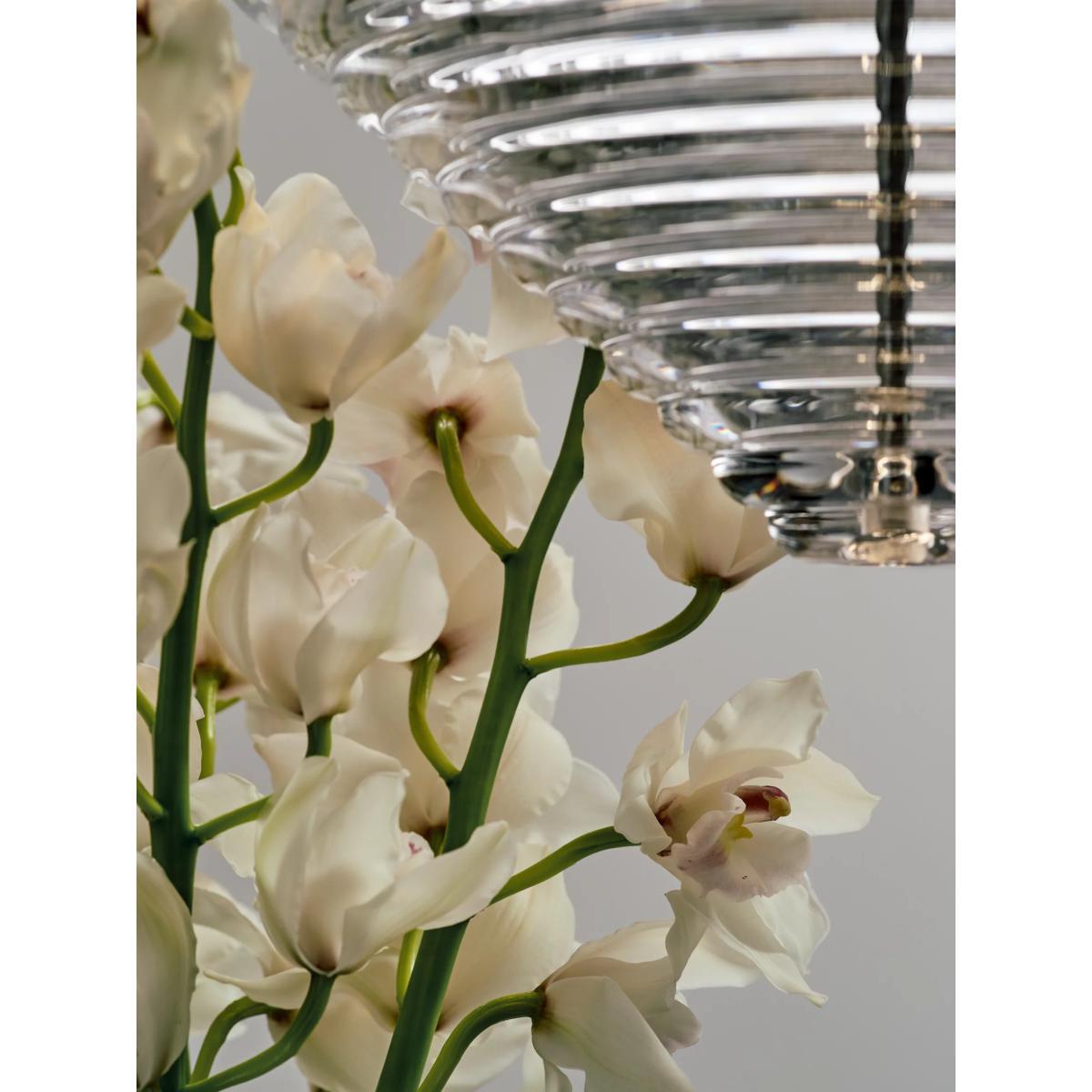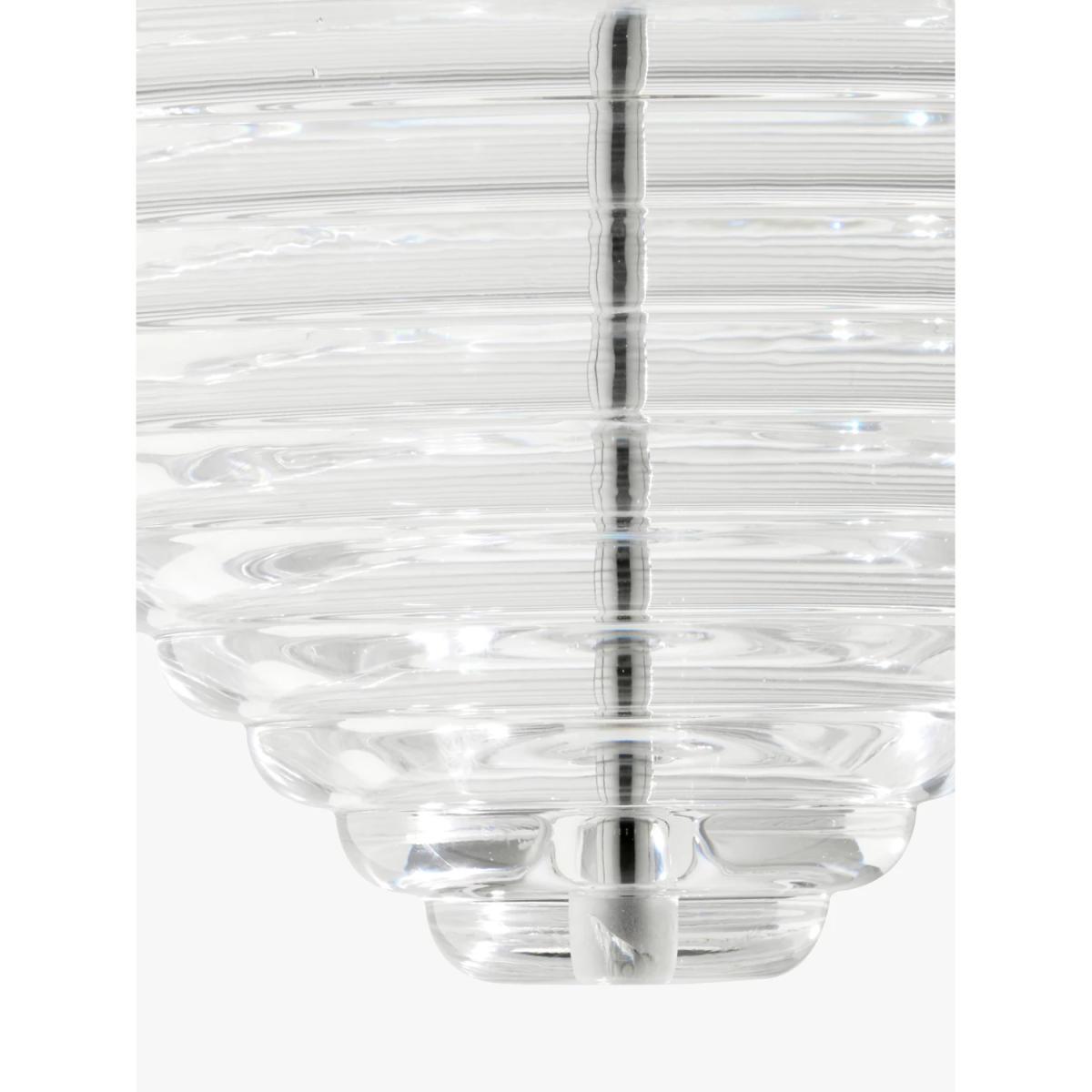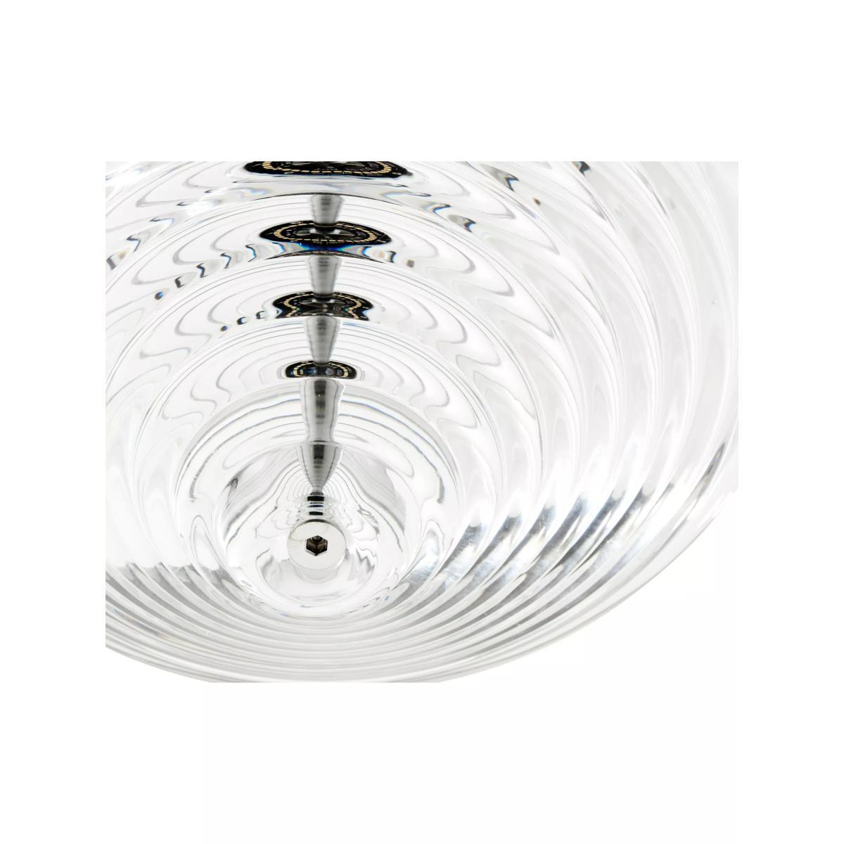 Press, by Tom Dixon, is a series of lights made from the thickest and most transparent glass with a satisfyingly rounded linear surface detail. Aptly named Cone, this bold ceiling pendant is reminiscent of a shipping buoy and its ribbed glass design diffuses the light from the integrated LED, creating linear and stripey patterns. Press is manufactured by dropping massive globs of molten glass at 1,200 degrees centigrade, pressed in iron moulds under tons of pressure to create immensely durable lights. This light is height-adjustable at the point of installation.