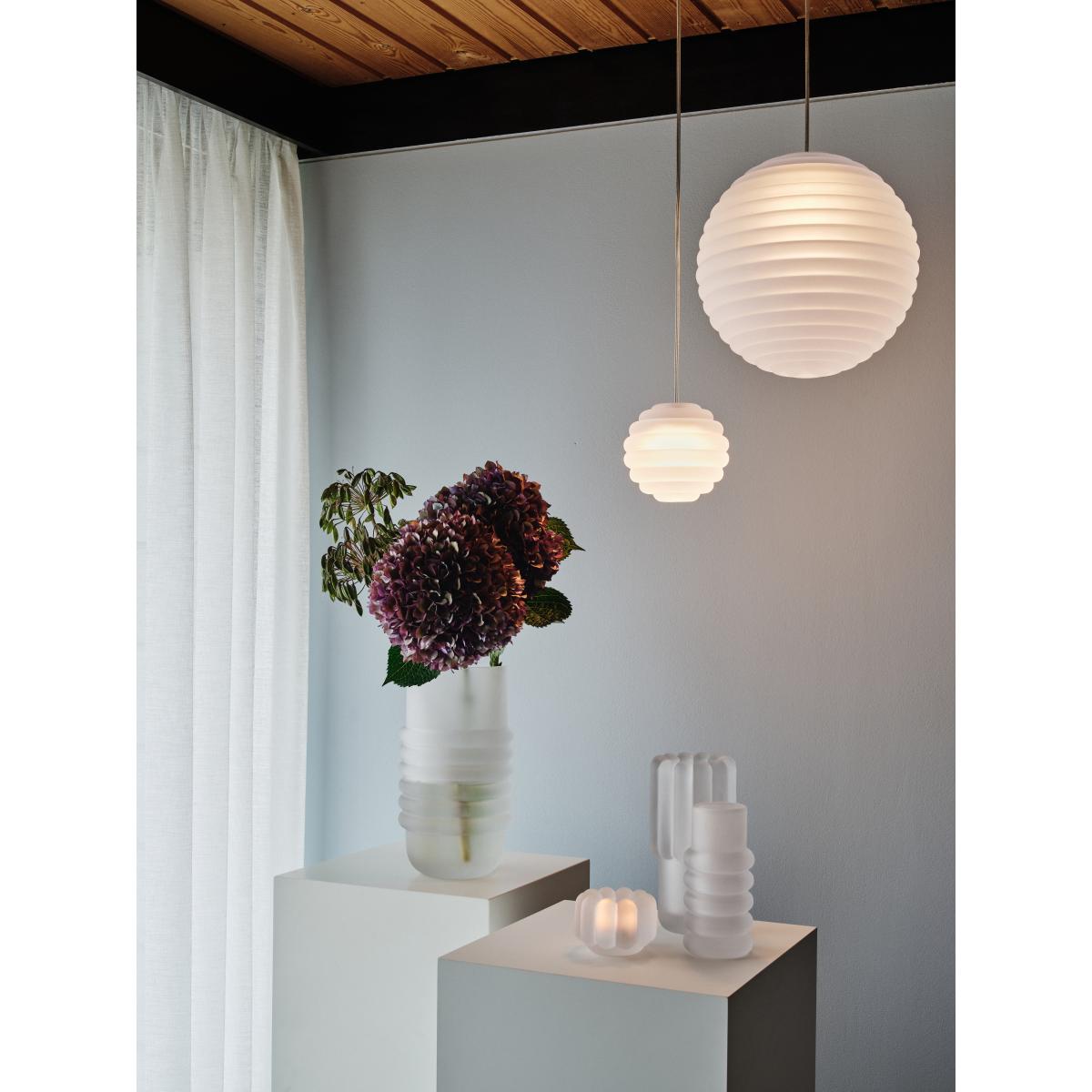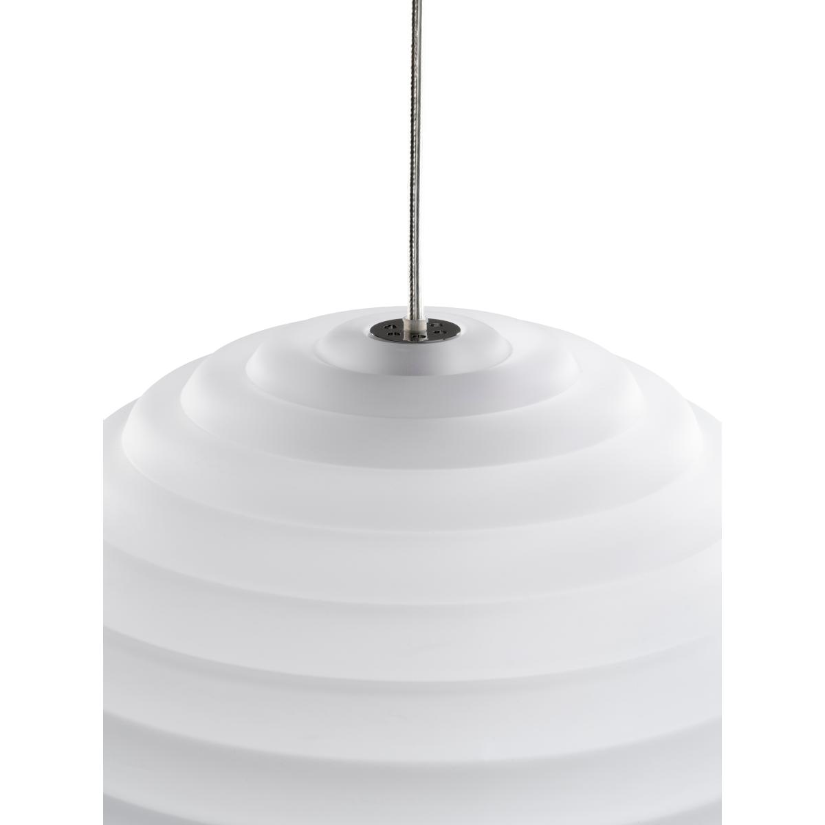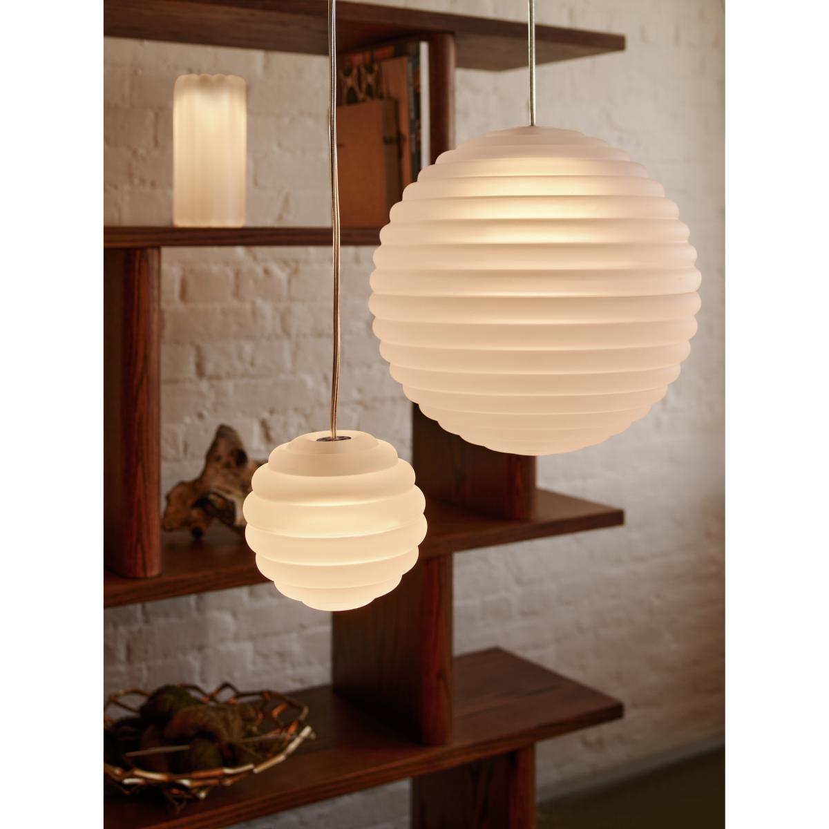 Press Sphere mini pendant LED Ø14,5 cm by Tom Dixon is a compact and versatile lighting solution. Made from thick, industrially pressed glass that refracts light, its ribbed surface creates linear and striped patterns. With an IP45 rating, it is perfect for both indoor and outdoor use. Comes with gloves to avoid fingerprints. With energy-efficient LED lighting and a decorative glass ceiling rose, it is designed to be used in clusters.
