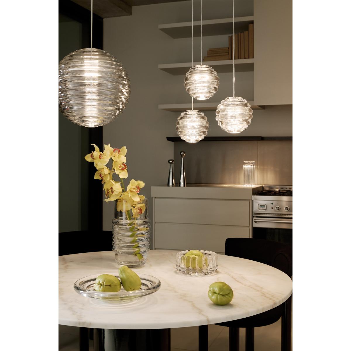 I love the Tom Dixon Press Sphere pendants because of their striking yet versatile design. The clear, ribbed glass creates a beautiful diffusion of light, making them ideal for contemporary and minimalist settings, but they also work well in eclectic or industrial interiors where their sculptural form can be a statement piece. Styling tips include hanging multiples at varying heights over dining tables or kitchen islands to add visual interest, or using a single pendant in a bedroom for a clean, modern look. Since the clear glass is so adaptable, pairing them with coloured or brass fittings can elevate their style, and they work particularly well in spaces where a bit of transparency and sparkle is welcomed.