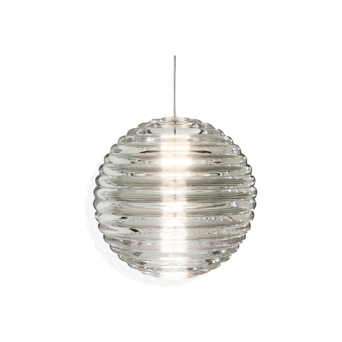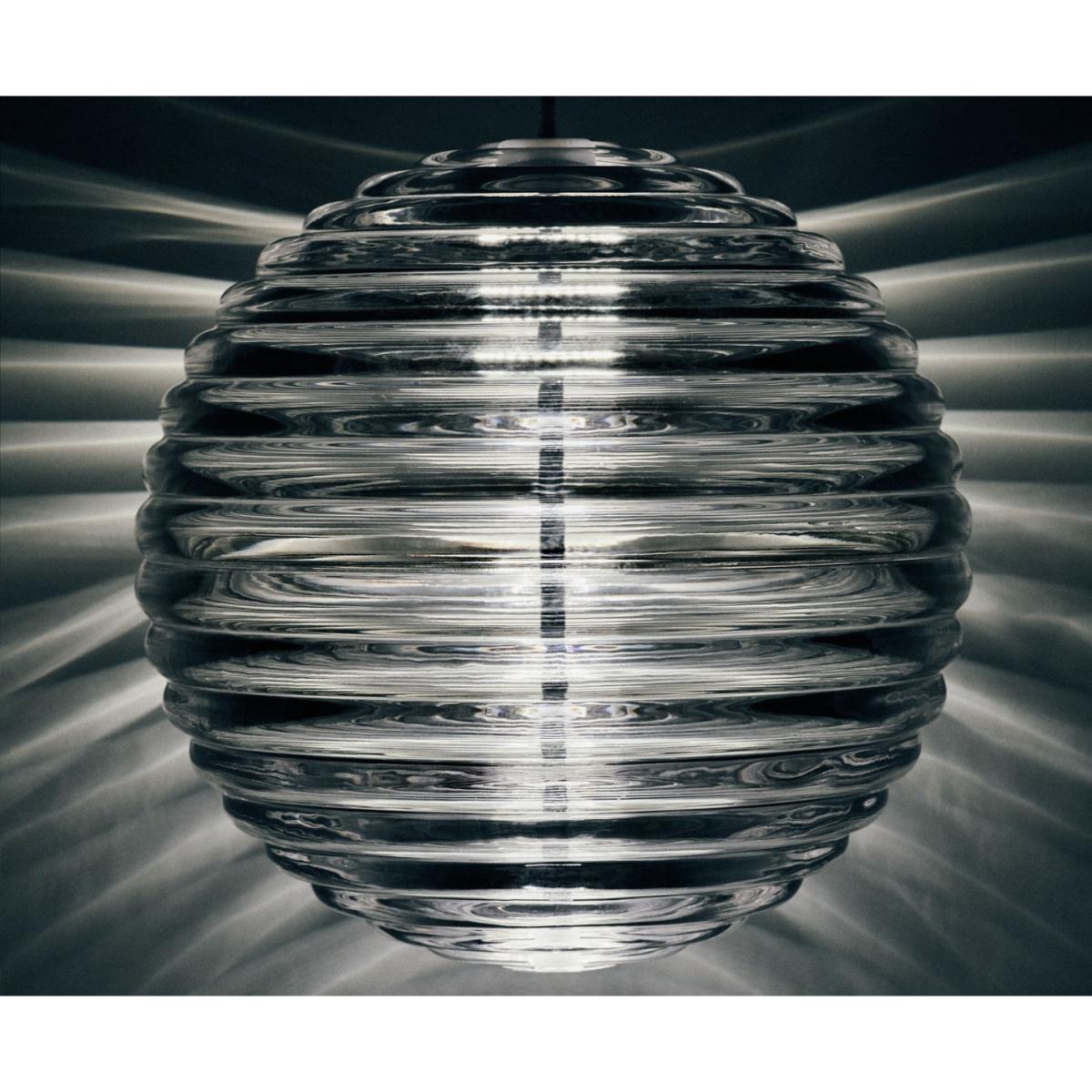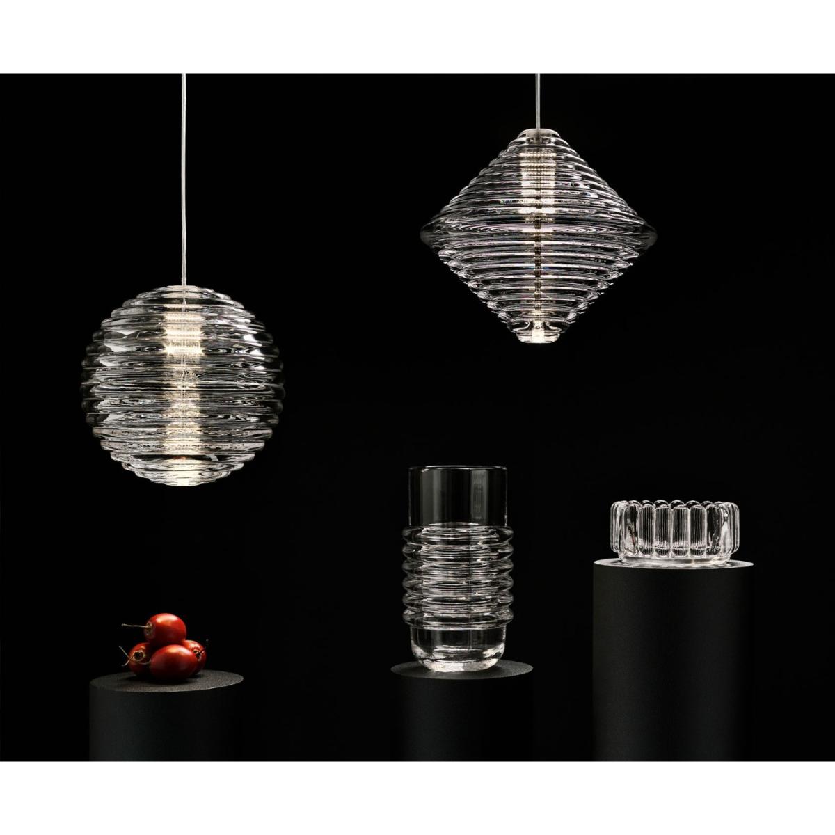 Press is a series of lights made from the thickest and most transparent glass with a satisfyingly rounded linear surface detail. Aptly named Sphere, the shape is reminiscent of shipping buoys and children’s toys. The ribbed glass creates diffusion of the light source and projects linear and stripy patterns. Bold in silhouette and simple in function, Press is manufactured by dropping massive globs of molten glass at 1,200 degrees centigrade, pressed in iron moulds under tons of pressure to create immensely durable lights.
