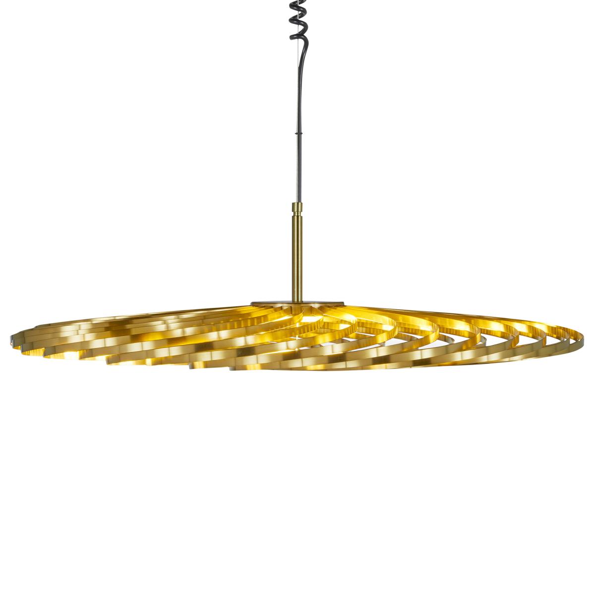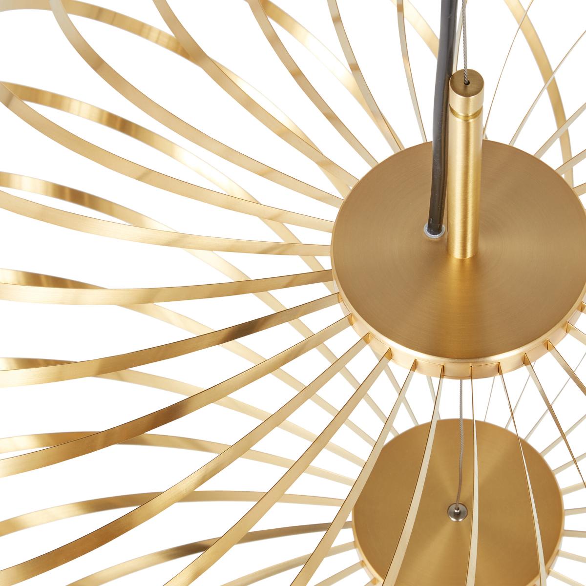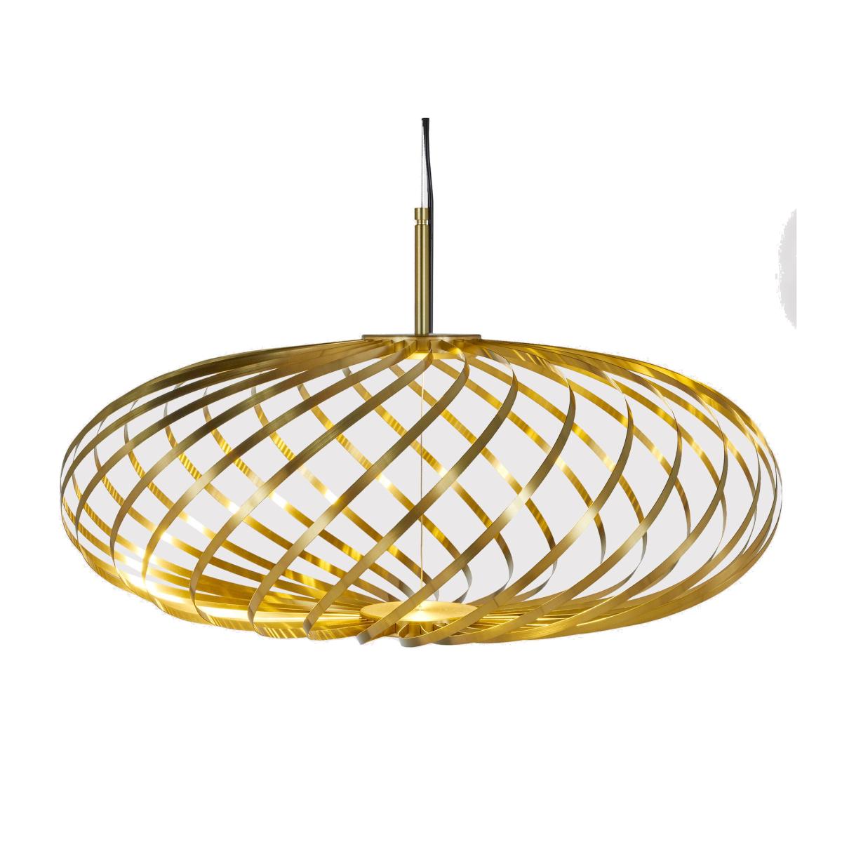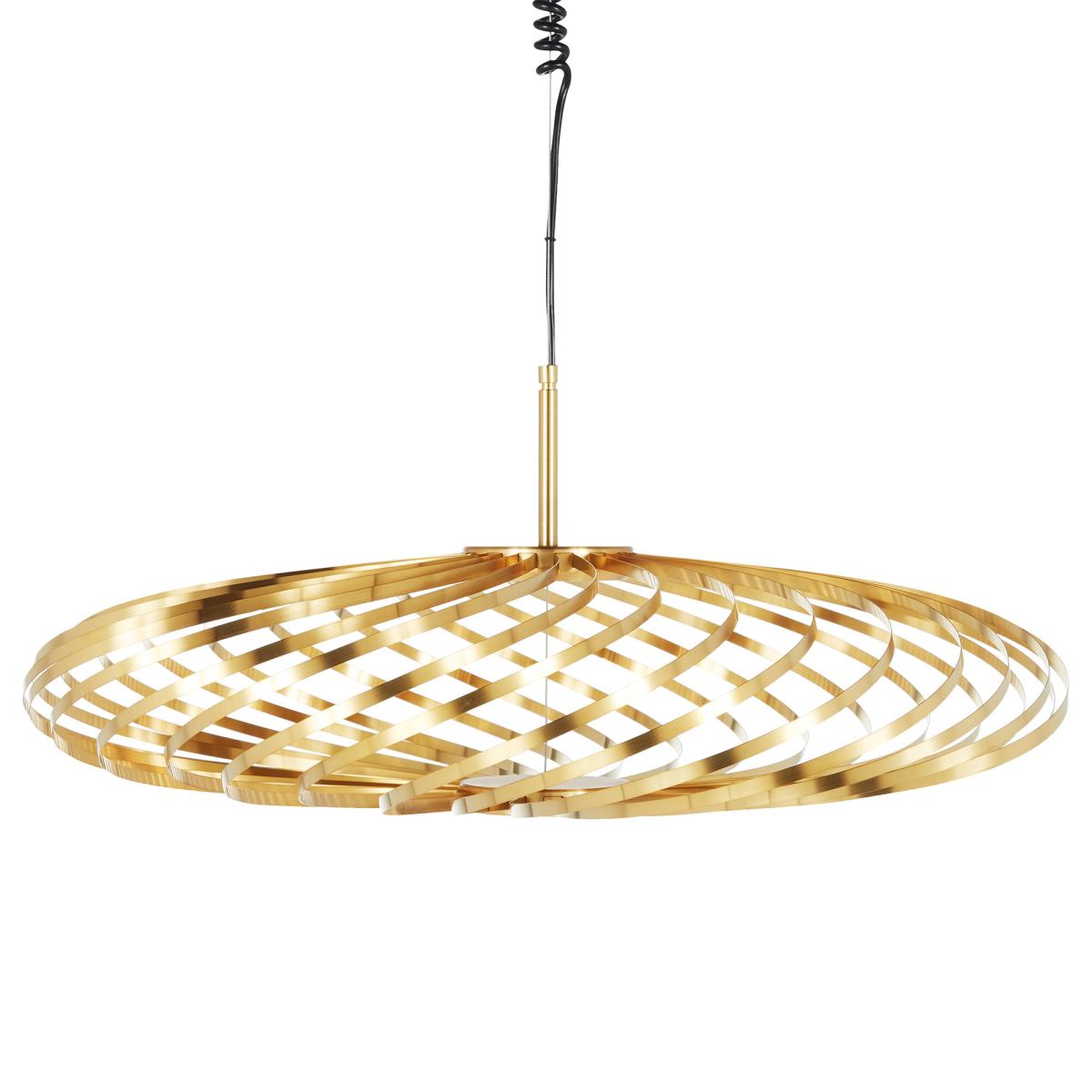 The Spring Brass Small Pendant Light is a stunning piece crafted from high-performance stainless steel bands, finished in brass. These pliant ribbons of stainless steel are artfully arranged around a custom-made dimmable Tom Dixon LED disc, reminiscent of a whisk's design. The semi-transparent shape created by this arrangement can be effortlessly adjusted to various silhouettes, offering versatility in lighting and aesthetics.