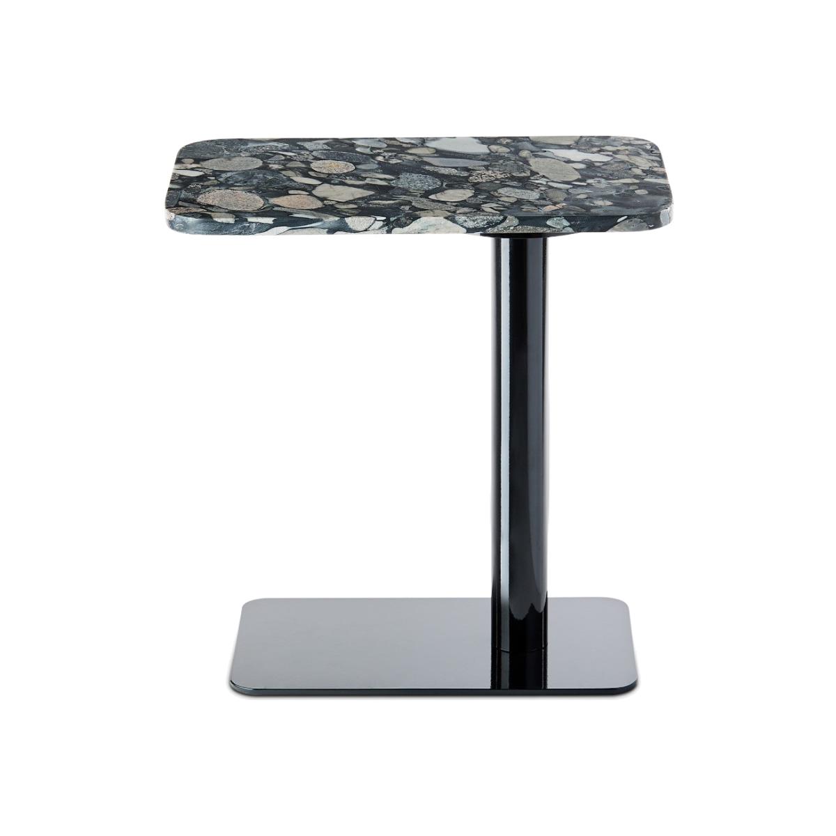 A modern rectangular side table, with a glossy black base and a stone top made of colourful marble mined from the Shandong and Fujian provinces of China. The pattern of the natural marble is due to the crustal movement changes in the process of lava extrusion, developed over millions of years.