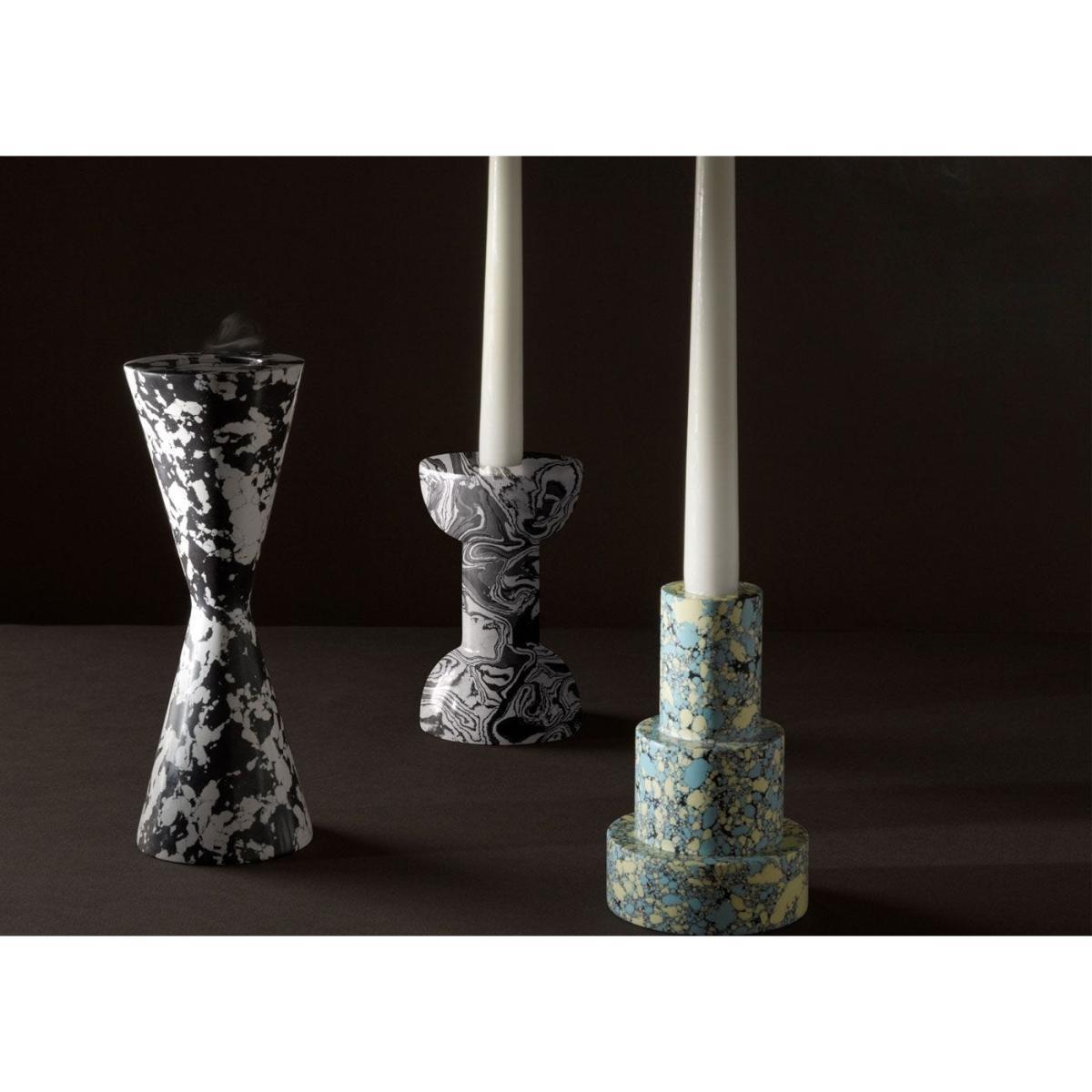 Swirl Cone is a candleholder with a distinct silhouette, colouration and personality. Substantial in weight, smooth in texture and bold in pattern, Swirl will inject a fresh pop sensibility into any setting. Made using recycled powdered marble residue, this scultpural candle holder is both decorative and functional. The unique process with which Swirl is made involves recycling the powdered residue from the marble industry, mixing it with pigment and resin to create blocks of material that can then be sawn, sliced and turned on a lathe. Due to the nature of the pigmentation, each piece features a unique pattern due to the pouring process.