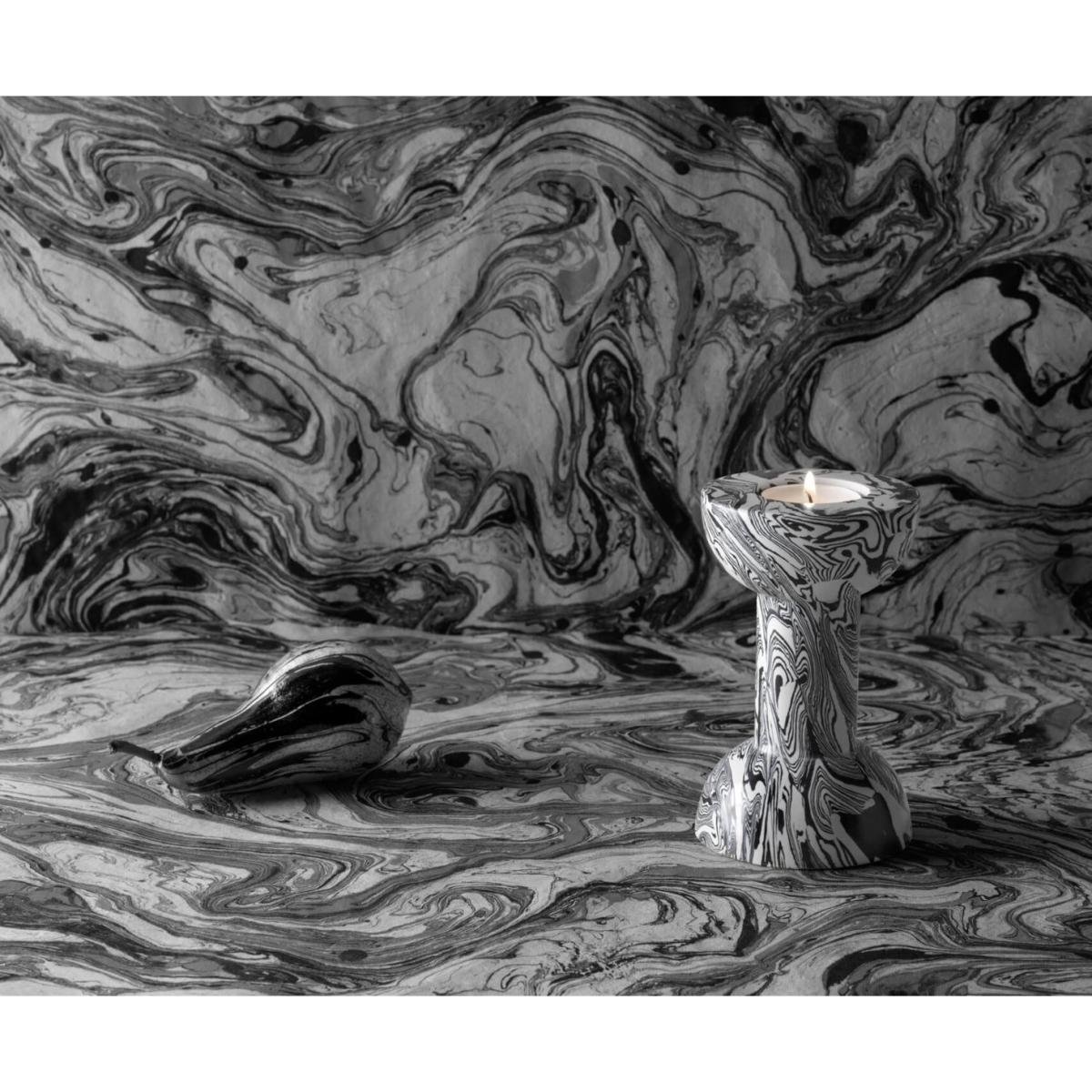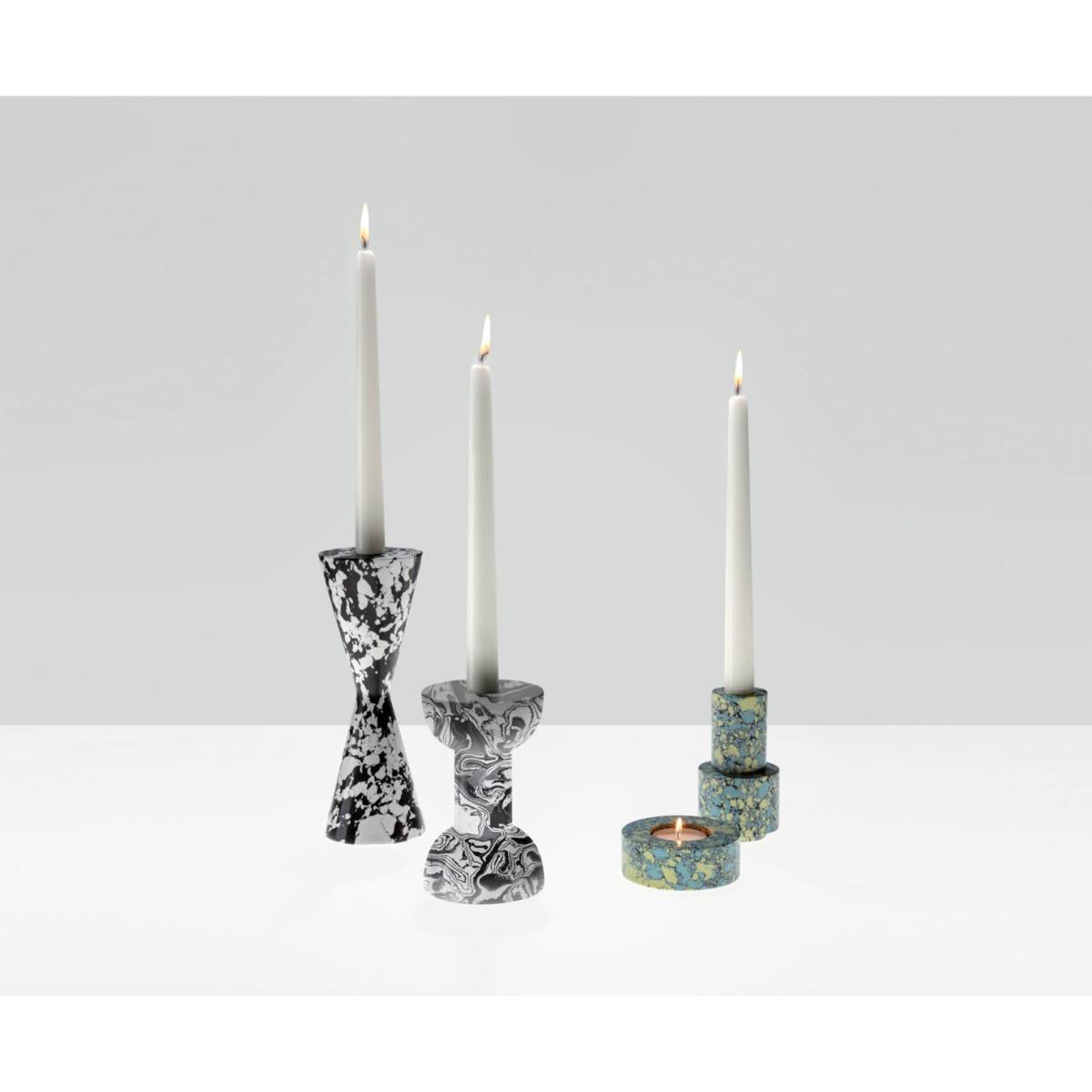 Swirl Dumbell is a monochromatic candleholder with a distinct silhouette, colouration and personality. Substantial in weight, smooth in texture and bold in pattern, Swirl will inject a fresh pop sensibility into any setting. Made using recycled powdered marble residue, this sculptural candle holder is both decorative and functional.