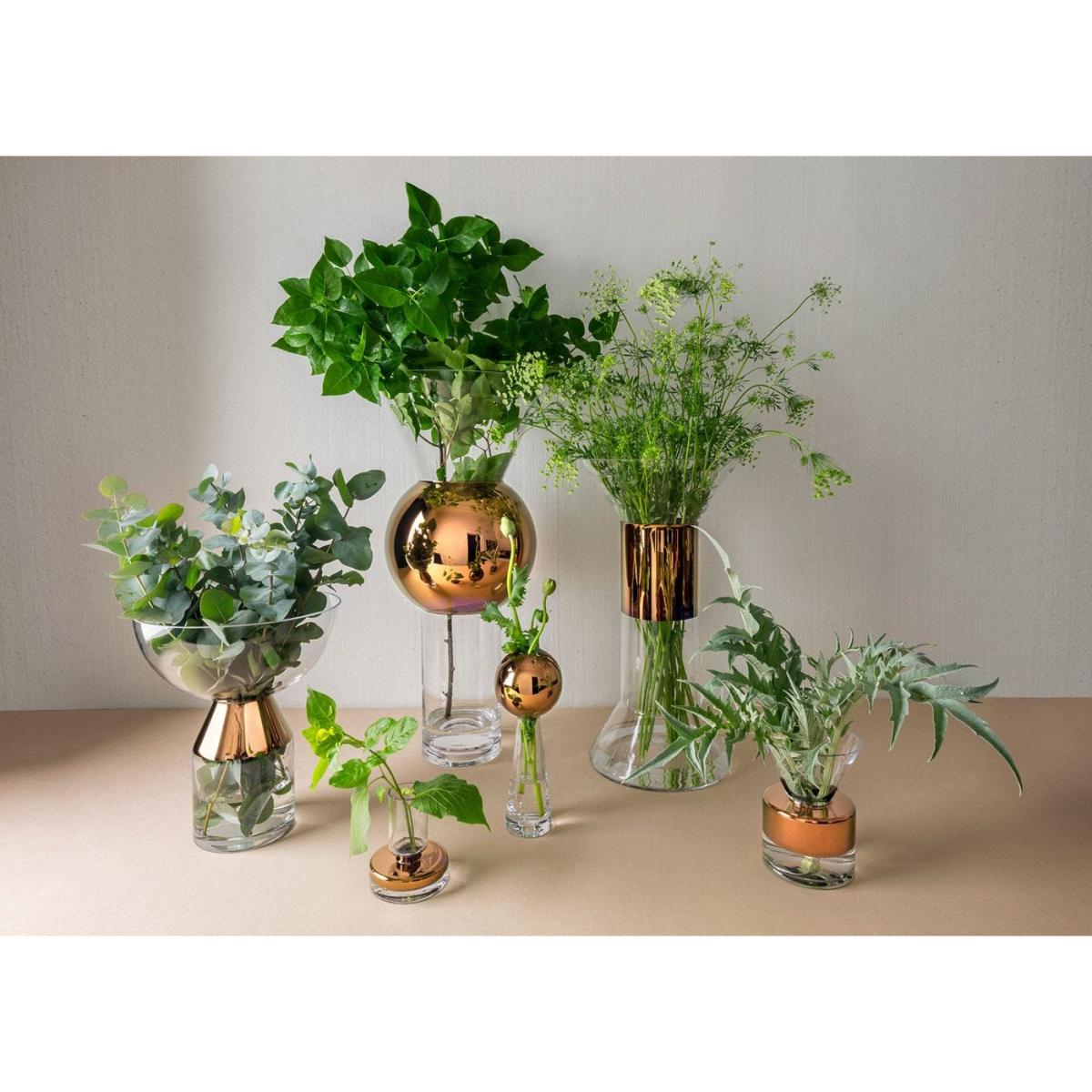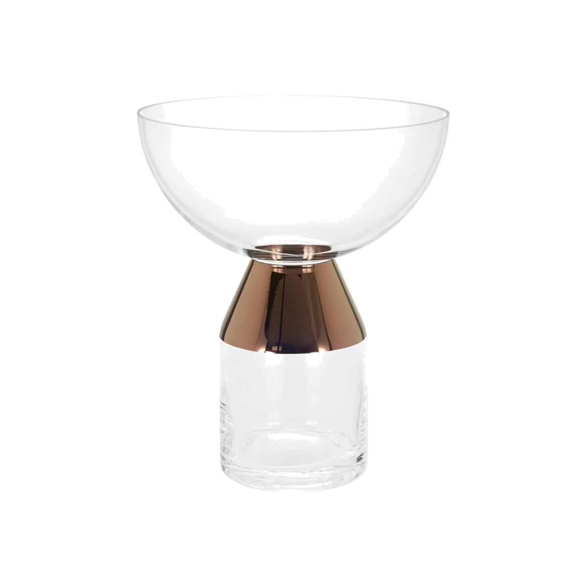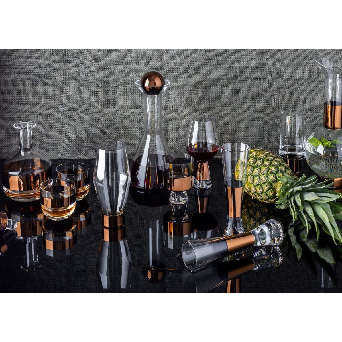 Characterised by a hand painted copper band, Tank takes its sculptural cue from the functional shapes and volumes of scientific glassware. Minimal yet decorative for a multiplicity of purposes of drinking, pouring, storing and displaying food and drink, the range forms bold building blocks of table-top architecture.