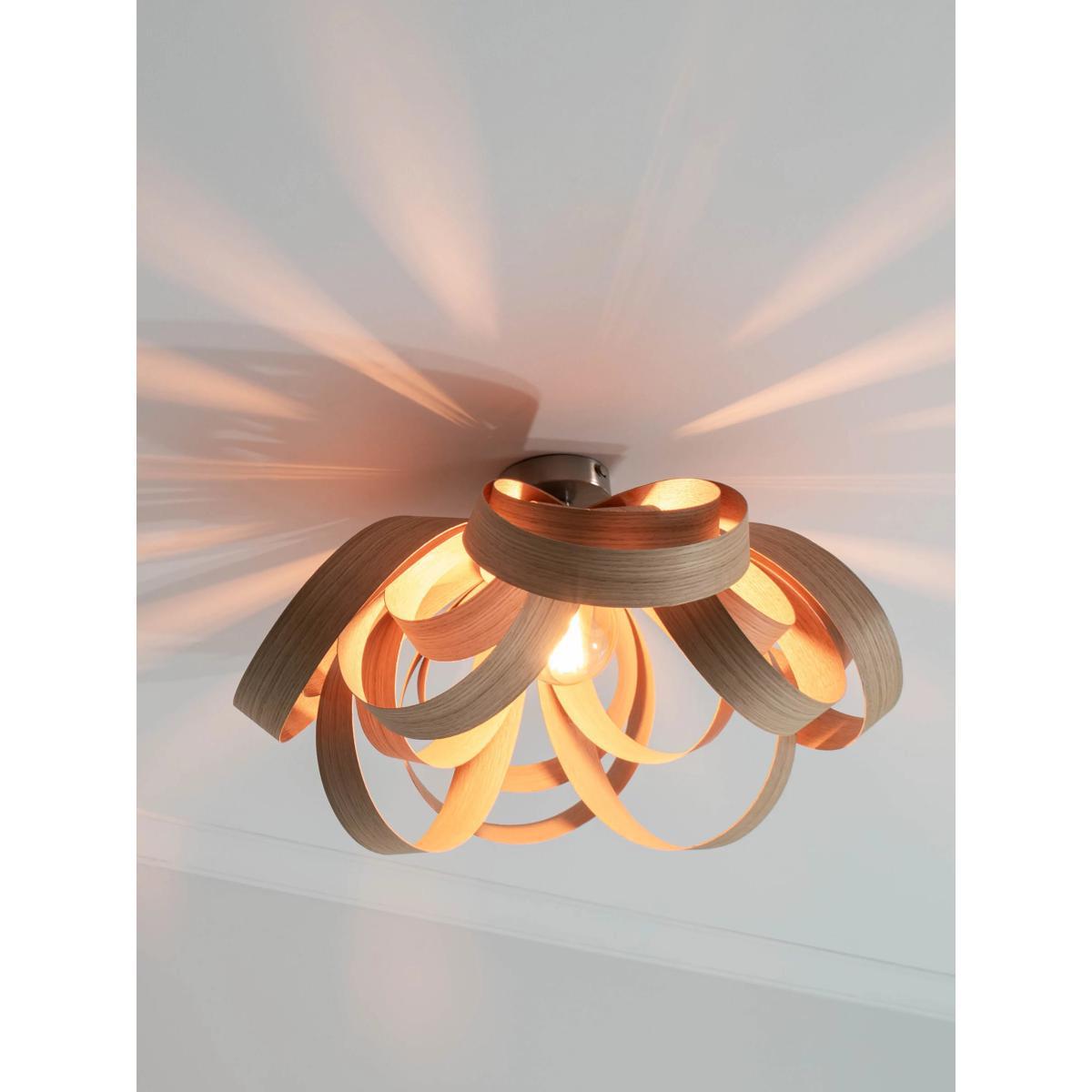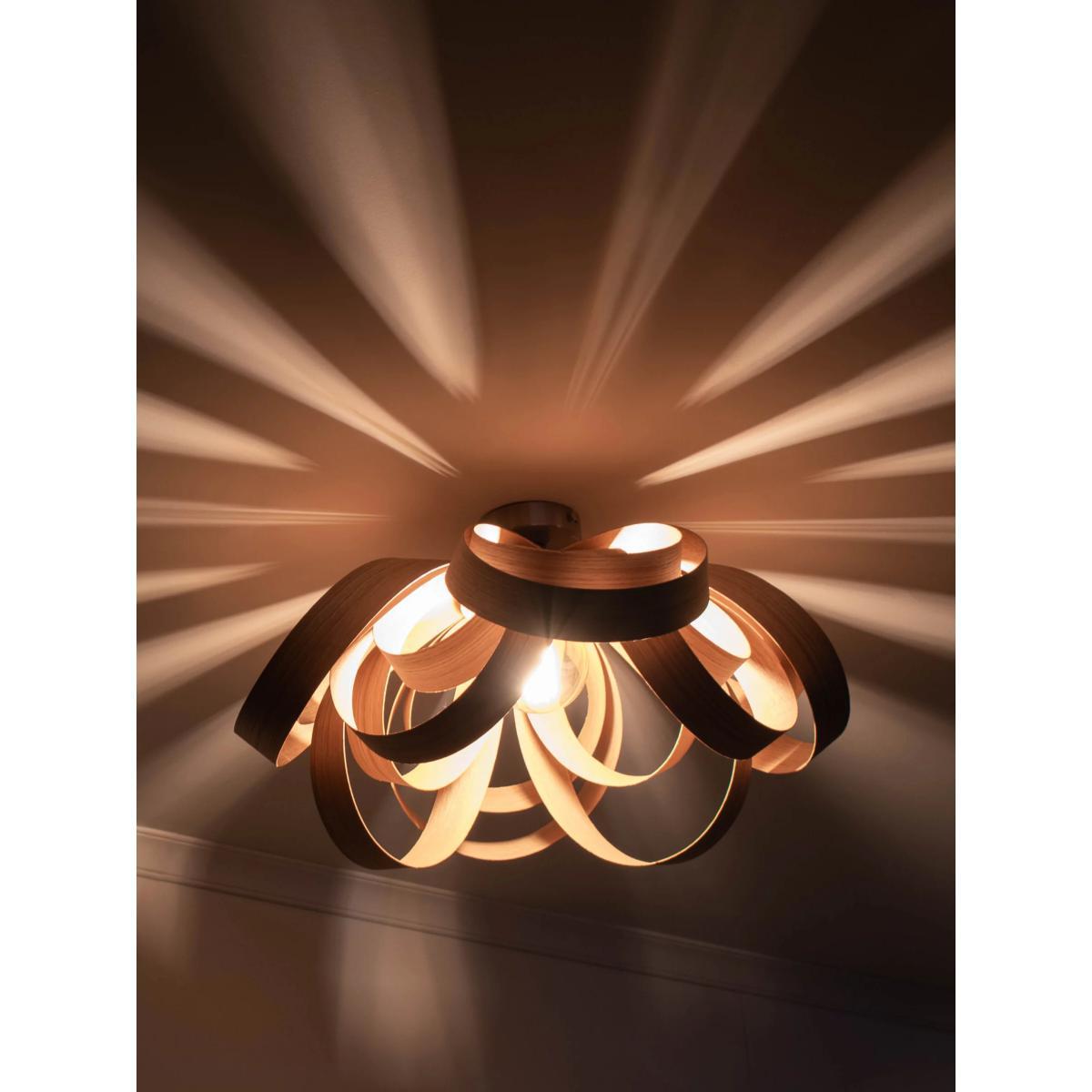 Made in the UK Fusing a Scandinavian-inspired design aesthetic with a modern and natural construction, the Skipper ceiling light from Tom Raffield offers a home lighting solution with statement appeal. With a smart, nickel ceiling rose, this semi-flush fitting is ideal for smaller rooms or low ceilings and it's made from sustainably-sourced oak or walnut wood. Formed into Raffield's signature steam-bent, curved design, light glows from the centre and spills through the gaps in each of the ribbons, casting an eye-catching wash of light on the ceiling and around your room with warm shadows. This light has been individually handcrafted by a skilled workshop team. It has a subtle water-based satin varnish coating which provides an easy-care and durable finish without compromising on the natural beauty of the wood grain.