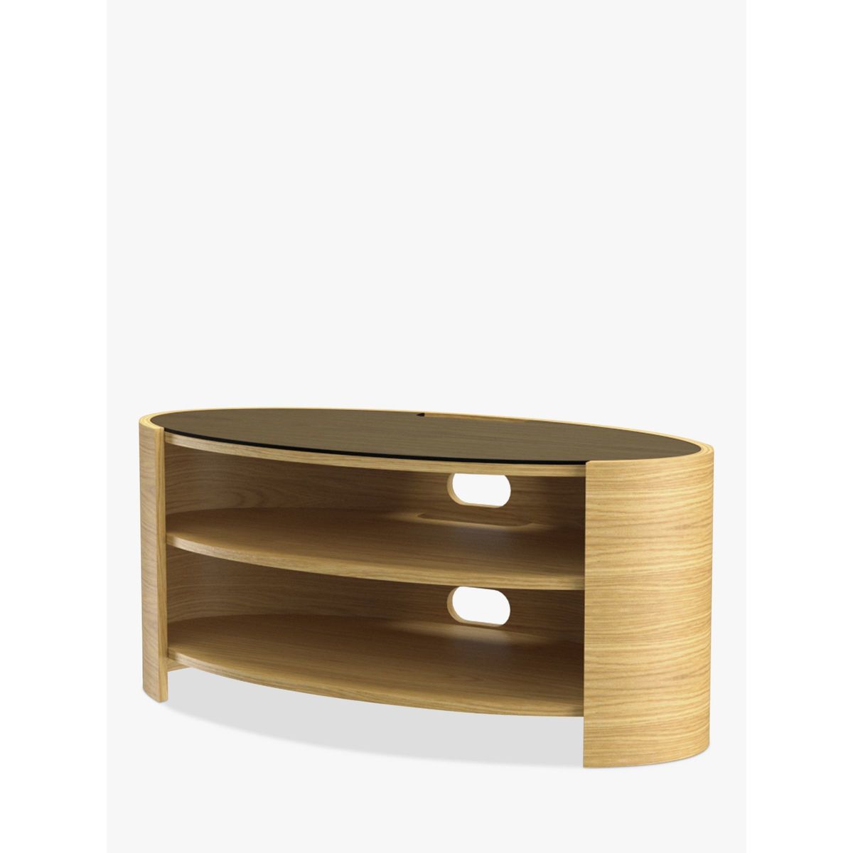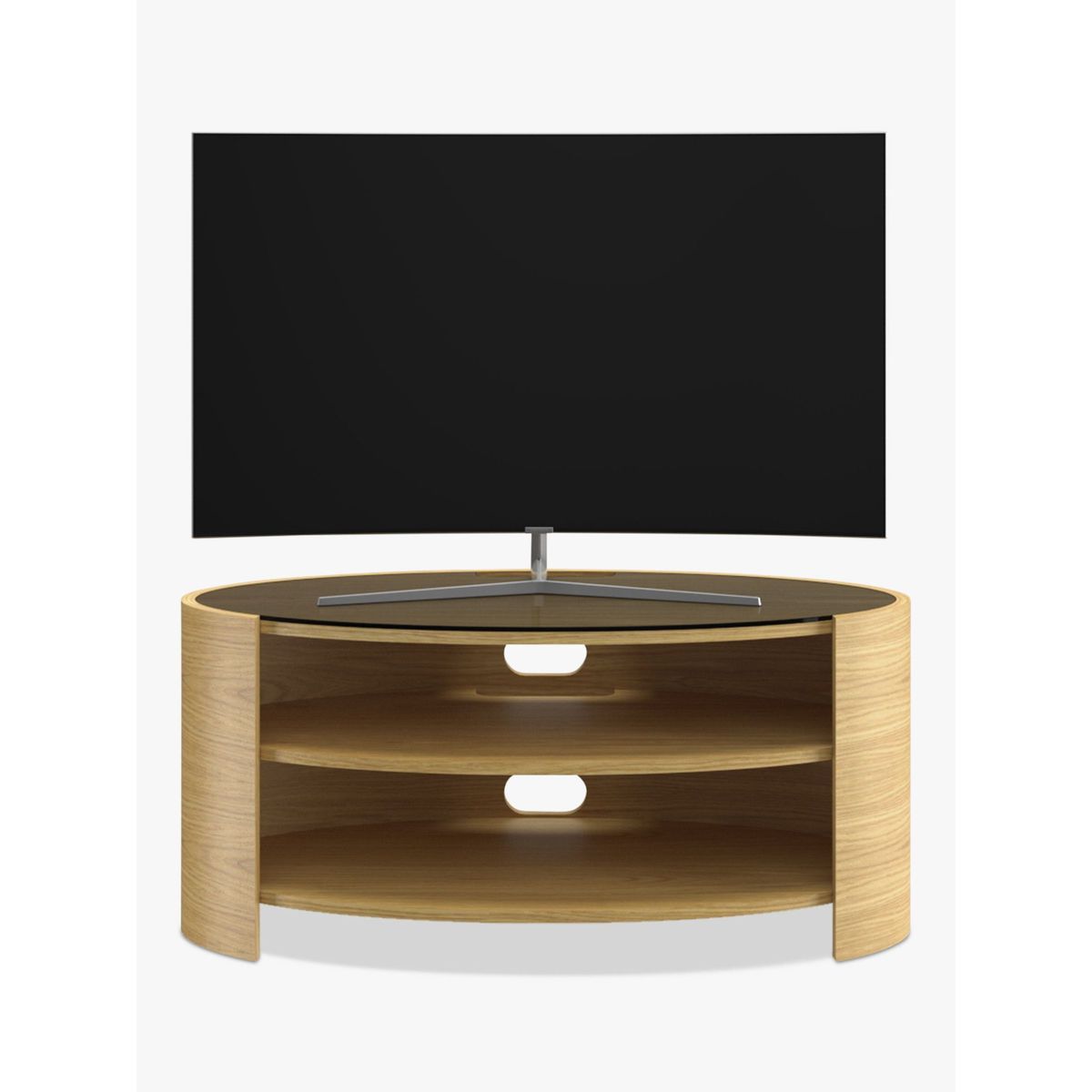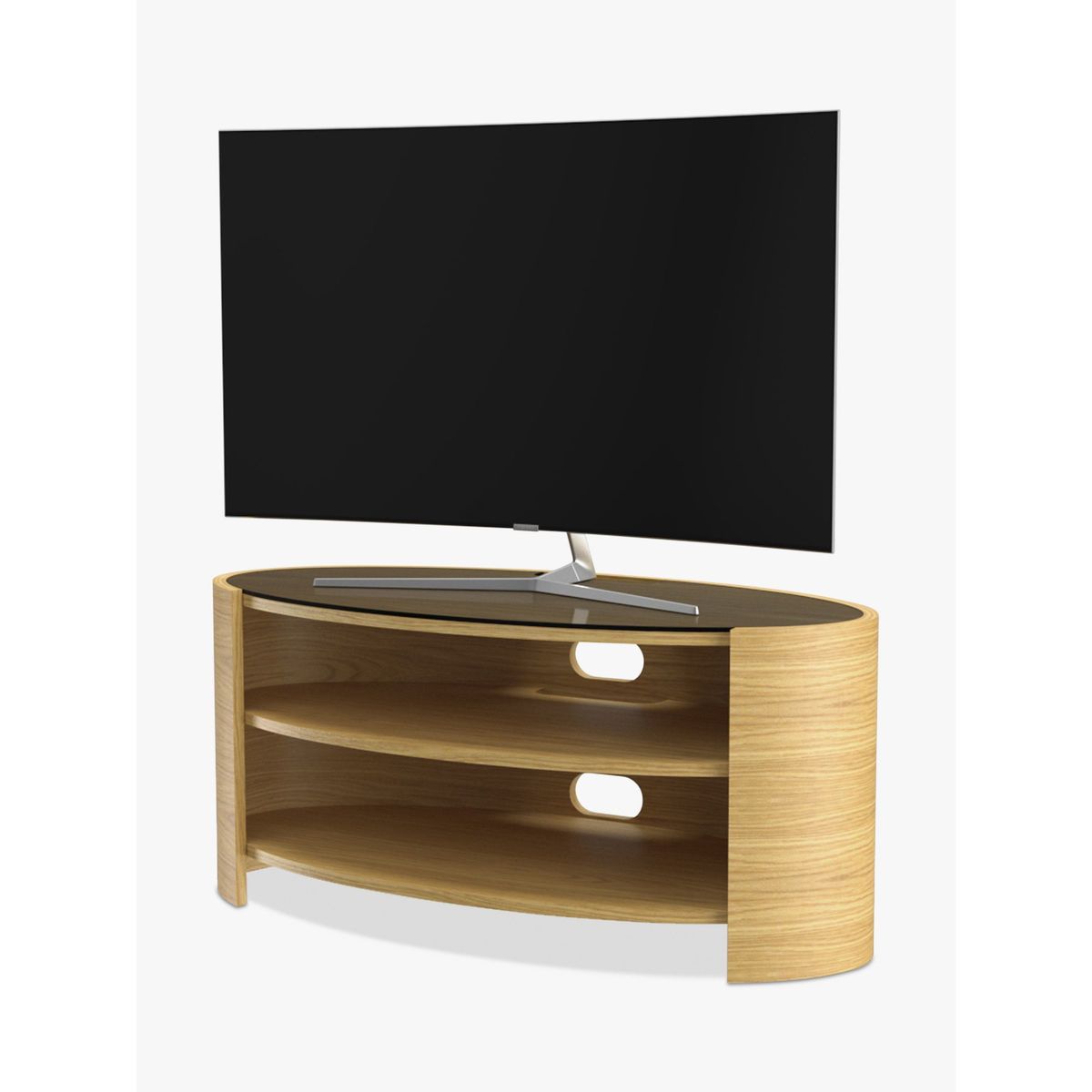 With simple and elegant design, the curvaceous, open elliptical shape of the Elliptic Deluxe unit has an organic quality that will contrast beautifully with the straight lines of your TV. It makes a naturally beautiful home for all your home AV equipment. The stylish design is complemented by a toughened glass top and includes practical benefits: full cable management features keep wires seamlessly hidden from view, while built in ventilation ensures free circulation of air around your tech equipment. The central shelf is adjustable and provides an ideal home for a sound bar. It can also be positioned in corners to be compatible with a wide variety of living spaces. Handmade British design Natural wood veneer for uniqueness and beauty Maximum weight: 35kg Shelf depth: 42cm Delivered fully assembled Please note: Any maximum TV size quoted is a recommendation only and the exact dimensions of the TV's pedestal/feet should be checked to ensure it fits prior to purchase.