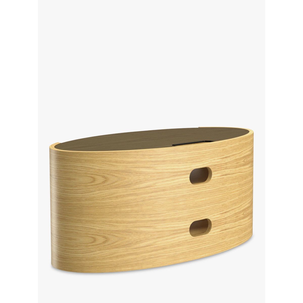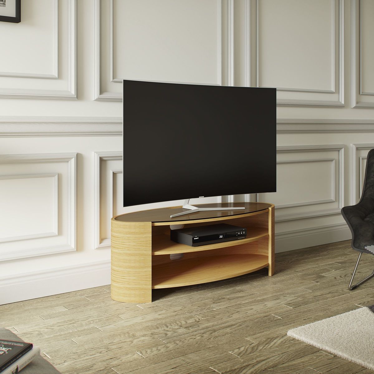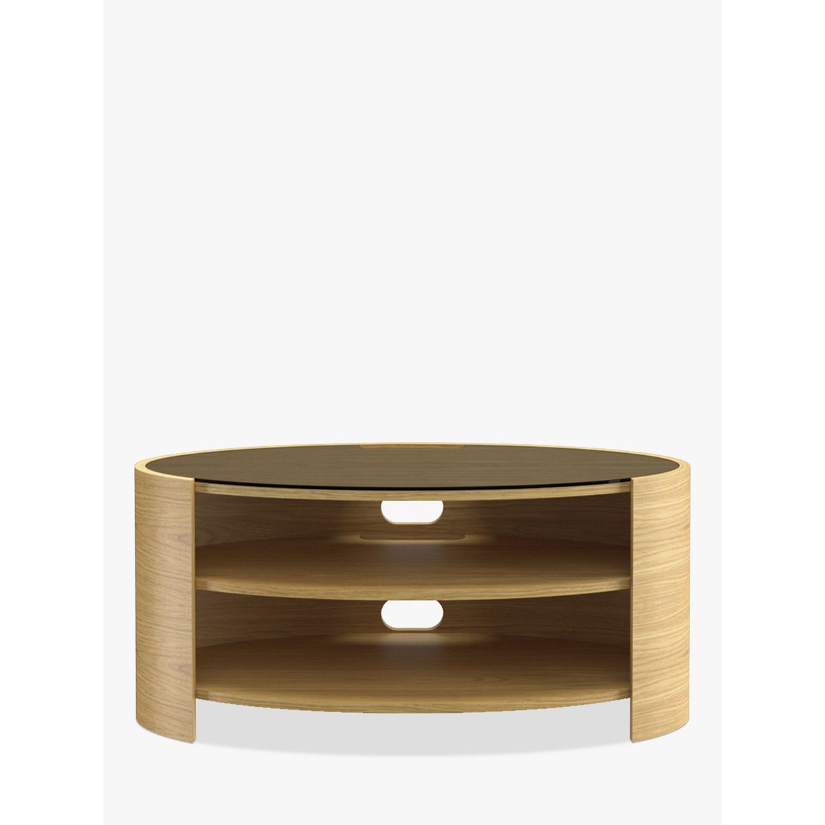 With simple and elegant design, the curvaceous, open elliptical shape of the Elliptic Deluxe unit has an organic quality that will contrast beautifully with the straight lines of your TV. It makes a naturally beautiful home for all your home AV equipment. The stylish design is complemented by a toughened glass top and includes practical benefits: full cable management features keep wires seamlessly hidden from view, while built in ventilation ensures free circulation of air around your tech equipment. The central shelf is adjustable and provides an ideal home for a sound bar. It can also be positioned in corners to be compatible with a wide variety of living spaces. Handmade British design Natural wood veneer for uniqueness and beauty Maximum weight: 35kg Shelf depth: 42cm Delivered fully assembled Please note: Any maximum TV size quoted is a recommendation only and the exact dimensions of the TV's pedestal/feet should be checked to ensure it fits prior to purchase.