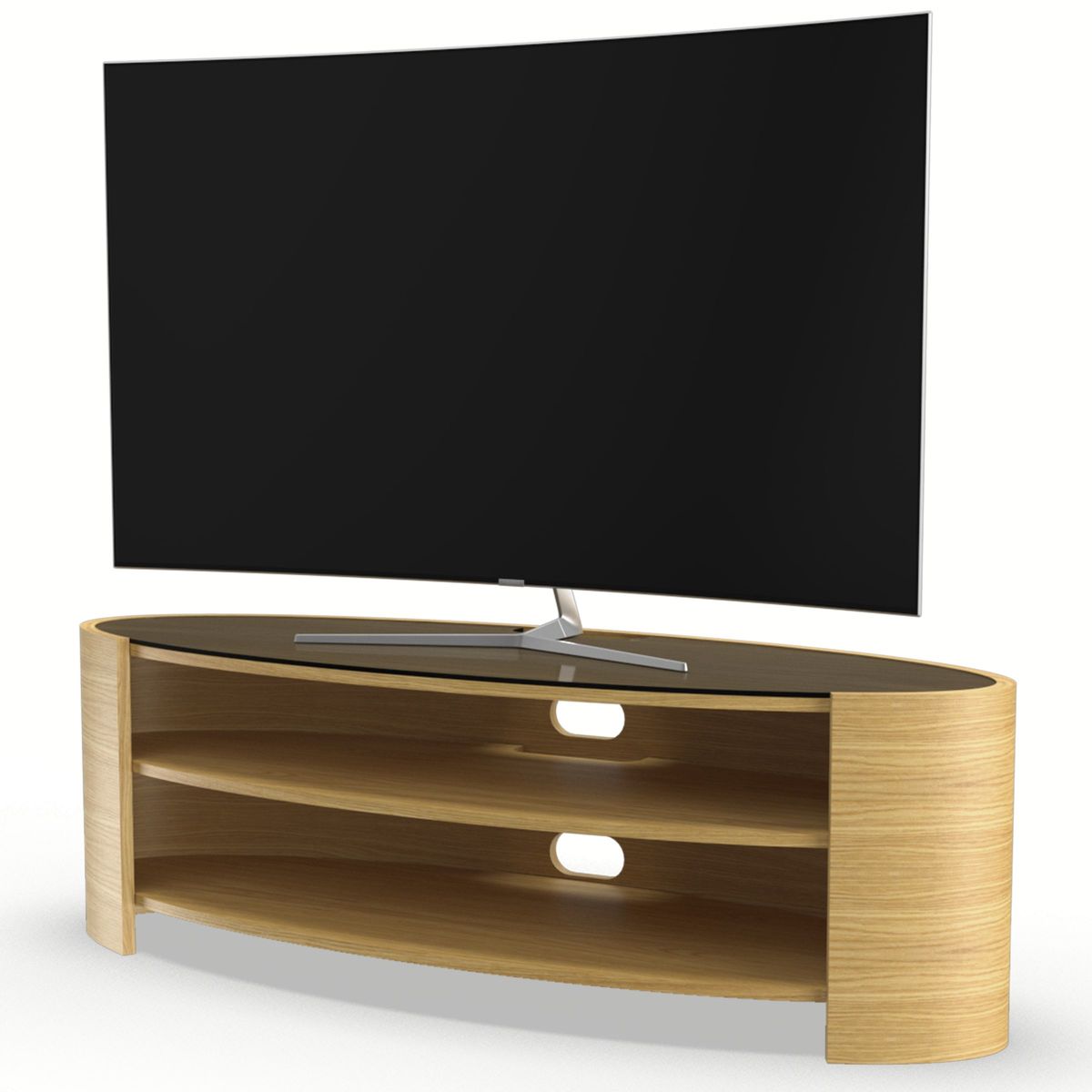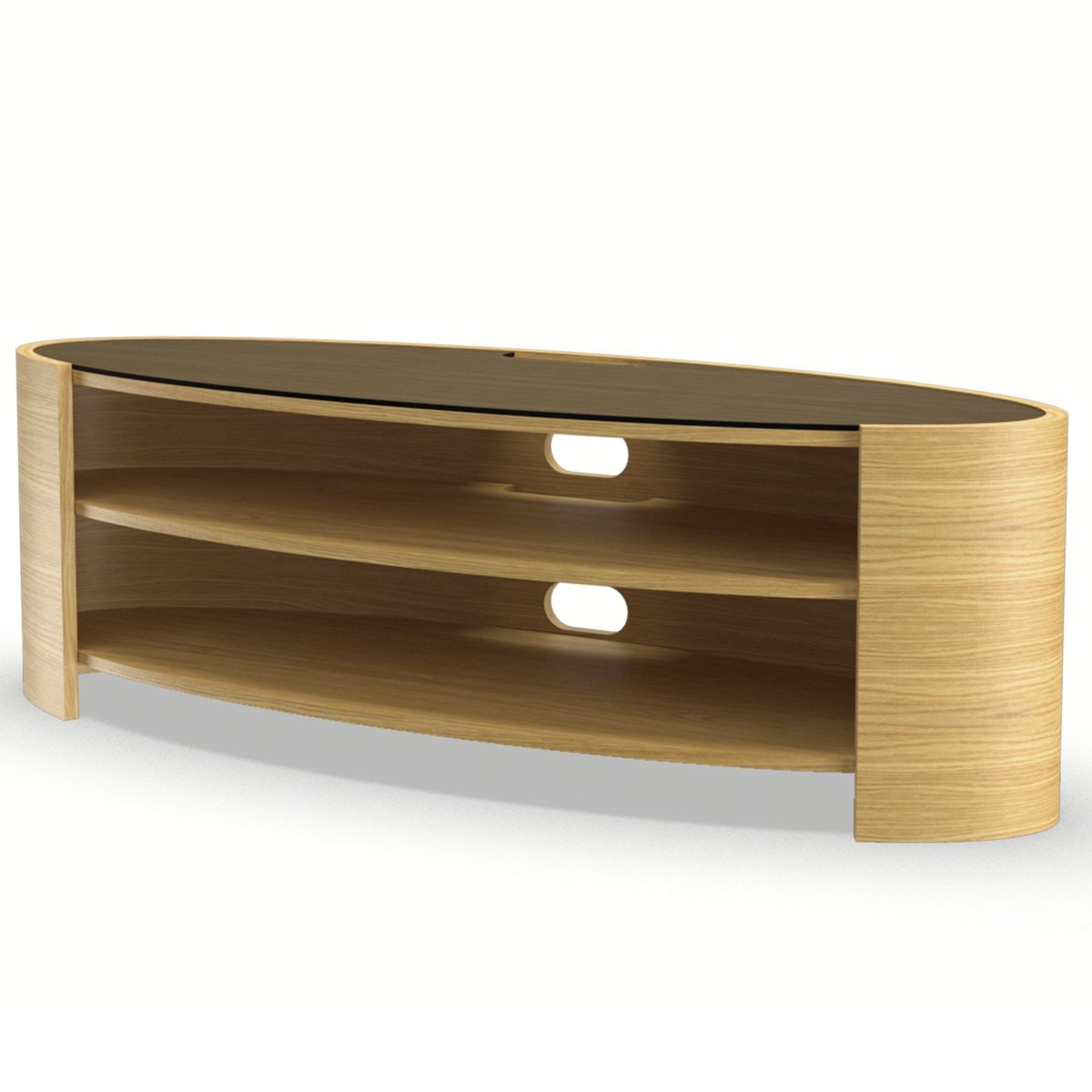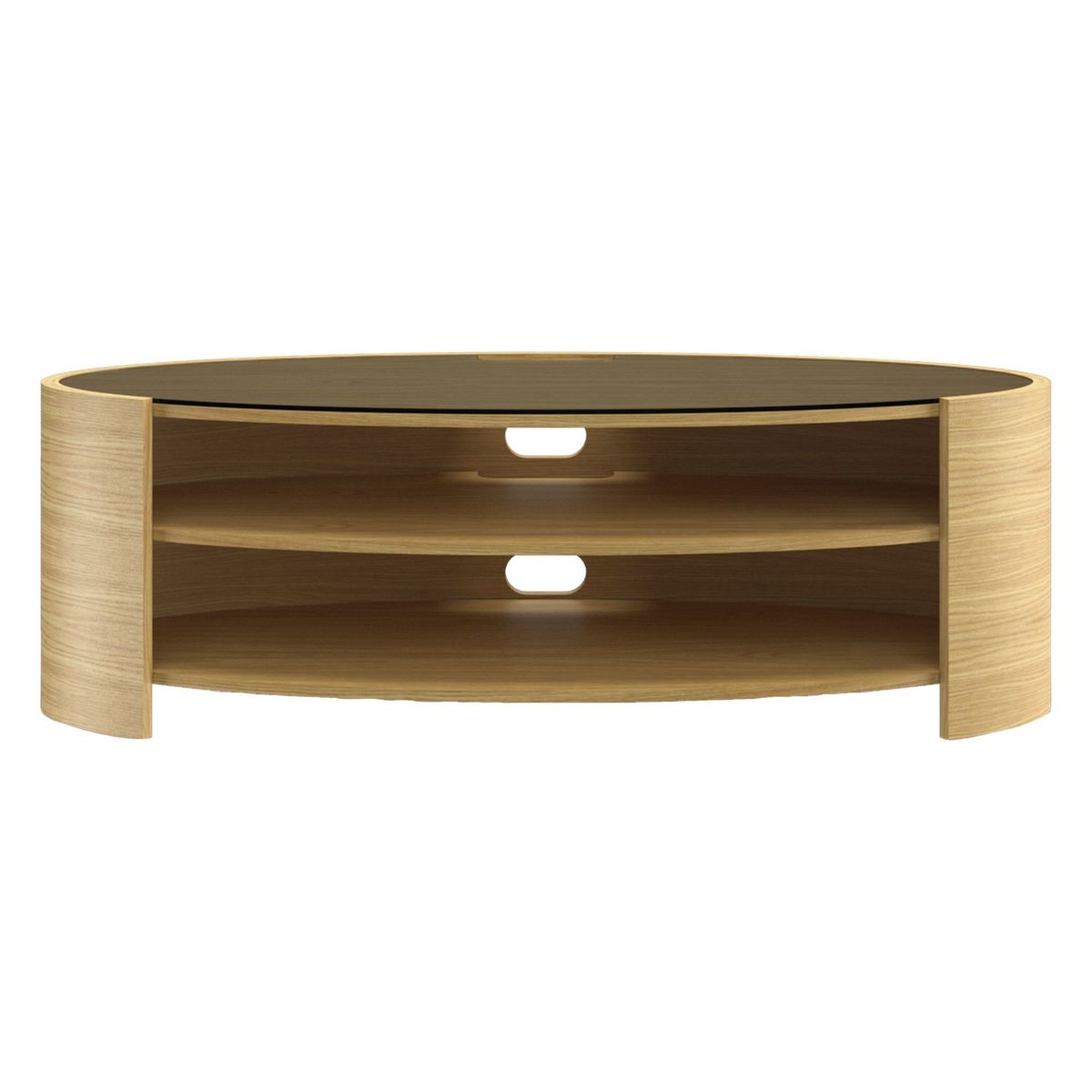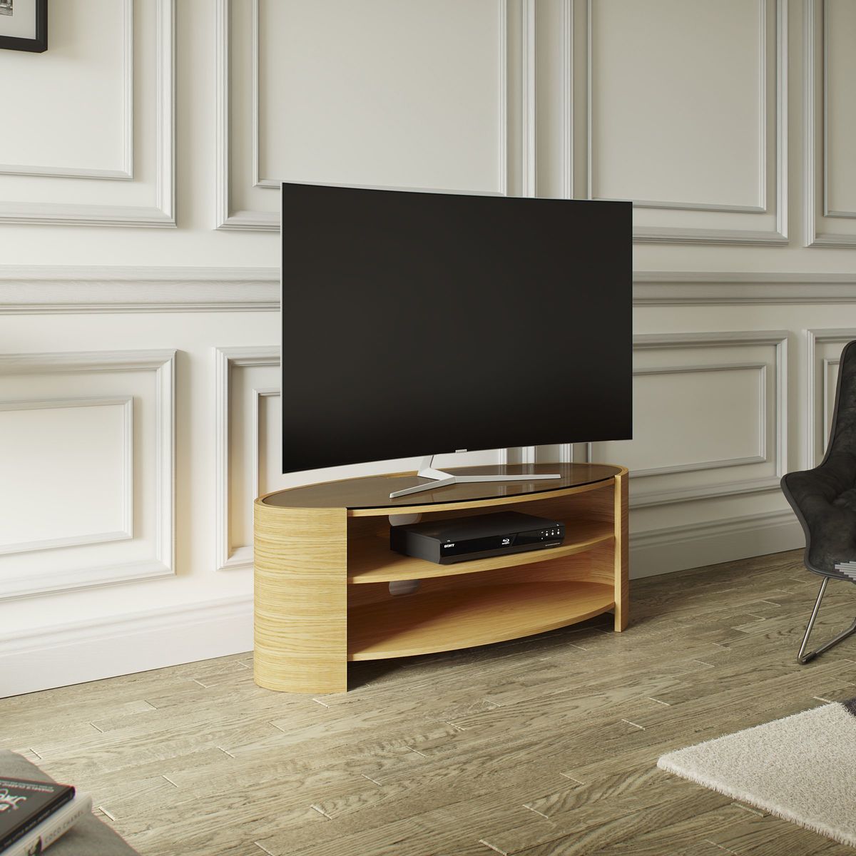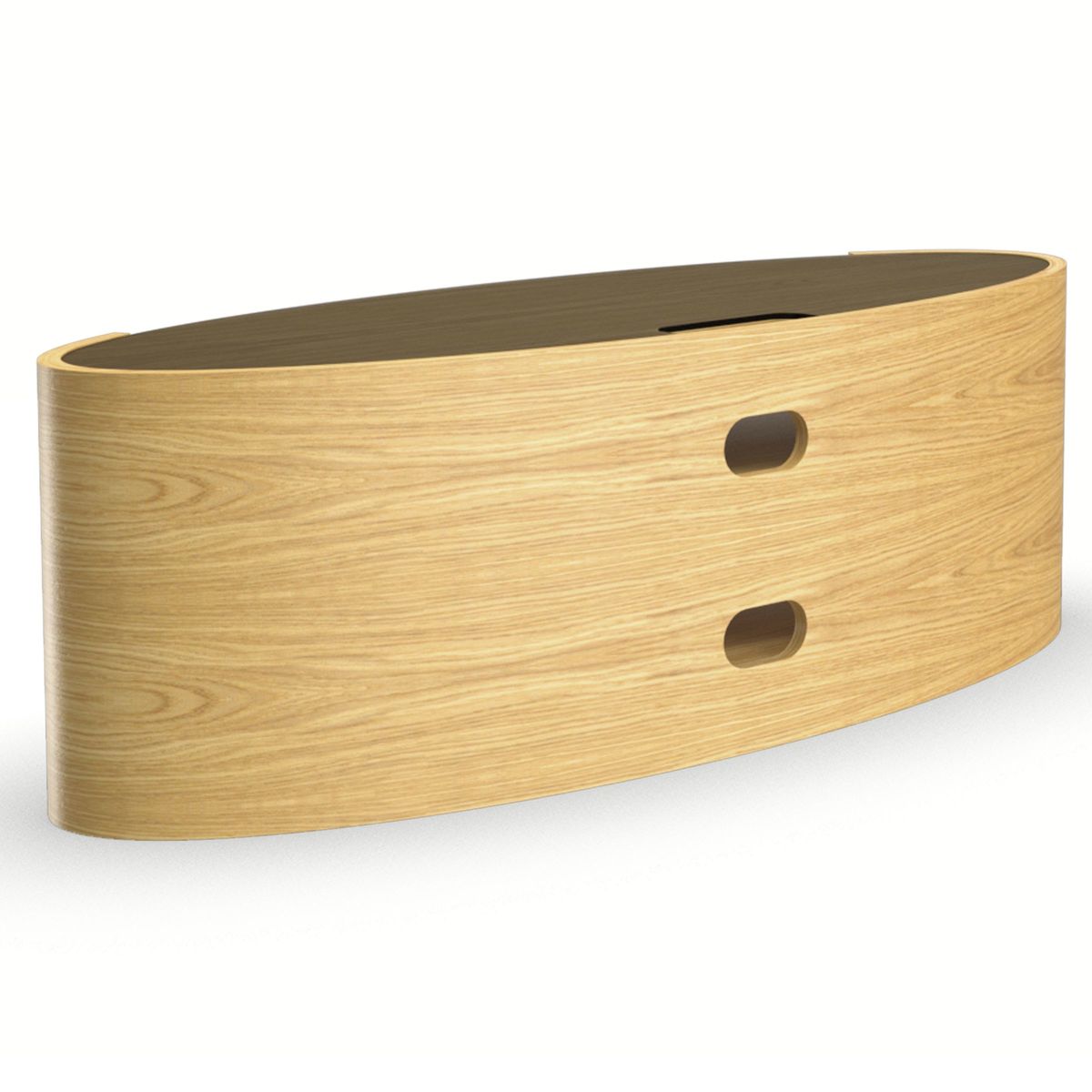 With simple and elegant design, the curvaceous, open elliptical shape of the Elliptic Deluxe unit has an organic quality that will contrast beautifully with the straight lines of your TV. It makes a naturally beautiful home for all your home AV equipment. The stylish design is complemented by a toughened glass top and includes practical benefits: full cable management features keep wires seamlessly hidden from view, while built in ventilation ensures free circulation of air around your tech equipment. The central shelf is adjustable and provides an ideal home for a sound bar. It can also be positioned in corners to be compatible with a wide variety of living spaces. Handmade British design Natural wood veneer for uniqueness and beauty Maximum weight: 45kg Shelf depth: 46cm Delivered fully assembled Please note: Any maximum TV size quoted is a recommendation only and the exact dimensions of the TV's pedestal/feet should be checked to ensure it fits prior to purchase.