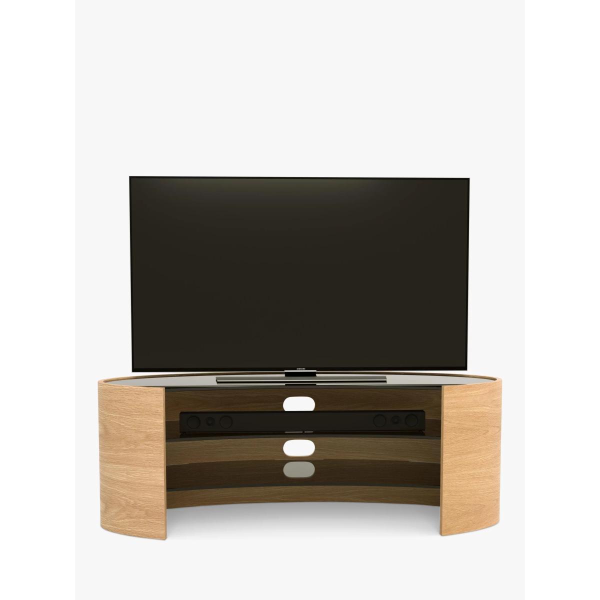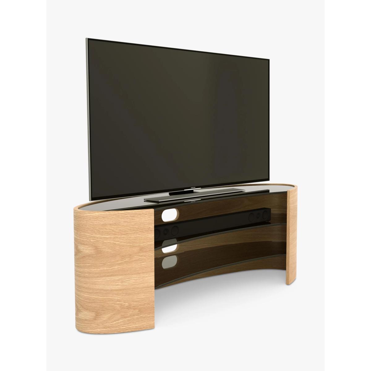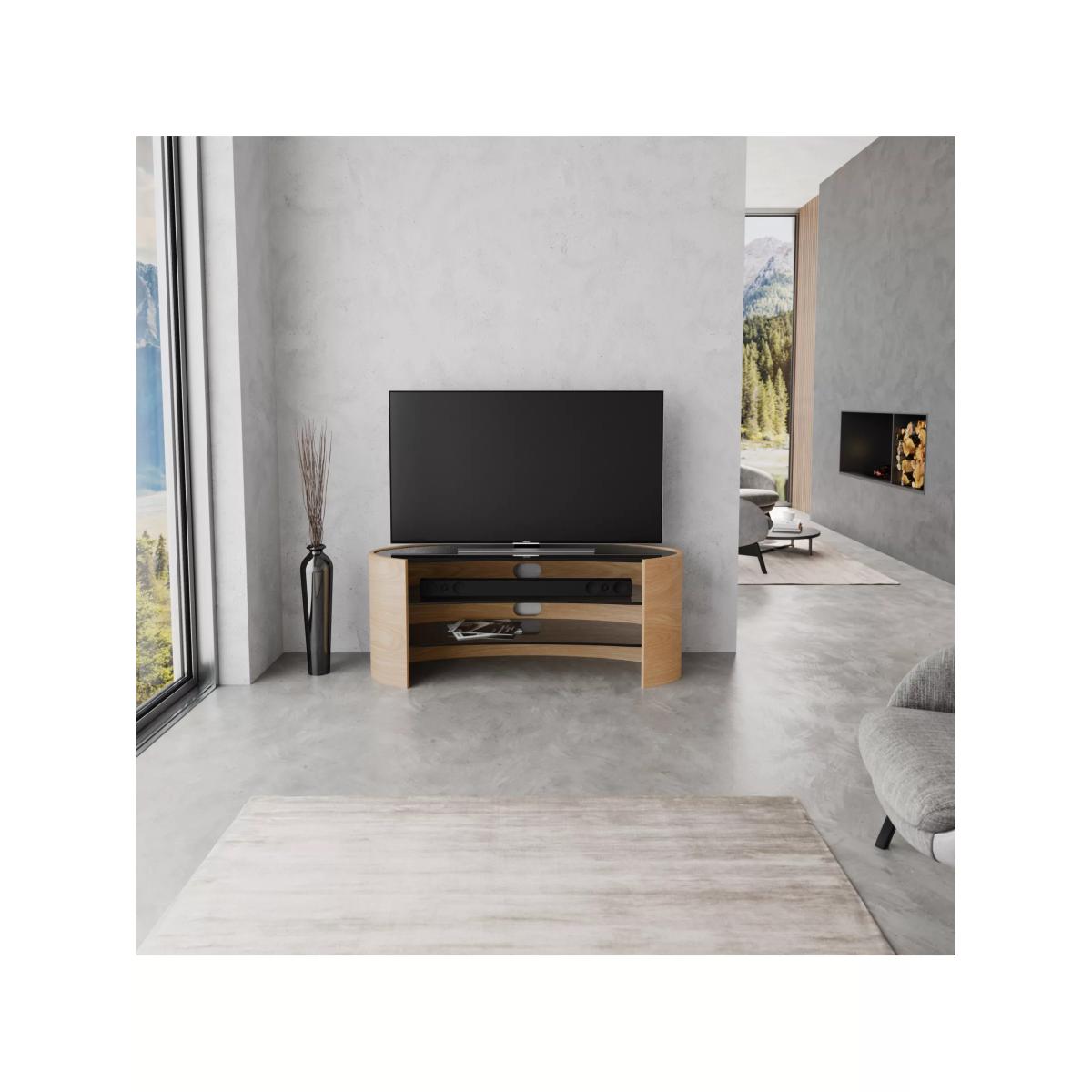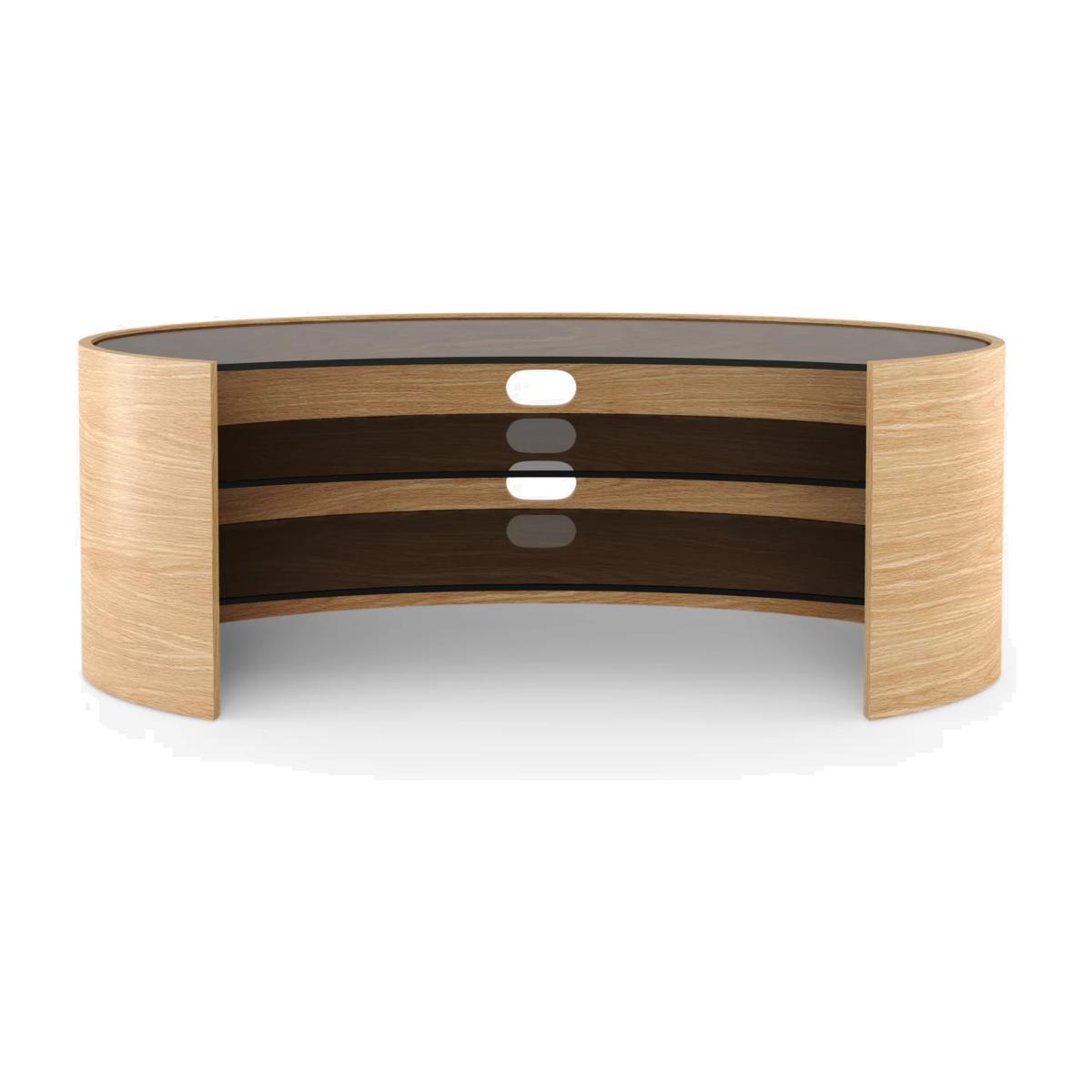 The sublime rolling curve of the Elliptical Home Theatre unit makes it perfect for curved TV screens. It makes an elegant and classically minimal base for your home media set-up. The warmth of the wood is harmoniously contrasted with adjustable smoked glass shelves, providing enough space for a soundbar and audio visual equipment. This attractive unit can be incorporated into any contemporary space, including in the corner of the room. Handmade British design Natural wood veneer for uniqueness and beauty Maximum shelf weight: 35kg Shelf depth: 44.2cm Delivered fully assembled Please note: Any maximum TV size quoted is a recommendation only and the exact dimensions of the TV's pedestal/feet should be checked to ensure it fits prior to purchase.