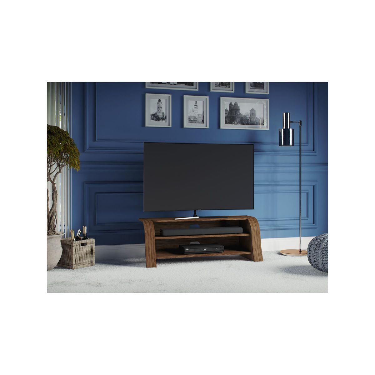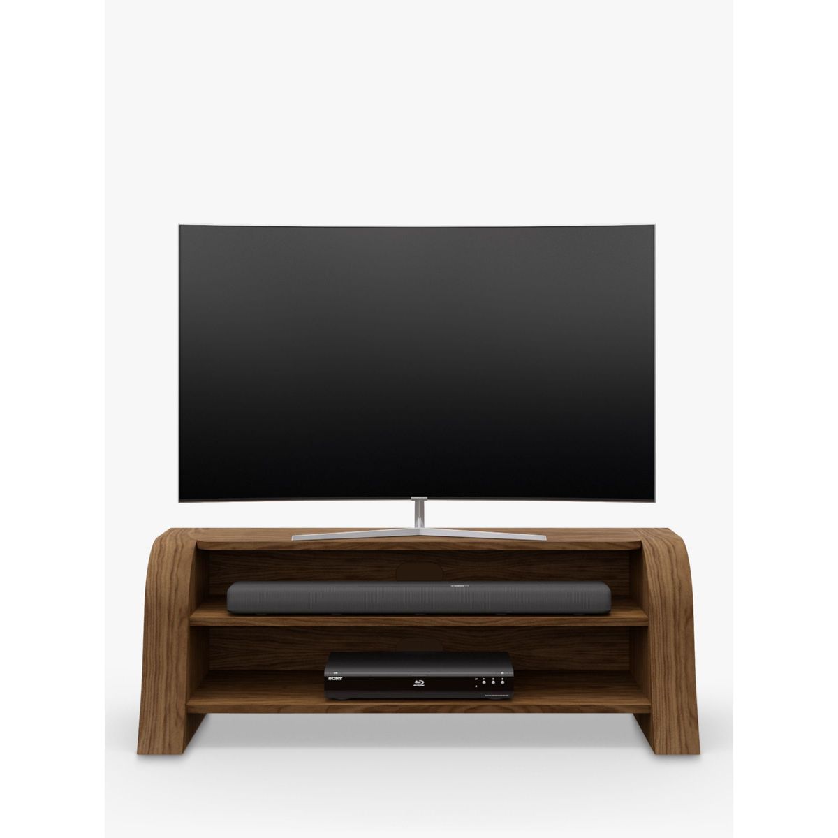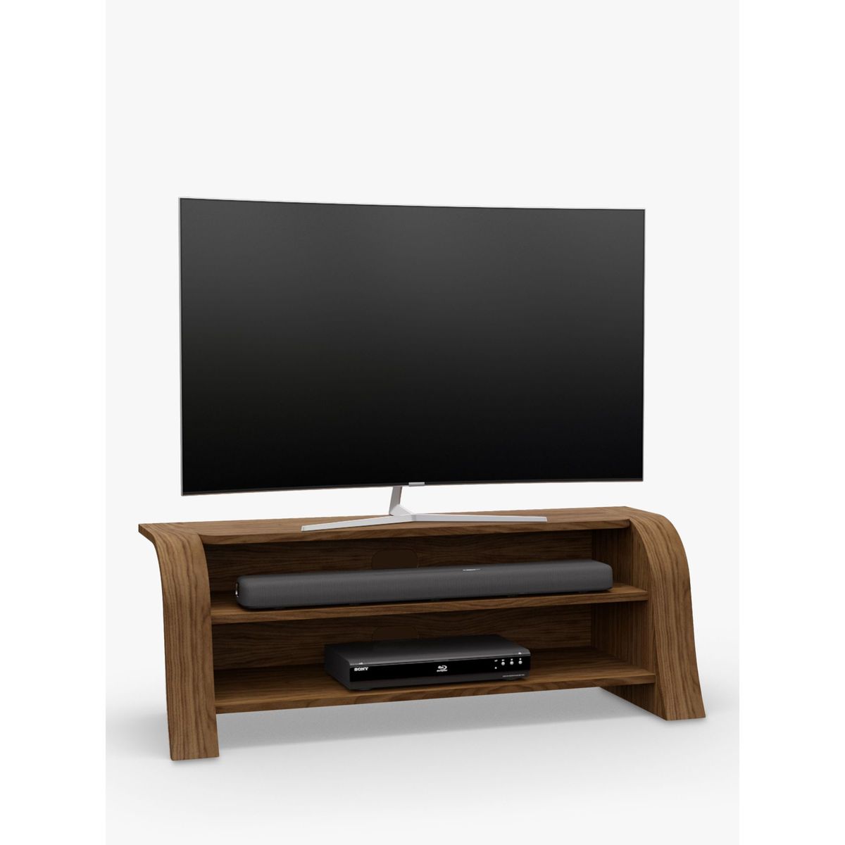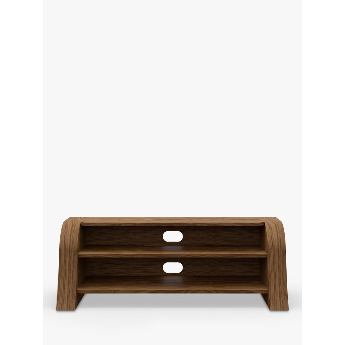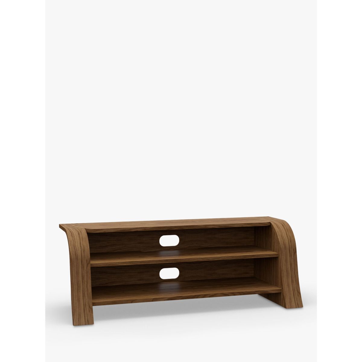 With delightful and contemporary design, the Lexi media unit's striking, curved shape invokes the meandering flow of water. Open shelves give it a minimalist appearance while offering ample storage space for media units. It's designed with a set-back top which enables sound bars to project sound freely and unencumbered, while cable management keeps connecting wires tidy and hidden from view. Handmade British design Natural wood veneer for uniqueness and beauty Maximum shelf weight: 40kg Shelf depth: 36.5cm Designed for sound bars Delivered fully assembled Any maximum TV size quoted is a recommendation only and the exact dimensions of the TV's pedestal/feet should be checked to ensure it fits prior to purchase.
