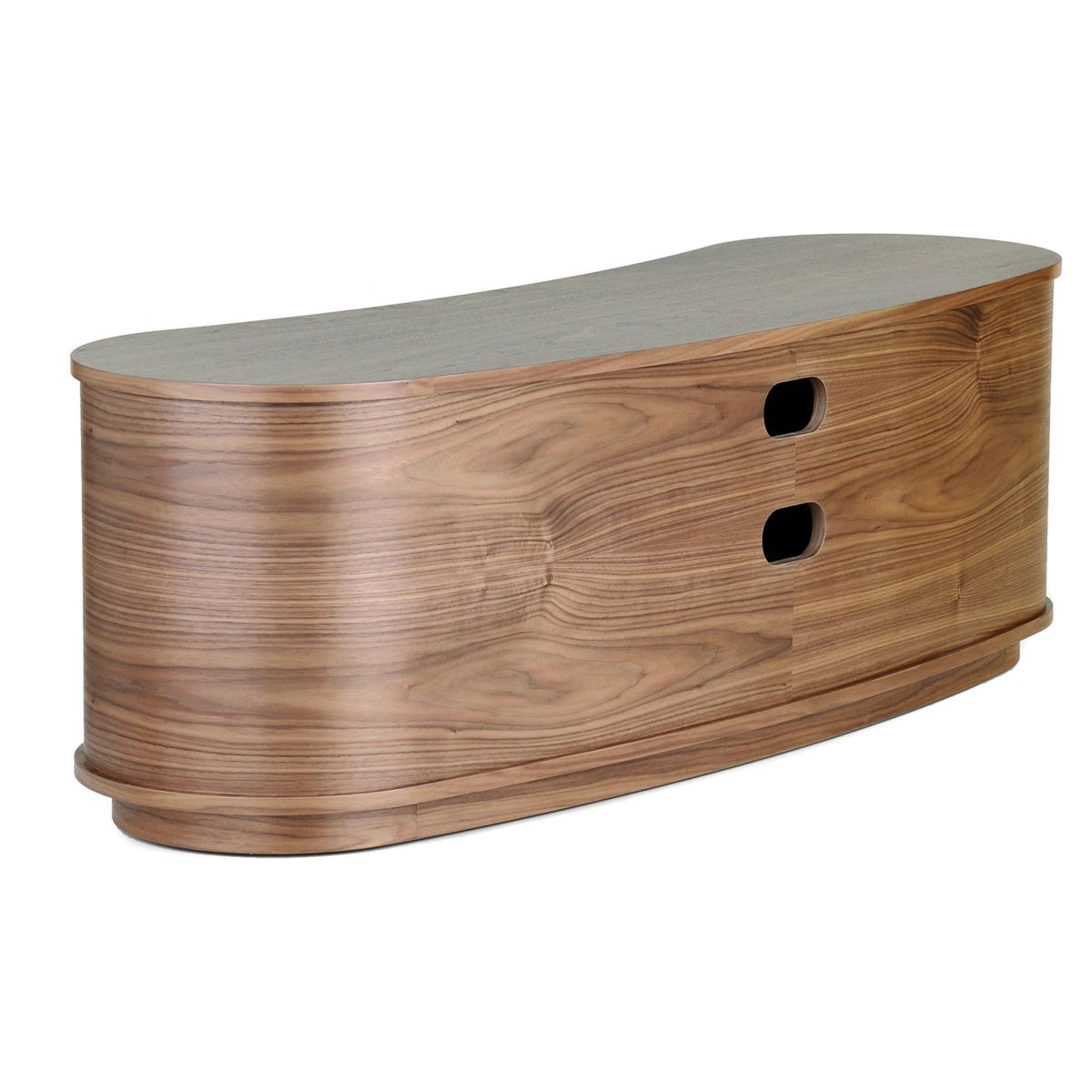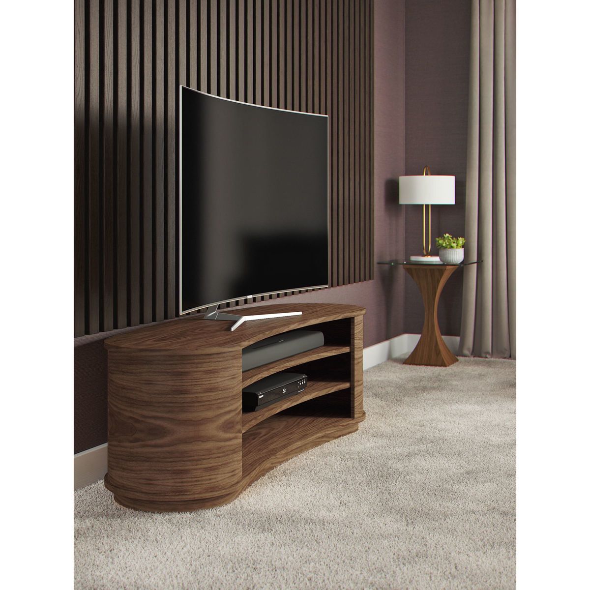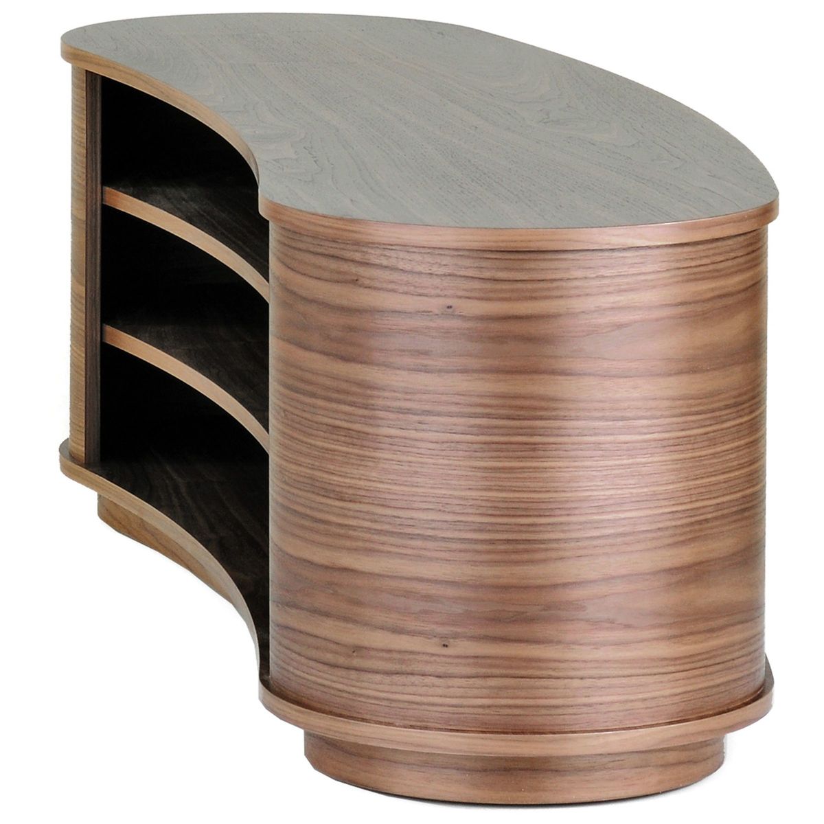 A wonderfully playful yet practical design, the Radius Home Theatre's elegant curve at the front flows through the sides and is mirrored at the back, giving this unit an all round radiating wow factor. It makes an elegant and classically minimal base for your home media set-up. The fixed shelving provides space for a sound bar and your audio-visual equipment, it's a modern option that perfectly balances style with practicality. Cable management features keep wires tidy and hidden from view. Handmade British design Natural wood veneer for uniqueness and beauty Maximum shelf weight: 50kg Shelf depth: 38cm Delivered fully assembled Please note: Any maximum TV size quoted is a recommendation only and the exact dimensions of the TV's pedestal/feet should be checked to ensure it fits prior to purchase.