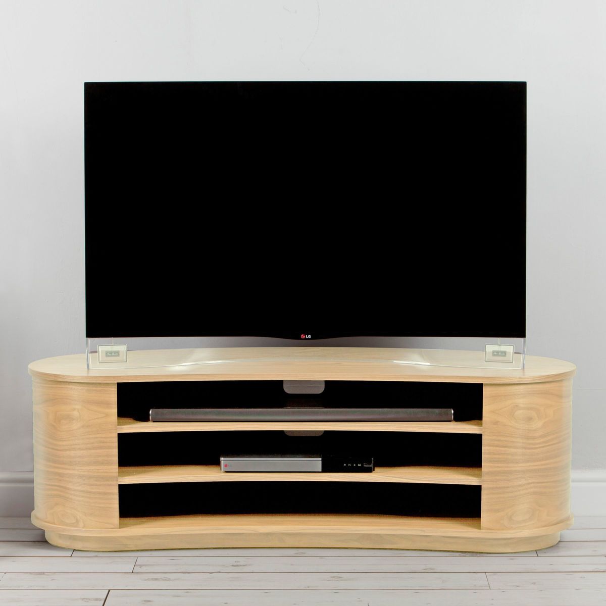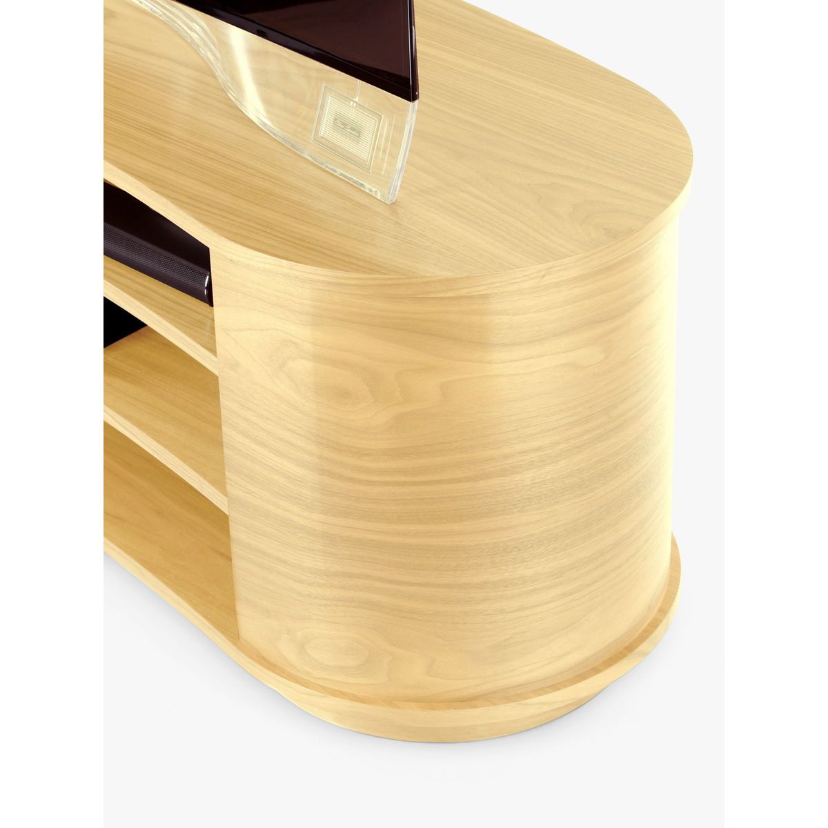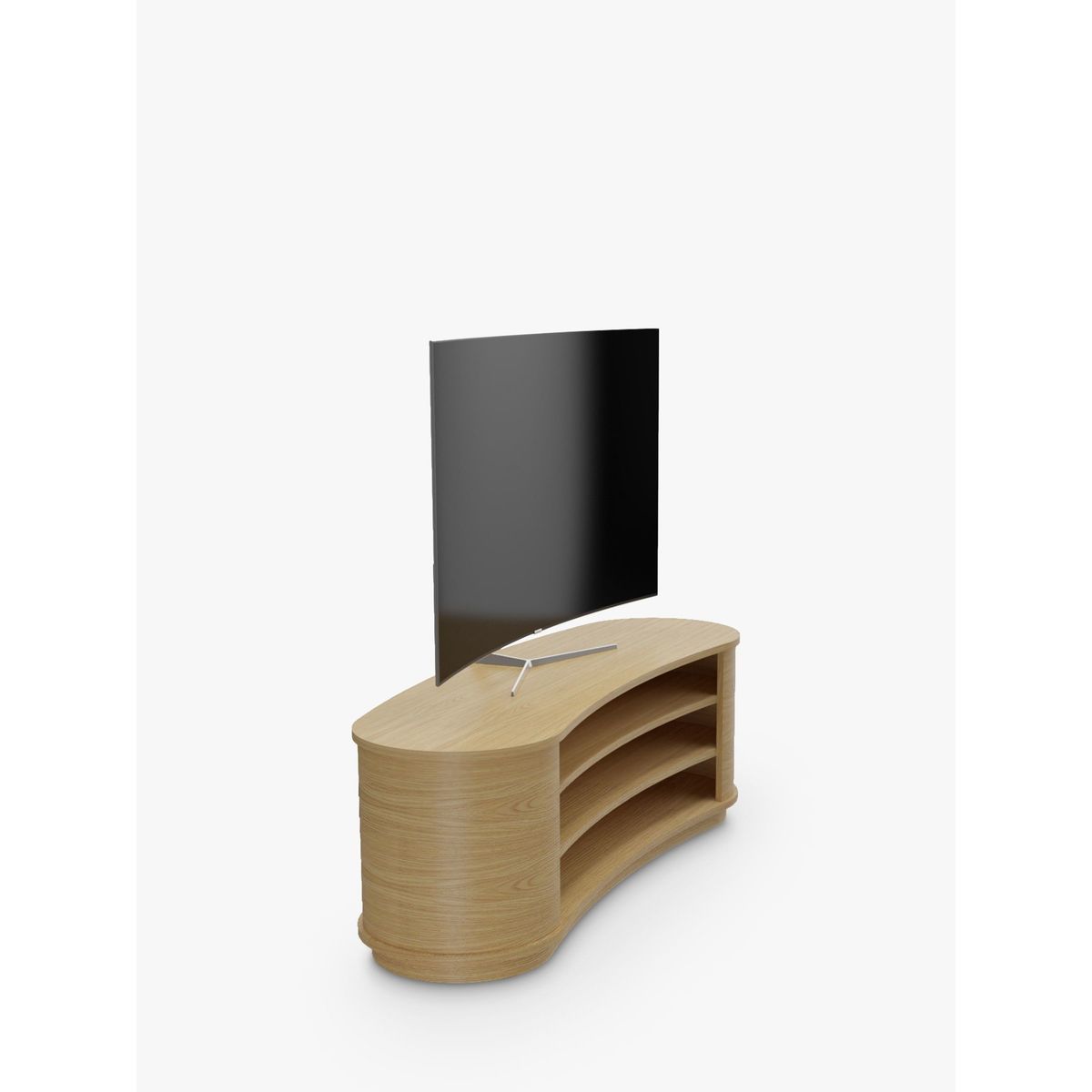 A wonderfully playful yet practical design, the Radius Home Theatre's elegant curve at the front flows through the sides and is mirrored at the back, giving this unit an all round radiating wow factor. It makes an elegant and classically minimal base for your home media set-up. The fixed shelving provides space for a sound bar and your audio-visual equipment, it's a modern option that perfectly balances style with practicality. Cable management features keep wires tidy and hidden from view. Handmade British design Natural wood veneer for uniqueness and beauty Maximum shelf weight: 50kg Shelf depth: 38cm Delivered fully assembled Please note: Any maximum TV size quoted is a recommendation only and the exact dimensions of the TV's pedestal/feet should be checked to ensure it fits prior to purchase.