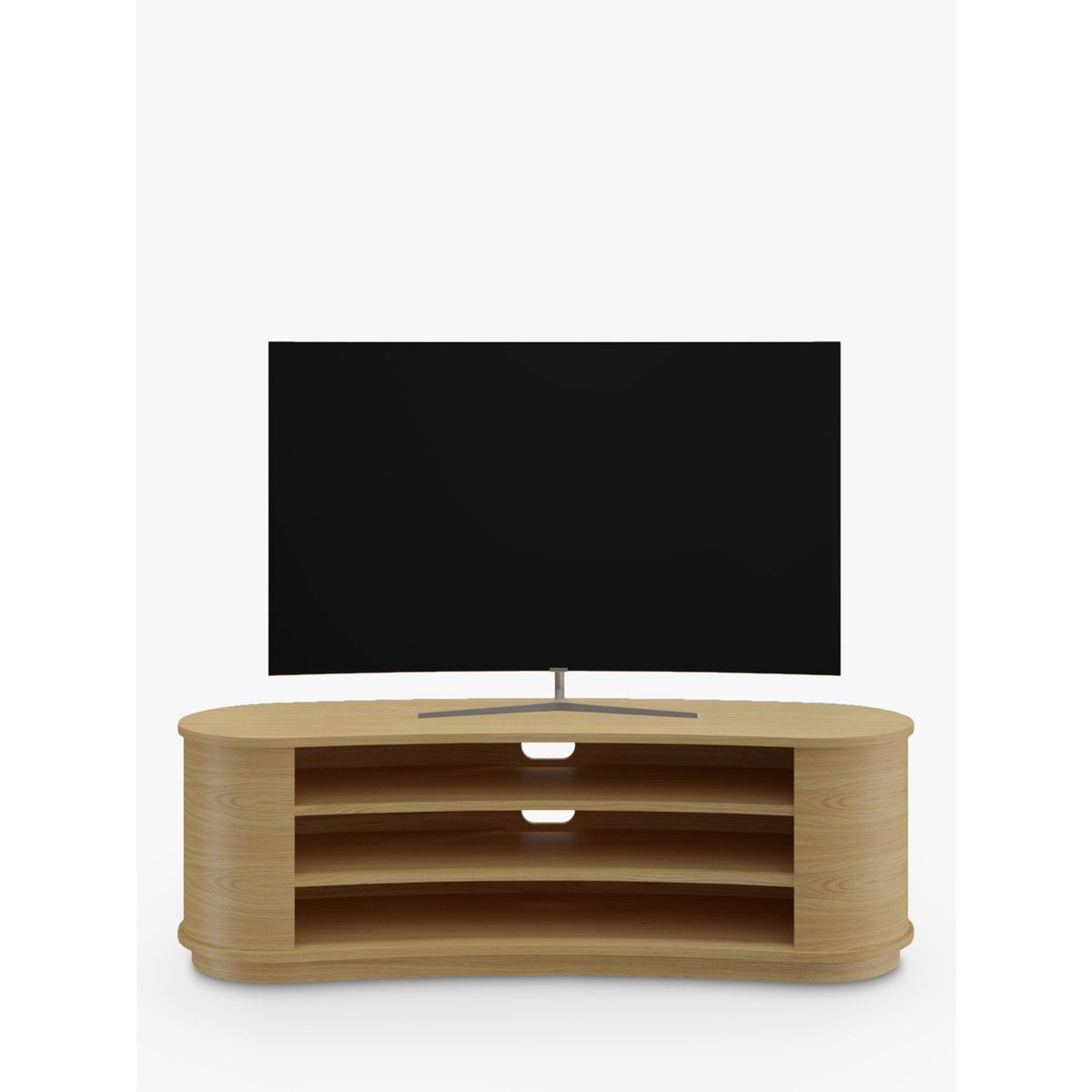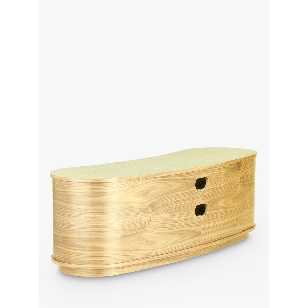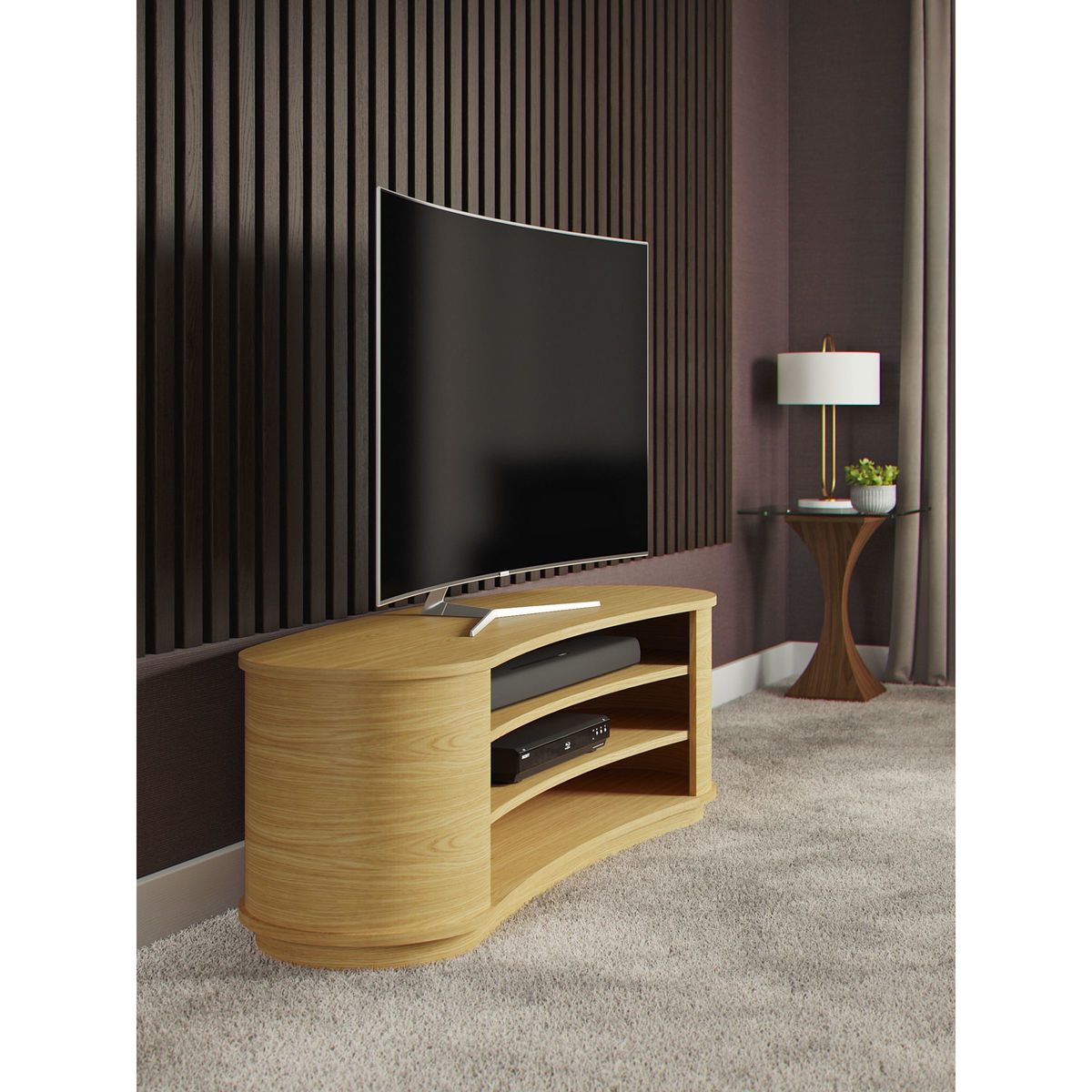 A wonderfully playful yet practical design, the Radius Home Theatre's elegant curve at the front flows through the sides and is mirrored at the back, giving this unit an all round radiating wow factor. It makes an elegant and classically minimal base for your home media set-up. The fixed shelving provides space for a sound bar and your audio-visual equipment, it's a modern option that perfectly balances style with practicality. Cable management features keep wires tidy and hidden from view. Handmade British design Natural wood veneer for uniqueness and beauty Maximum shelf weight: 50kg Shelf depth: 38cm Delivered fully assembled Please note: Any maximum TV size quoted is a recommendation only and the exact dimensions of the TV's pedestal/feet should be checked to ensure it fits prior to purchase.