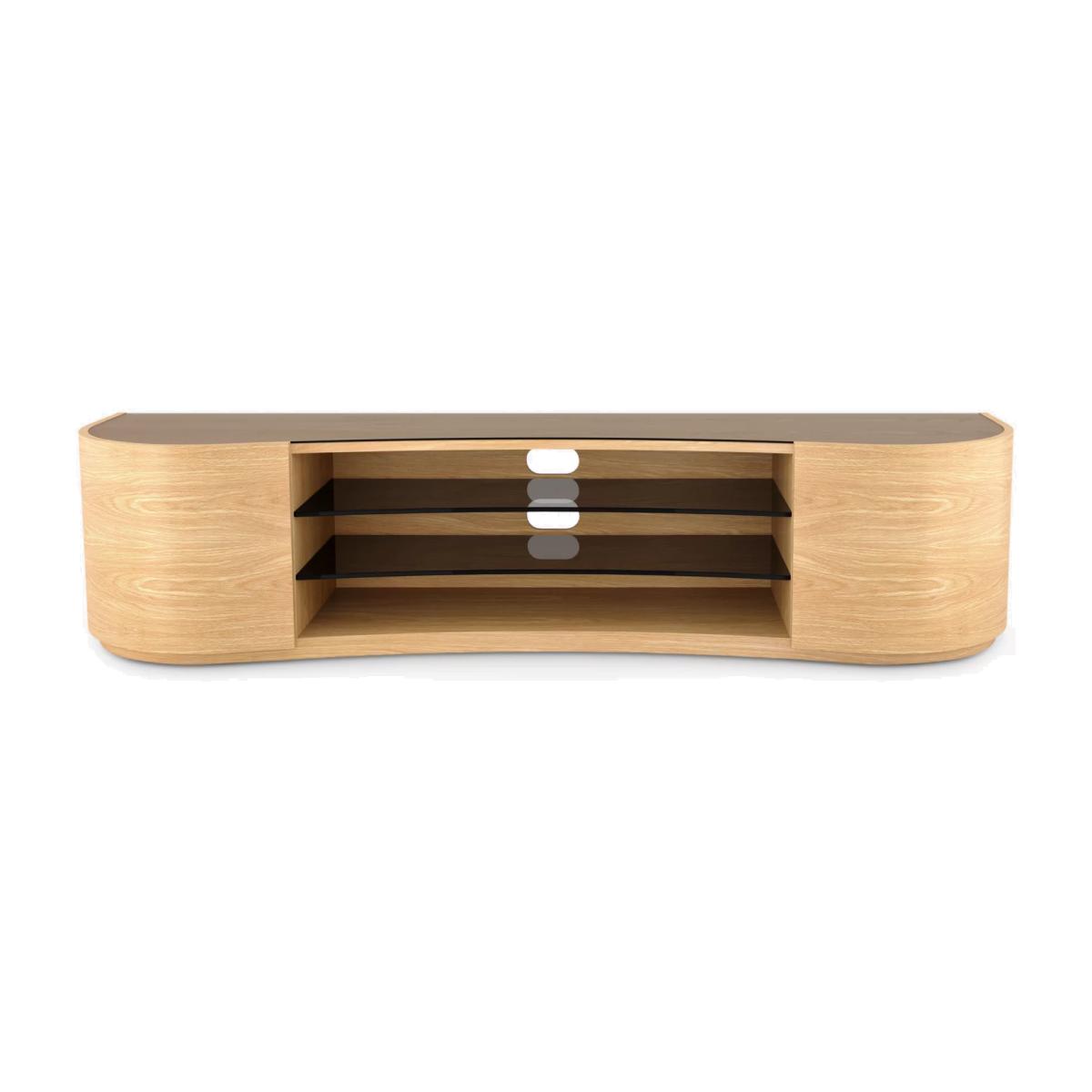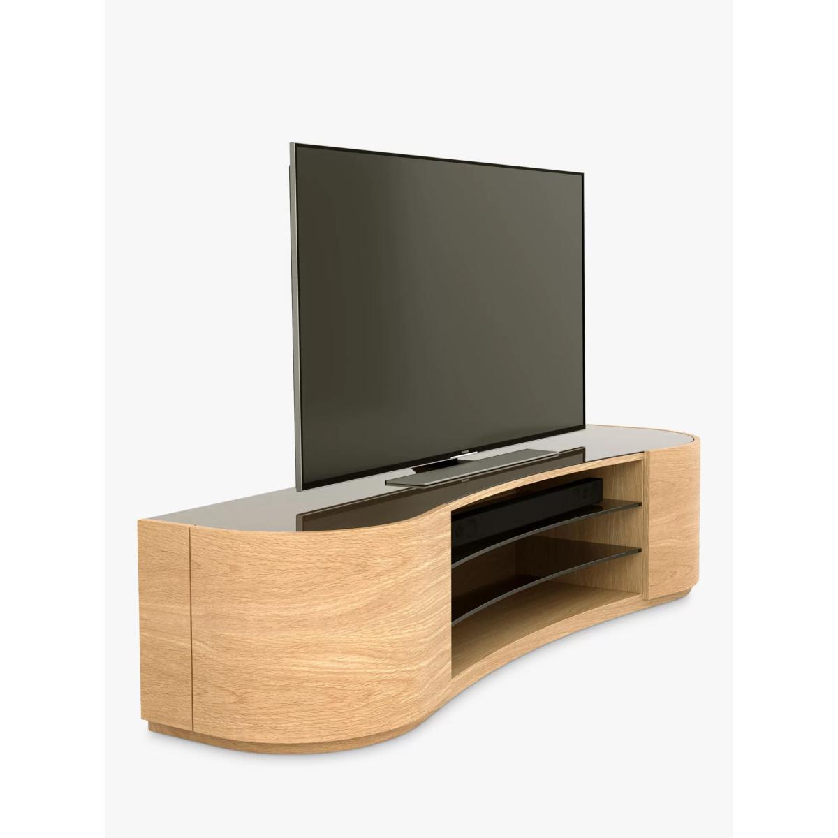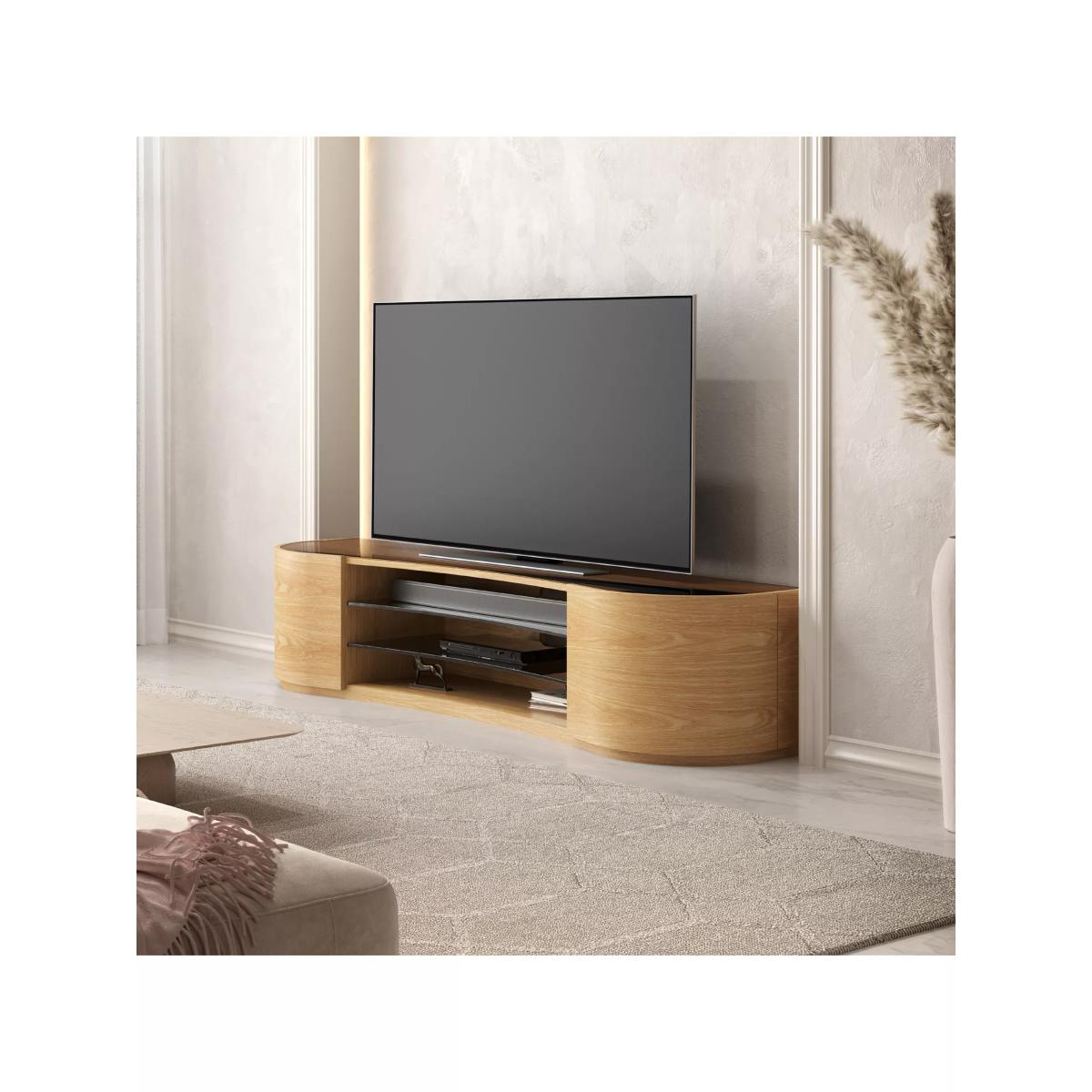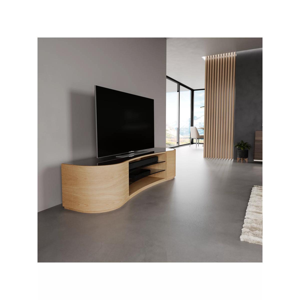 The sophisticated, undulating curves of this TV unit effortlessly flow from the open shelves to the deeper curves on either side to create practical storage space. It makes a beautifully elegant base for your home media set-up. The Undulate design offers a large platform suitable for TVs up to 85" in size, with adjustable smoked glass shelves and concealed doors that reveal generous storage. Handmade British design Natural wood veneer for uniqueness and beauty Maximum shelf weight: 50kg Shelf depth: 49cm Delivered fully assembled Please note: Any maximum TV size quoted is a recommendation only and the exact dimensions of the TV's pedestal/feet should be checked to ensure it fits prior to purchase.