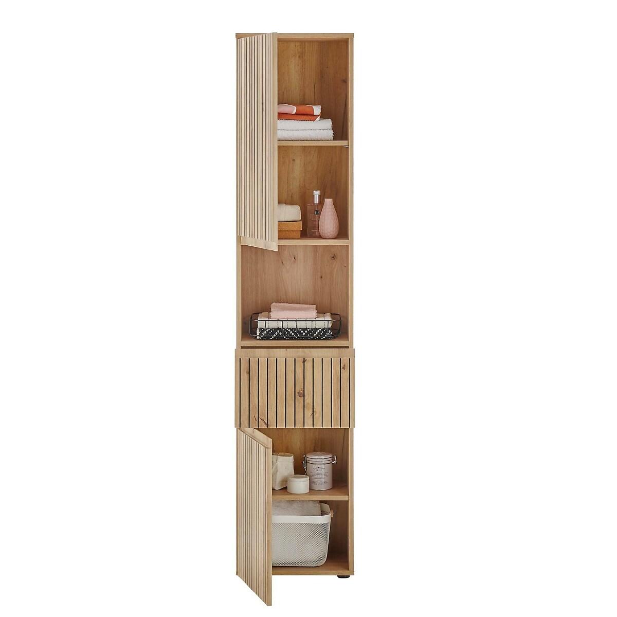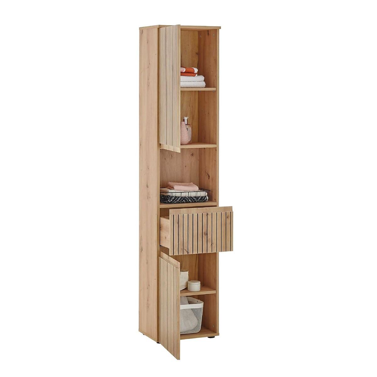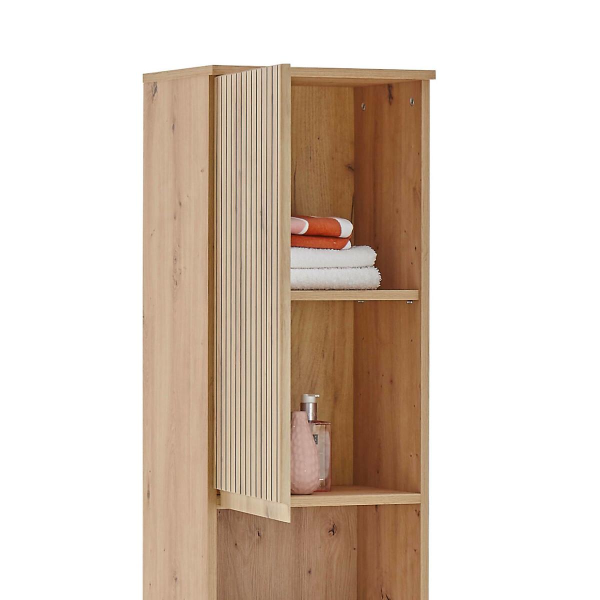 Elevate your bathroom with the Tomas Tall Cabinet, a perfect blend of rustic charm and modern design. Its natural wood tones and sleek, slatted detailing create a warm, inviting atmosphere. With two spacious cupboards and four ample shelves, you can neatly organise towels, toiletries, and other essentials. The elegant pull drawer, complete with a discrete handle, provides a sophisticated touch and makes accessing smaller items effortless. While the open middle compartment is perfect for showcasing folded towels or decorative baskets. Perfect for those who appreciate both elegance and practicality, this cabinet brings a timeless, stylish upgrade to your bathroom décor. Product details• Slatted design• Natural wood finish• Number of doors: 2• Number of shelves:5• Number of drawers: 1. Product Composition - 99% wood, 1% metal. Product Dimensions - 40 cm x30 cm x181 cm , Weight - 27.5 KGPackage Dimensions - 99 cm x 46 cm x 12 cm, Weight -14.6 KGThis product will be dispatched by one of our trusted suppliers. You’ll be contacted by their selected courier about your delivery. Please note: this product cannot be delivered to all Offshore Islands, Northern Ireland or Republic of Ireland. JULIA01