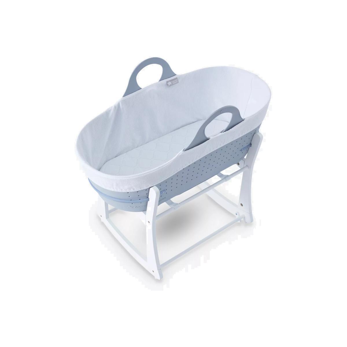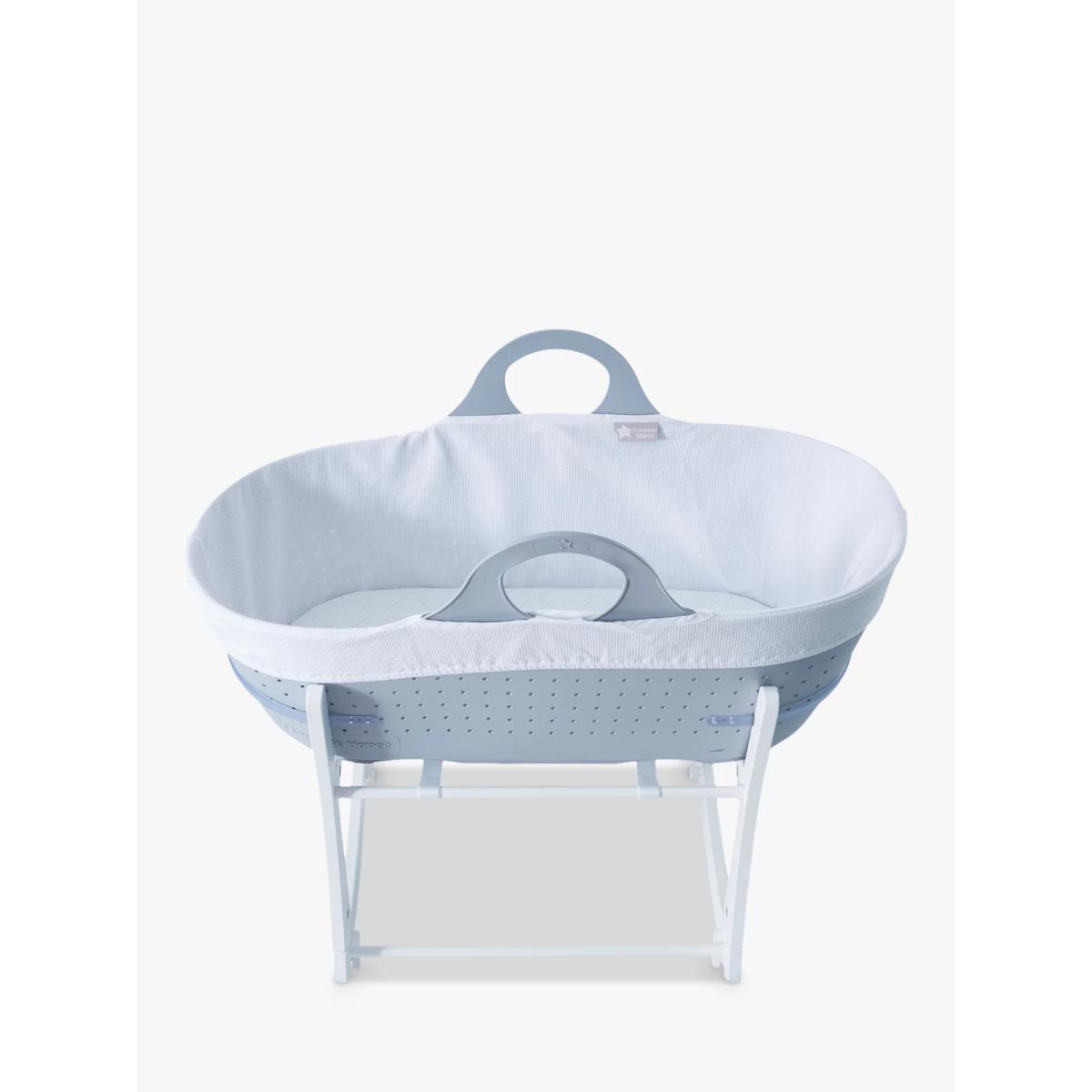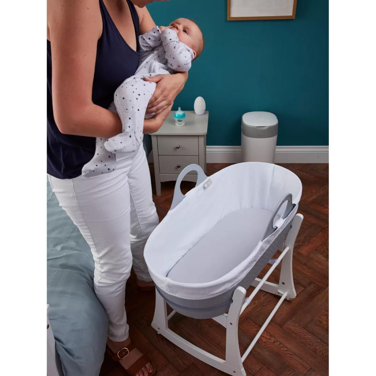 Sleek in design with a modern aesthetic, this portable Sleepee moses basket from Tommee Tippee slots effortless into your home, keeping baby nearby and providing the perfect space for bedside sleep and daytime naps. Complete with a mattress, a cotton liner and rocking stand, the static and rocking positions gently sooth baby to sleep whilst the airholes along the side and base allow maximum airflow to help regulate baby’s temperature and allow breathability. Key features: Suitable from birth to 6 months (or up to 9kgs) The Sleepee Baby Moses Basket comes with a mattress, liner and rocking stand. 300 air holes along the side and base to help regulate baby’s temperature and breathability. Strong integrated handles for minimal disturbance to baby as you move them Easy to clean and maintain: the Sleepee moses basket can be washed and cleaned with warm soapy water. The water-resistant mattress cover is both wipe clean and machine washable.