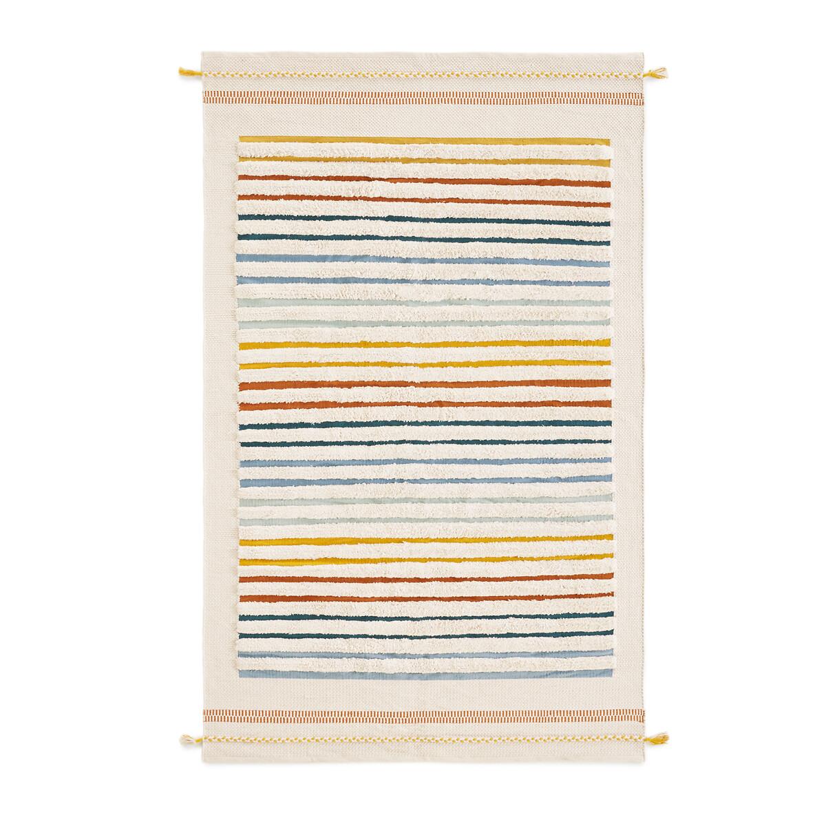 Tomulo is a rug with contemporary multicoloured Berber-inspired stripes. Hand weaving in India, cotton from organic farming. Machine washable, the Tomulo rug is easy to live with.