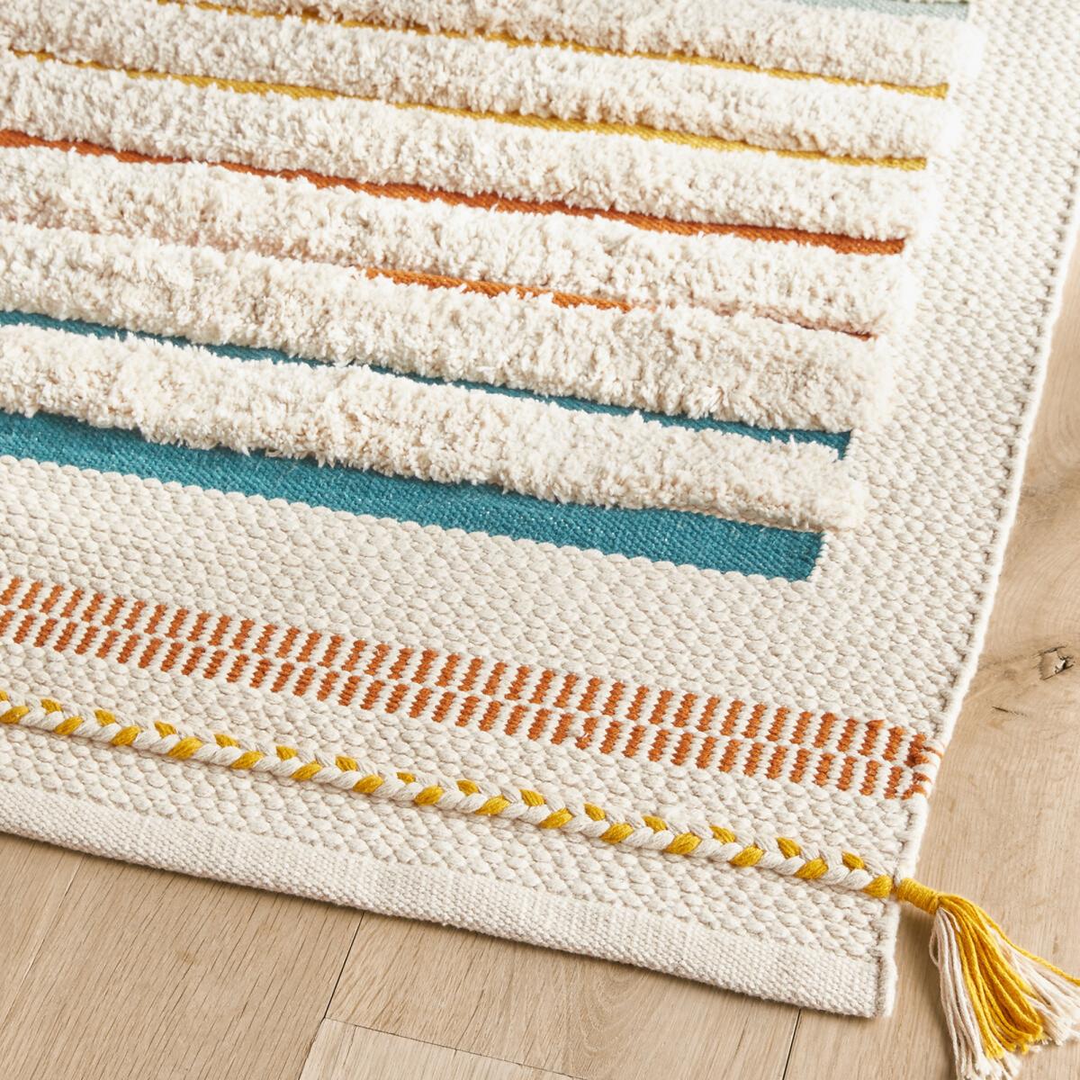 Thick, soft and fluffy, Tomulo is a rug with contemporary multicoloured Berber-inspired stripes. Hand woven in India, cotton from organic farming. Machine washable, the Tomulo rug is easy to live with.