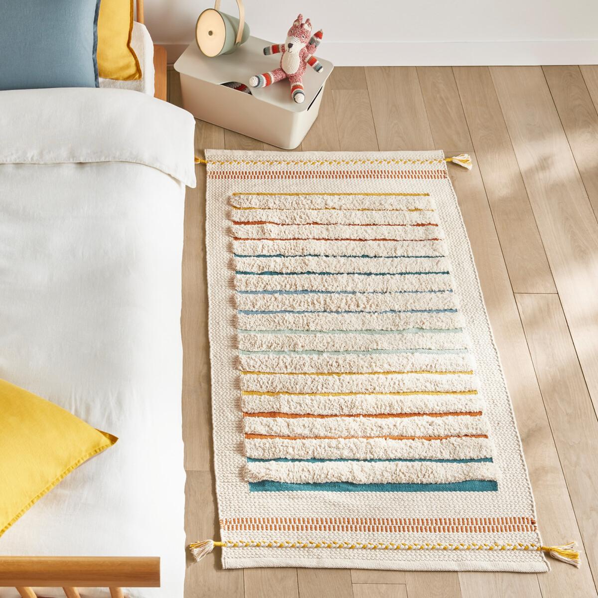 I love this striped hand-woven rug for its natural, organic feel and soft colour palette, making it a great choice for children's rooms. It works well in both modern and boho interiors, adding a touch of warmth and texture without overwhelming the space. Practical styling tips include layering it over a larger neutral carpet or placing it under a small, playful reading nook with colourful cushions and toys. Its organic cotton material also makes it easy to clean and comfortable for little feet, making it both stylish and functional.