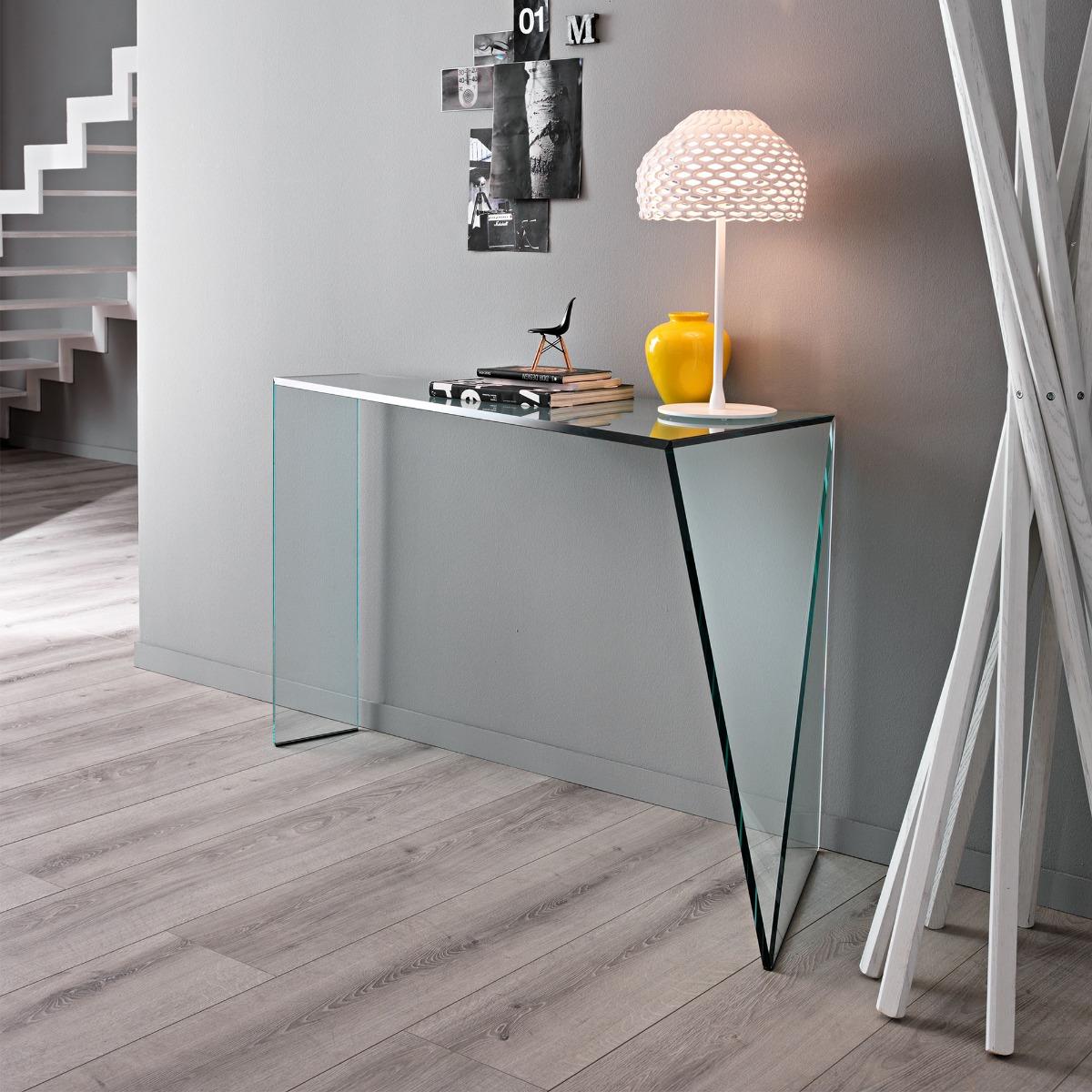 Practical and essential, the Penrose Console takes an asymmetrical structure, made entirely from extra clear glass for an uninterrupted flow throughout the piece. The geometric composition is an unbeatably modern look that is unique and full of personality. Designed by Isao Hosoe, Penrose is a picture of innovation and passion to be celebrated within the home.