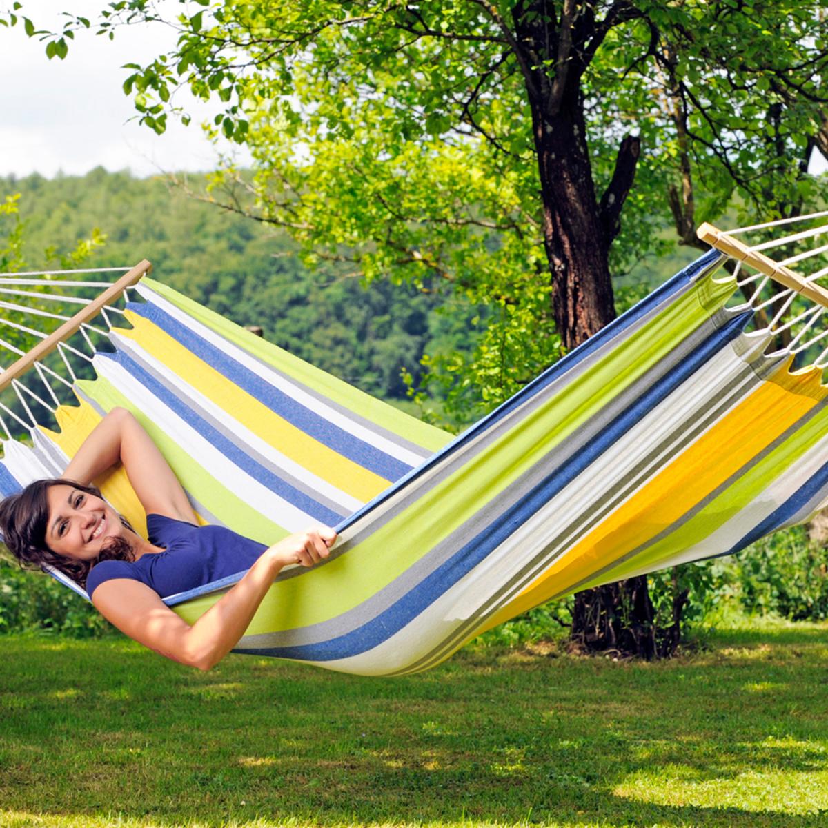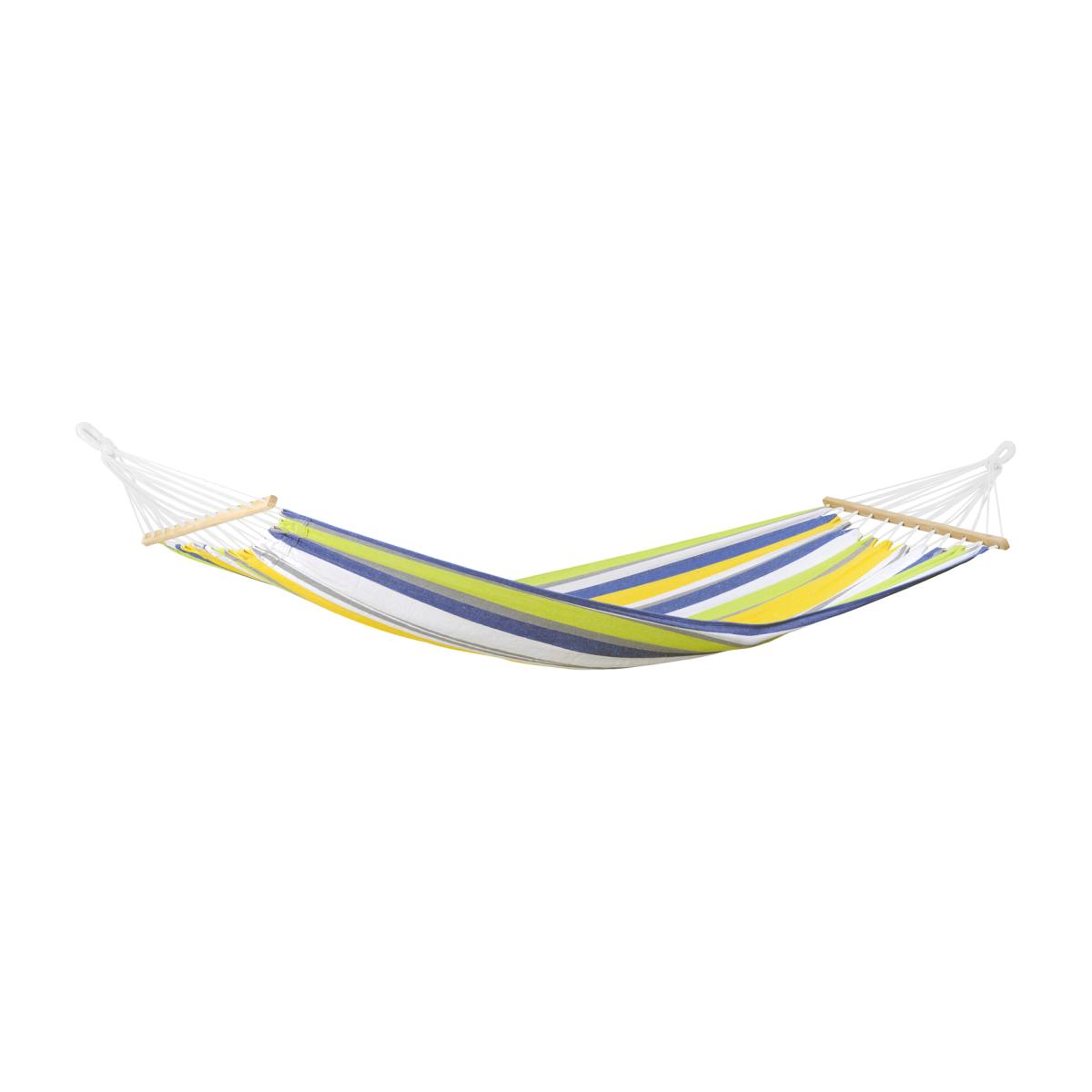 Comfortable and large, the Tonga Hammock is supplied with two hardwood spreader bars to create a spacious and cosy place for you to unwind. The Tonga Hammock is crafted from fine, soft cotton for perfect comfort. The fabric is also very strong, giving a maximum weight limit of 120kg. The specially braided cords also help to increase the strength of this pretty hammock. In a cute red, orange and purple stripe, all the family will love relaxing in the Tonga Vulcano Hammock.