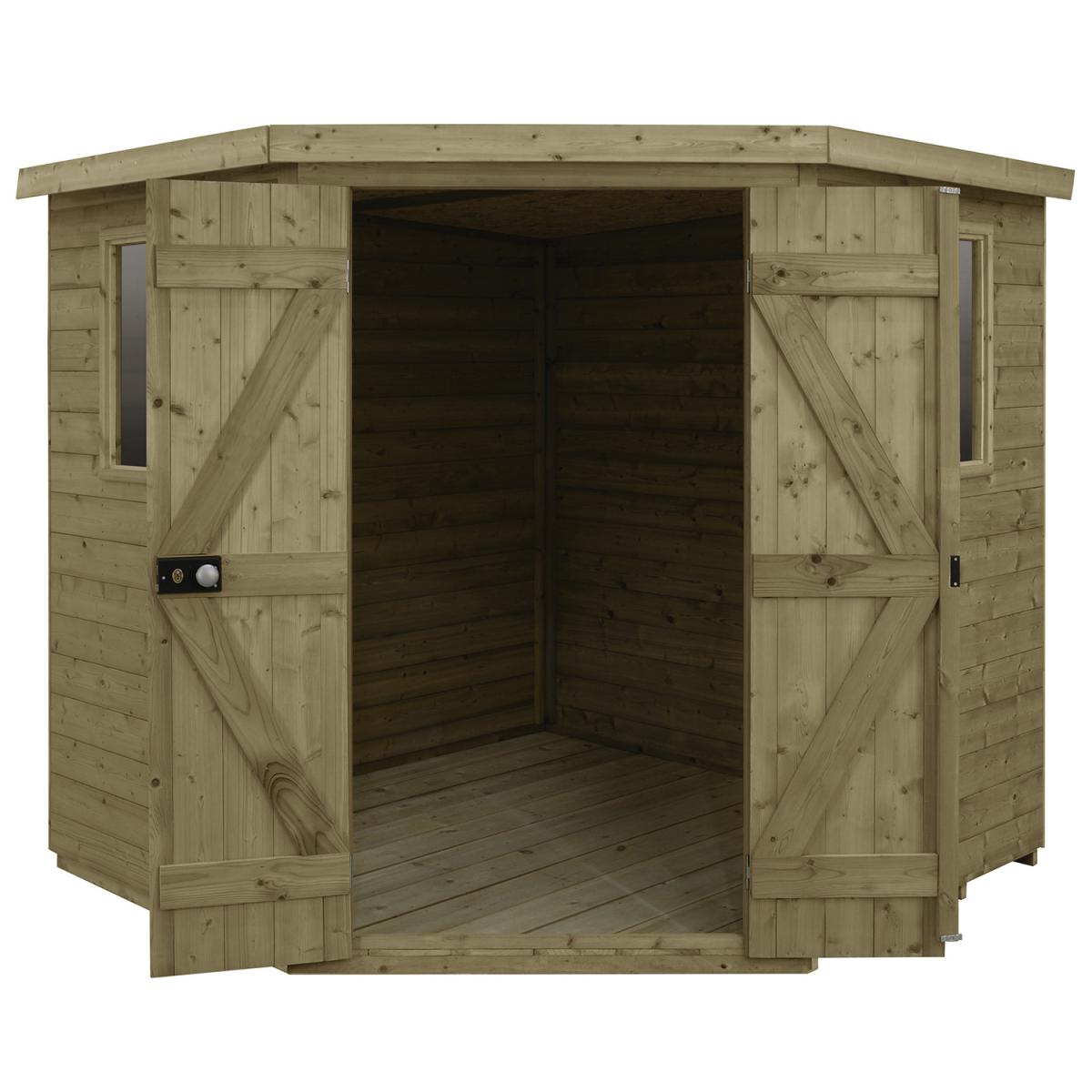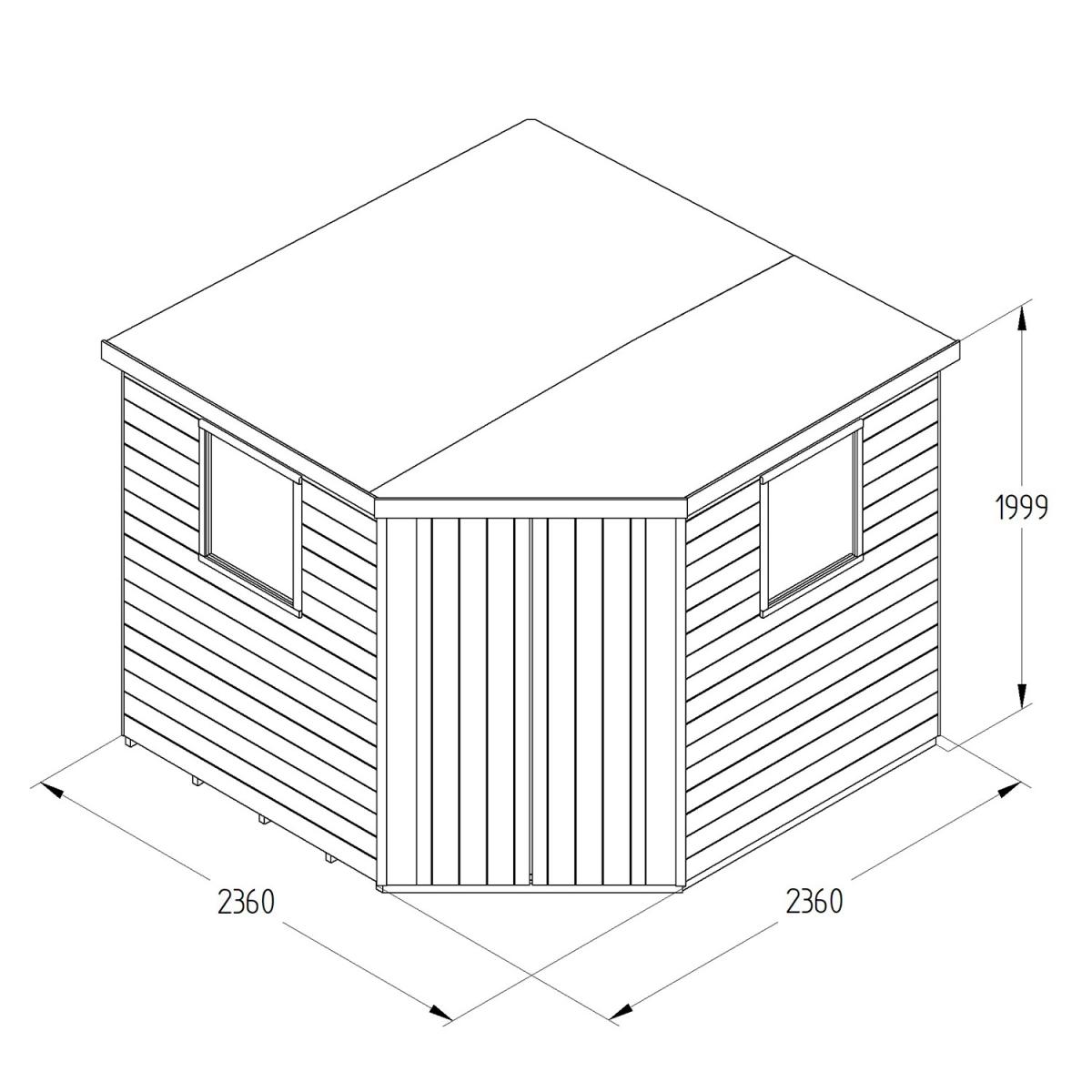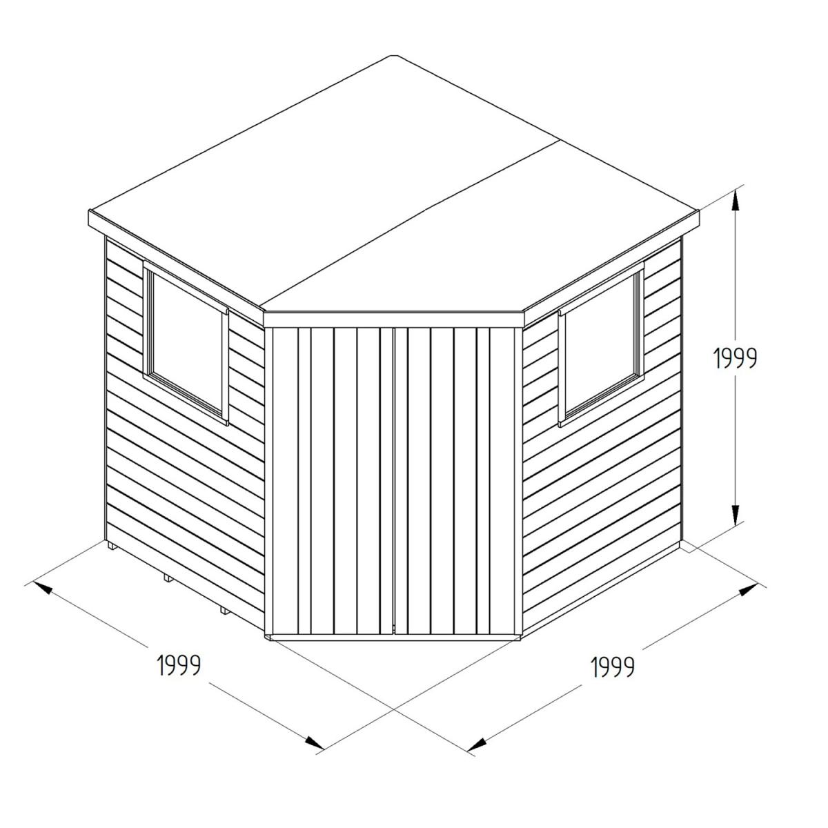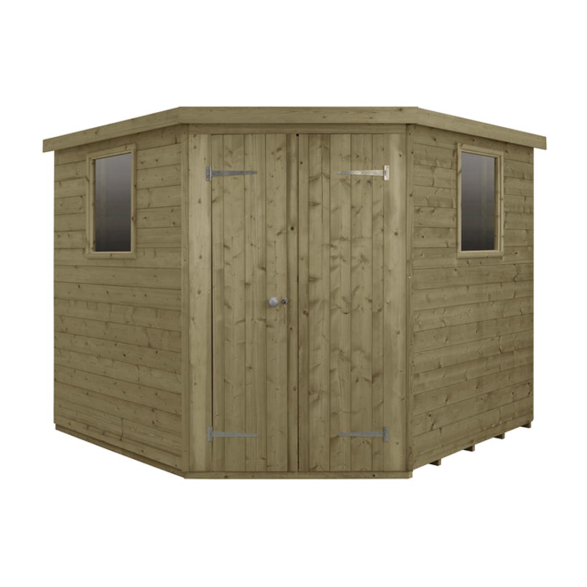 This premium quality Tongue & Groove Pressure Treated Corner Shed will help you keep your garden neat and tidy without being imposing on most of your space. It will slot easily right into the corner of your garden, while the blunted design of the front won't take up too much space, and creates a soft edge to the shed. The clever use of space inside makes this shed perfect for garden storage such as tools and bikes. Manufactured from smooth-planed, interlocking Tongue & Groove boards for a high quality build, all timber used has been pressure treated to ensure rot-resistance and durability. With Tongue & Groove also used across the flooring to ensure a super solid floor, the Pressure Treated Corner Shed is perfect for storing heavier items such as garden machinery or shelving units to hold smaller items. It features double opening doors with 'Z' framing for additional strength and they are secured with a rim lock fastening. The two opening windows are fitted with high quality hinges and catches to enable ventilation and are glazed with Premium 3mm acrylic, creating a light and airy space. The roof is finished with high quality mineral felt for a weather-proof finish. Instillation by a team of professionals is available for an extra yet affordable price, and all fittings and fixtures are included with this shed, as well as easy-to-follow instructions are included for any DIY hobbyists who want to really made this shed their own by building it themselves.