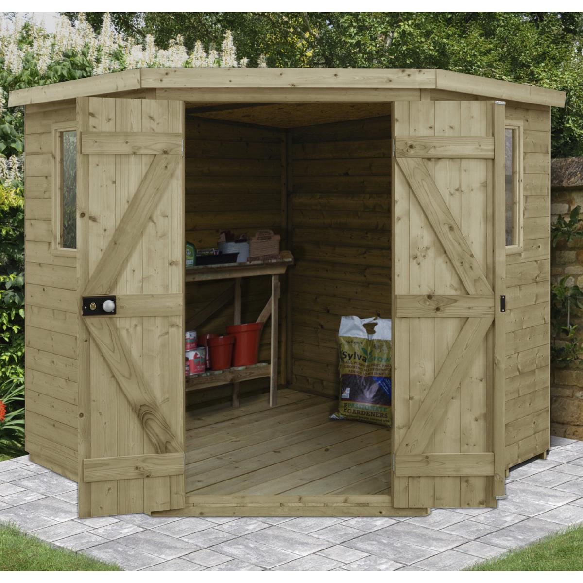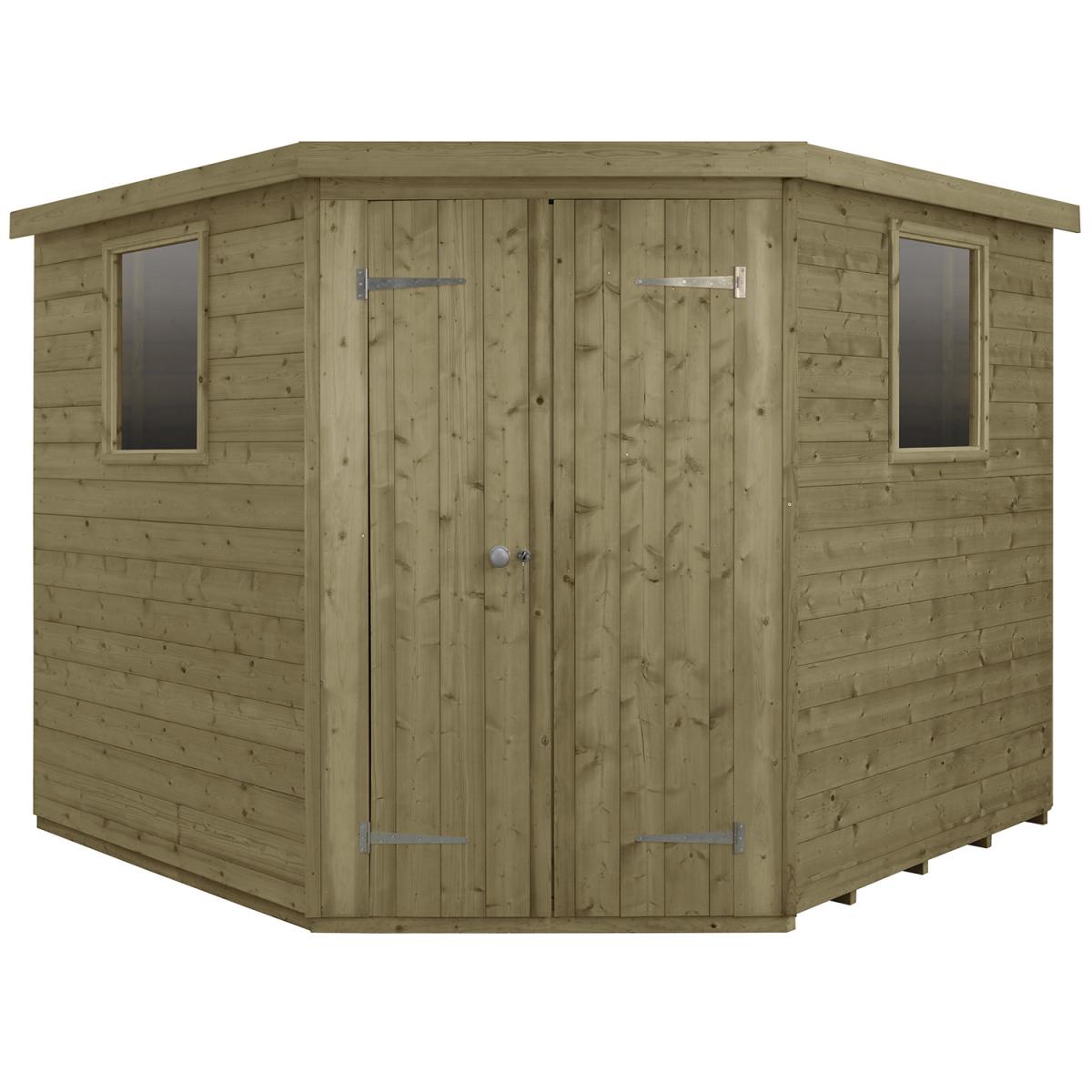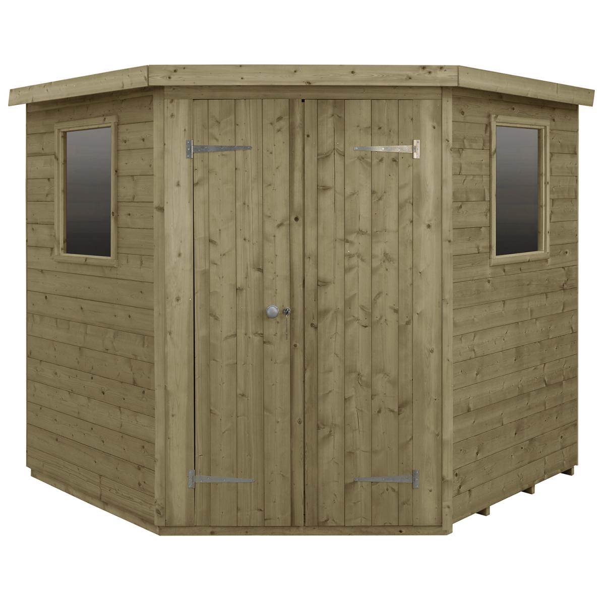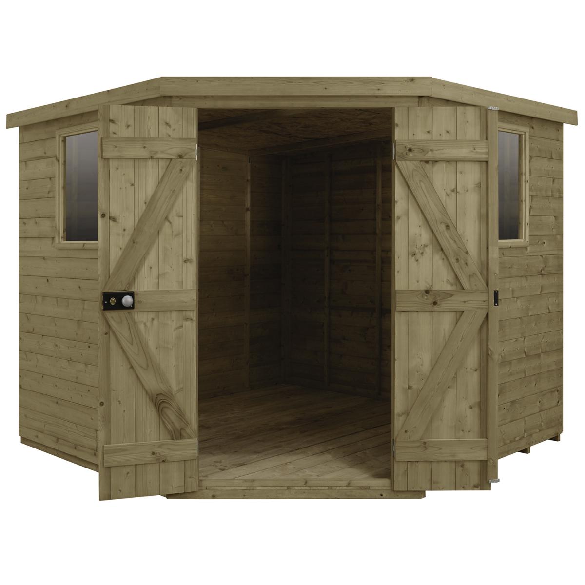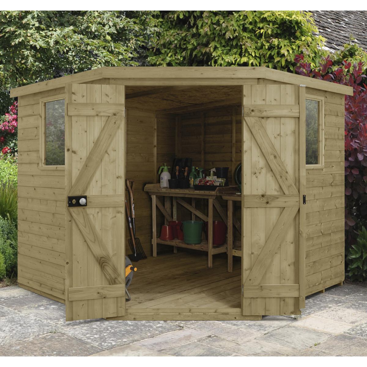 This premium quality Tongue & Groove Pressure Treated Corner Shed will help you keep your garden neat and tidy without being imposing on most of your space. It will slot easily right into the corner of your garden, while the blunted design of the front won't take up too much space, and creates a soft edge to the shed. The clever use of space inside makes this shed perfect for garden storage such as tools and bikes. Manufactured from smooth-planed, interlocking Tongue & Groove boards for a high quality build, all timber used has been pressure treated to ensure rot-resistance and durability. With Tongue & Groove also used across the flooring to ensure a super solid floor, the Pressure Treated Corner Shed is perfect for storing heavier items such as garden machinery or shelving units to hold smaller items. It features double opening doors with 'Z' framing for additional strength and they are secured with a rim lock fastening. The two opening windows are fitted with high quality hinges and catches to enable ventilation and are glazed with Premium 3mm acrylic, creating a light and airy space. The roof is finished with high quality mineral felt for a weather-proof finish. Instillation by a team of professionals is available for an extra yet affordable price, and all fittings and fixtures are included with this shed, as well as easy-to-follow instructions are included for any DIY hobbyists who want to really made this shed their own by building it themselves.