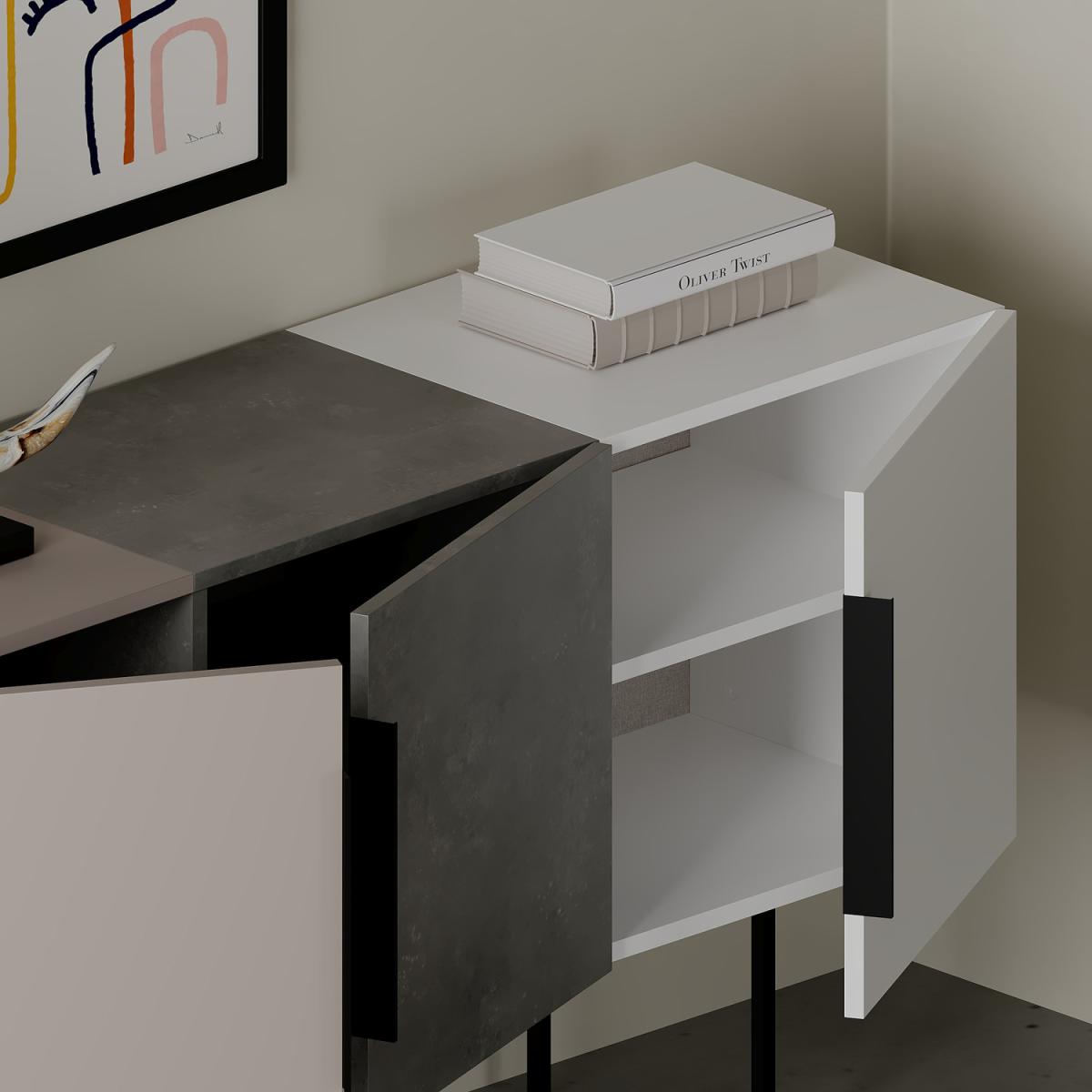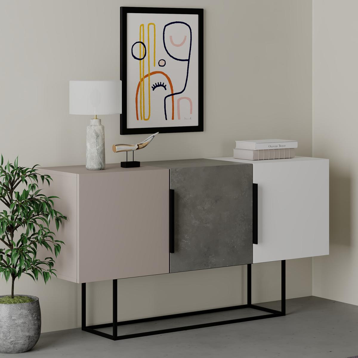 Upgrade your home with our stylish cubic sideboard. It offers ample storage with three cabinets and interior shelves. The sturdy metal legs add durability and a modern touch. Choose from multiple colors to personalize your space. Assembly required with included fittings and clear instructions. Crafted with high-quality engineered wood and a protective melamine finish. Easy maintenance with a damp cloth. Dimensions 150 x 42 x 80 cm. Contact us for inquiries. Secure and recyclable packaging.