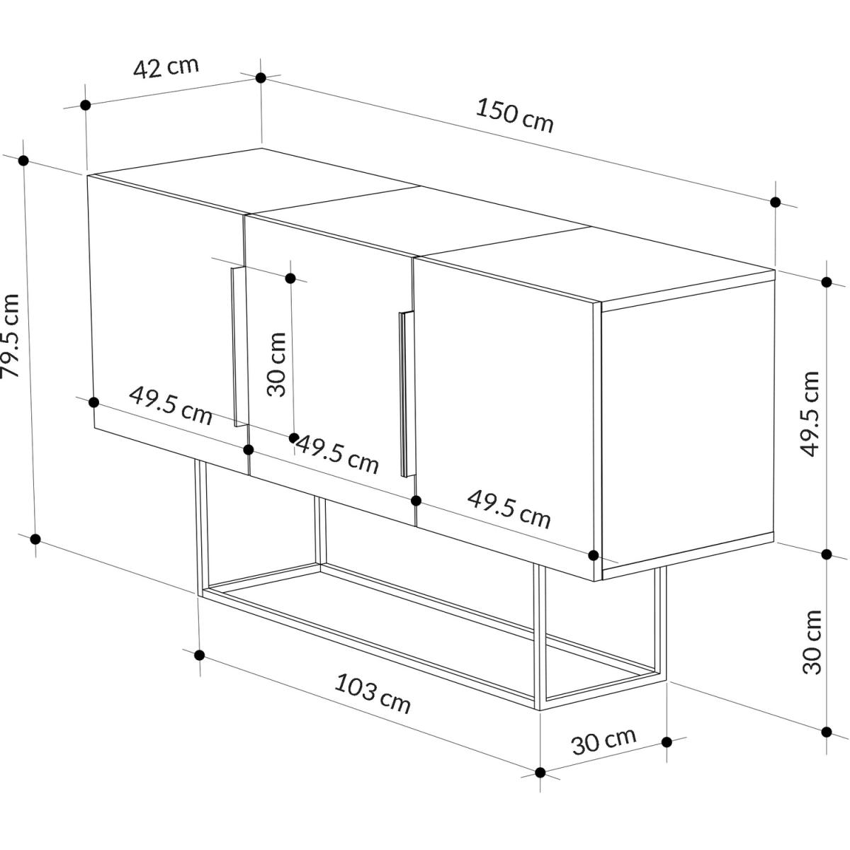 Upgrade your home with our stylish cubic sideboard. It offers ample storage with three cabinets and interior shelves. The sturdy metal legs add durability and a modern touch. Choose from multiple colors to personalize your space. Assembly required with included fittings and clear instructions. Crafted with high-quality engineered wood and a protective melamine finish. Easy maintenance with a damp cloth. Dimensions 150 x 42 x 80 cm. Contact us for inquiries. Secure and recyclable packaging.