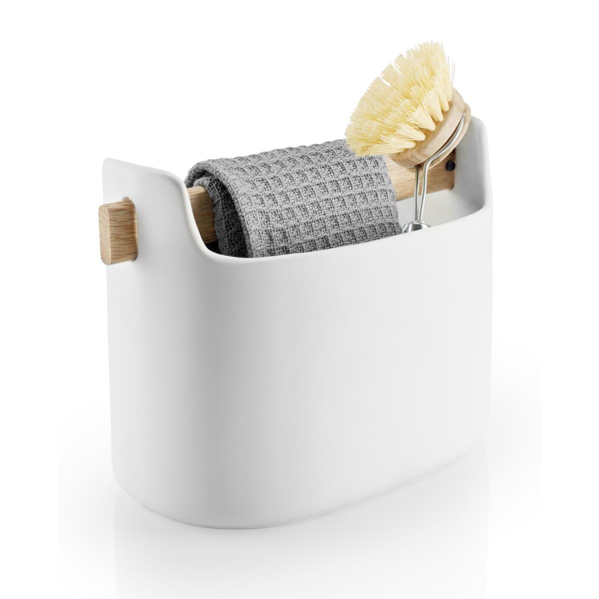 This storage will put order around the sink or on your desk. It is made of matt ceramic and oak, noble materials that bring it softness and elegance. The oak handle bar can be used as a separator for cutlery, for example, or can be used to dry wet dampers.