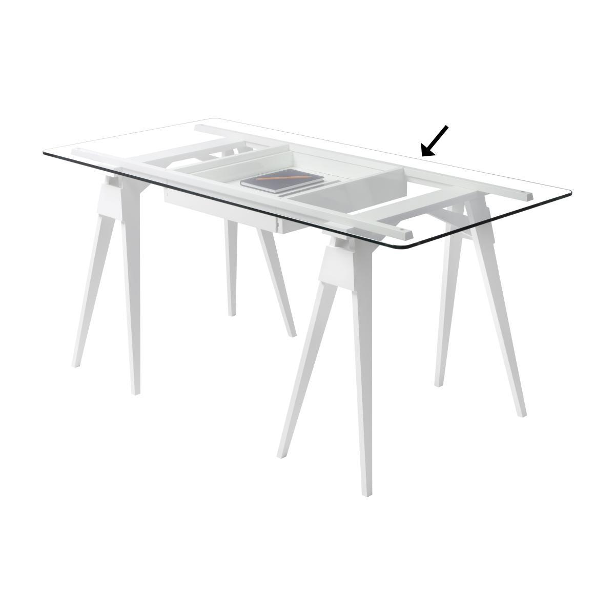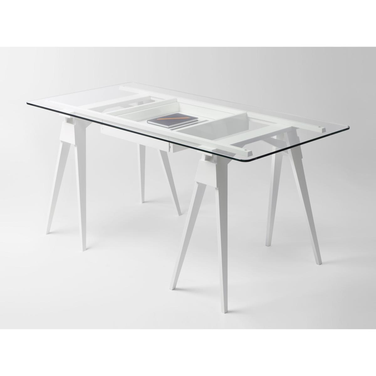 A desk that has nothing to hide! This desk in architect-drawing-board-look consists of three separate parts: a solid pair of trestles, a white lacquered sliding drawer and a tempered glass top. The absolute transparency reveals and highlights the content of the drawer underneath. Arco can be customised by putting in personal treasures like post cards, shells, art books. The compacts size makes this desk ideal for rooms of limited space. This versatile object can also serve as a console at the entrance, or why not as an original showcase? The drawer is sliding from both sides. The three parts Arco consists of are sold separately: a pair of trestles, drawer, glass top. Such modular system allows you to create a customised desk – you can choose if to insert the drawer or not; you can use the glass tabletop or another one of your chose (wooden, metallic,. ). Please note: The price above is for one tabletop only (drawer and trestles sold separately).