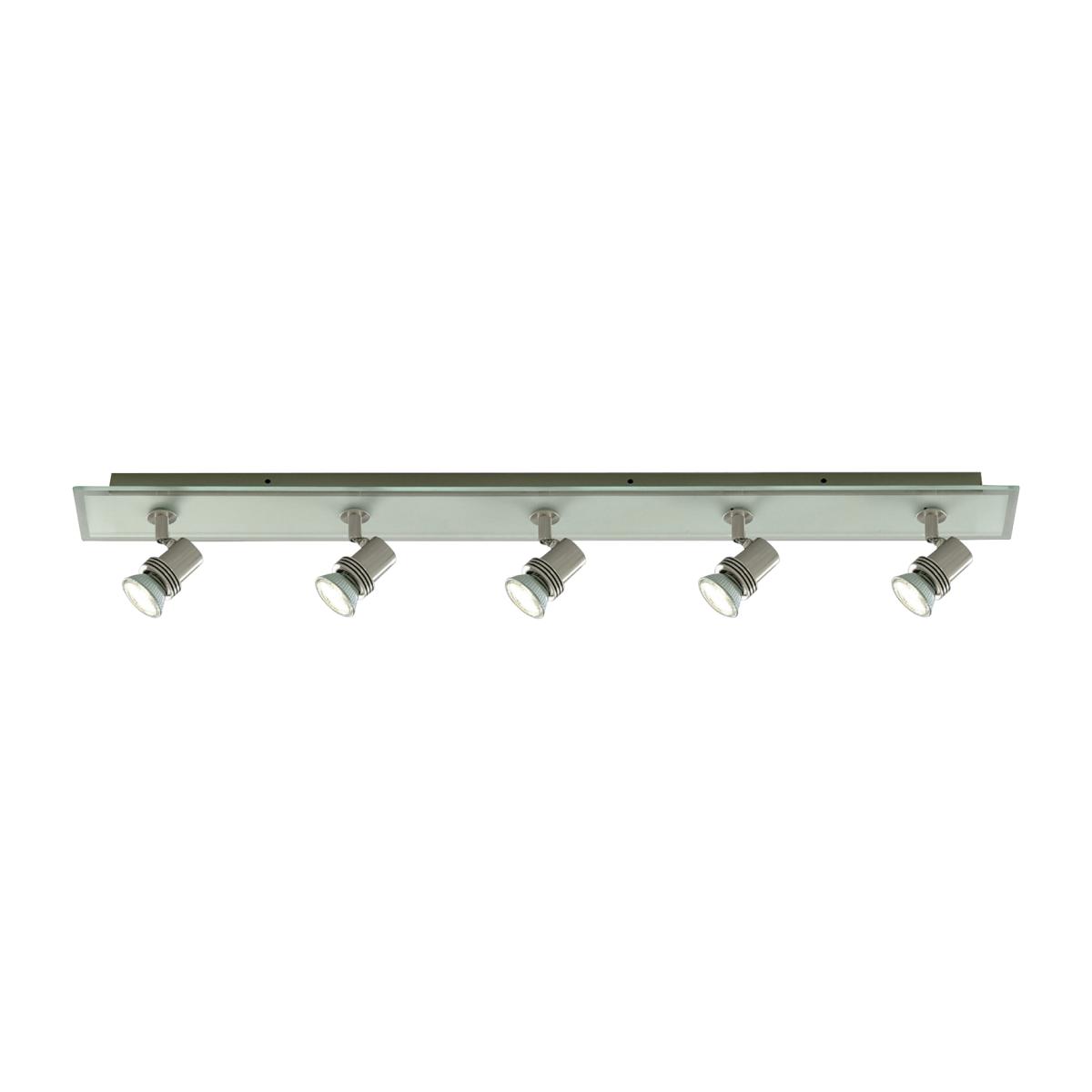 This Top Hat satin silver 5 light spotlight bar with satin silver oblong glass ceiling plate is modern and classic. The five top hat shaped lights are fully adjustable, so you can find the perfect angle for the spotlights. And the fitting has a stylish satin silver finish, with a long clear and frosted glass back plate to complete the look. This product accepts a Max 7W LED or 50w Halogen GU10.