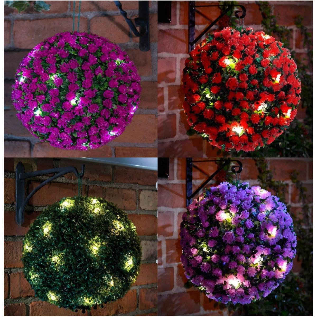 Topiary Ball Solar lights. 3 colours to choose from (Red, Green or Purple) for all your decorative needs. Simply charge up by the solar panel throughout the day and the 20 LED lights automatically turn on at dusk. Use in a hanging basket or display in a pot. Fantastic on either side of your front door or Garden!