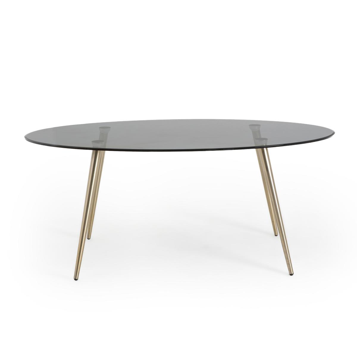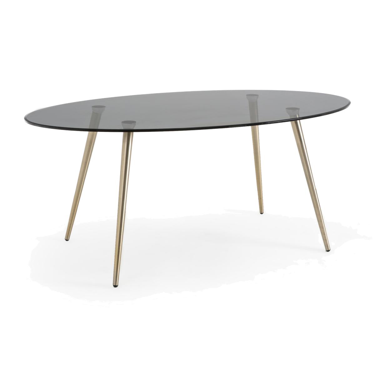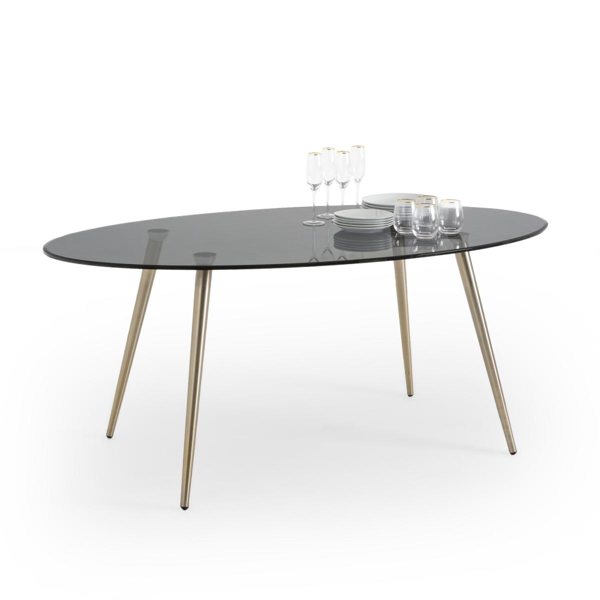 The Topim oval dining table. Pure lines and simplistic design: the Topim table lets its simple beauty shine through. We love the superb finishes of the smoked tempered glass top mounted on 4 tapered metal legs. Product Details: • Bevelled oval tabletop in 60% transparent black smoked glass • Structure and base in golden metal. • 12 mm thick bevelled tempered glass top • Tapered tubular steel base with brass finish • Plastic pads on feet • Sold for self-assembly. See the full TOPIM collection online. Dimensions : • Width: 180cm • Height: 75cm • Depth: 100cm. Home Delivery:Requires self-assembly. It will be delivered direct to your door!Note! Please check that all access points are large enough to accommodate your delivery (doors, stairs, lifts).Parcel dimensions and weight:1 parcel • L187.5 x H110 x D107.5 cm • 52kg