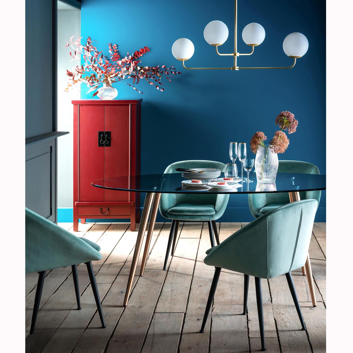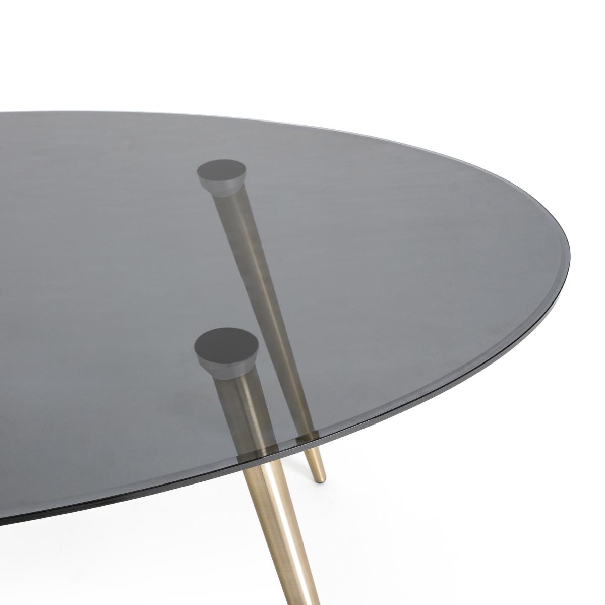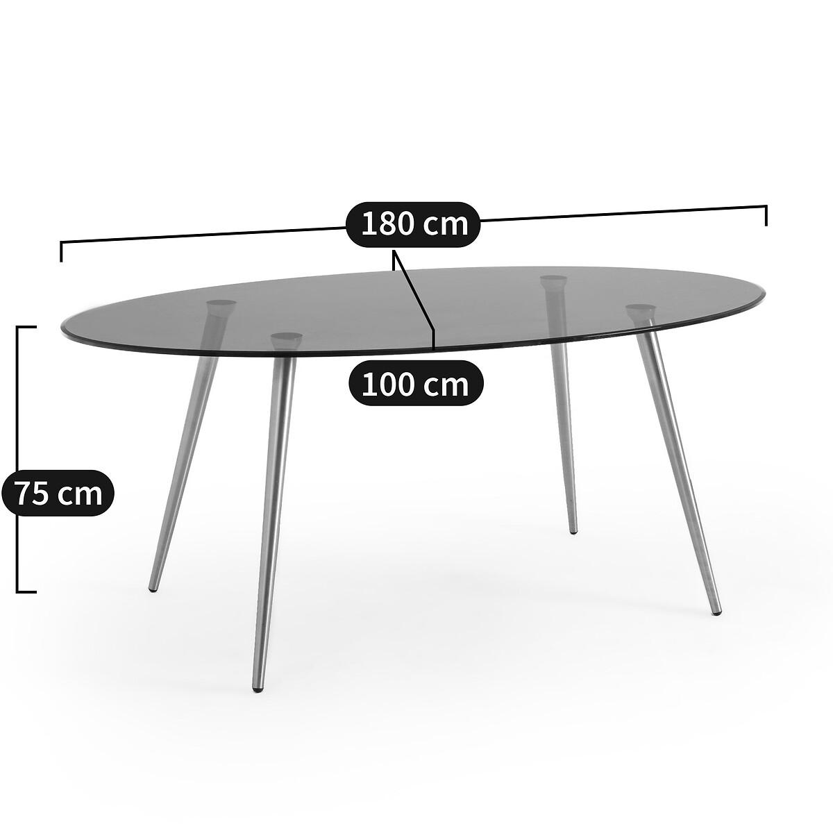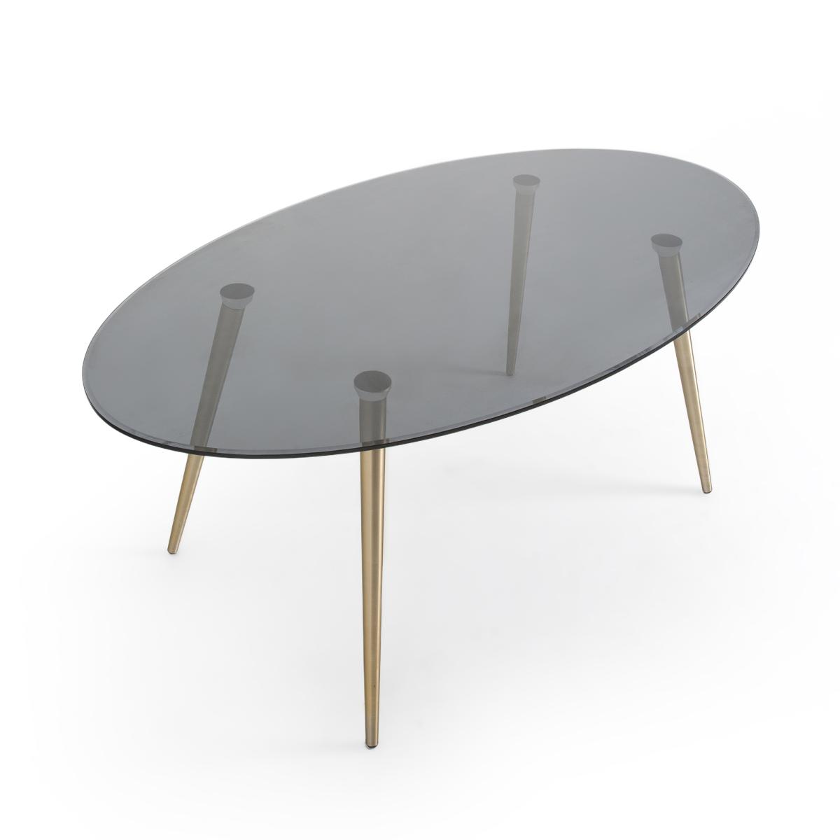 The Topim oval dining table. Pure lines and simplistic design: the Topim table lets its simple beauty shine through. We love the superb finishes of the smoked tempered glass top mounted on 4 tapered metal legs. Product Details: • Bevelled oval tabletop in 60% transparent black smoked glass • Structure and base in golden metal. • 12 mm thick bevelled tempered glass top • Tapered tubular steel base with brass finish • Plastic pads on feet • Sold for self-assembly. See the full TOPIM collection online. Dimensions : • Width: 180cm • Height: 75cm • Depth: 100cm. Home Delivery:Requires self-assembly. It will be delivered direct to your door!Note! Please check that all access points are large enough to accommodate your delivery (doors, stairs, lifts).Parcel dimensions and weight:1 parcel • L187.5 x H110 x D107.5 cm • 52kg