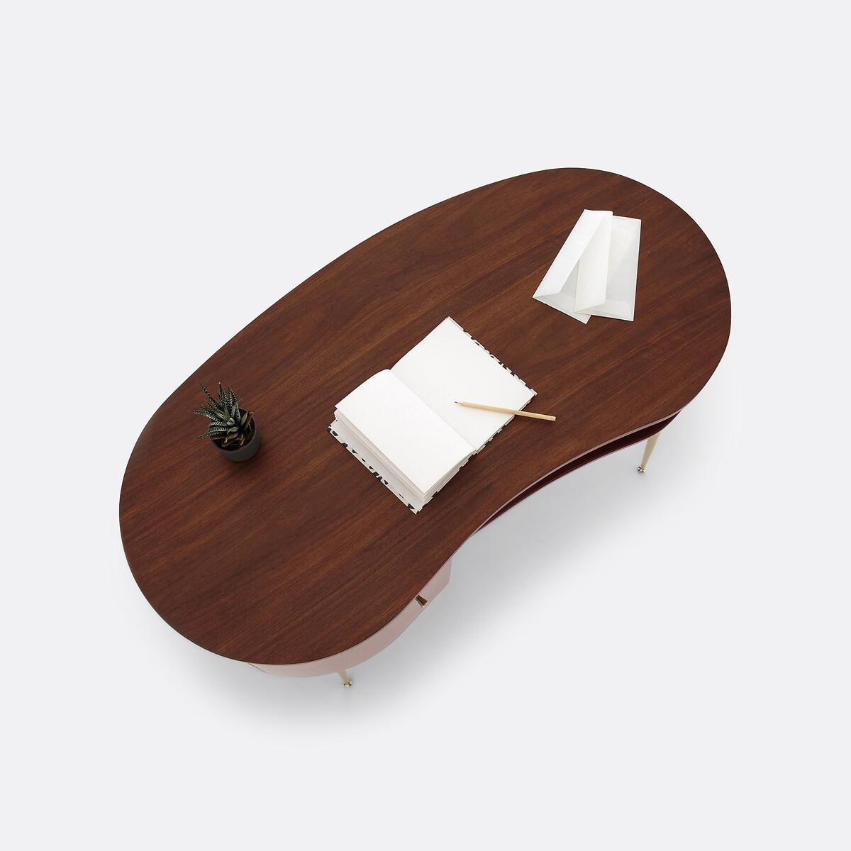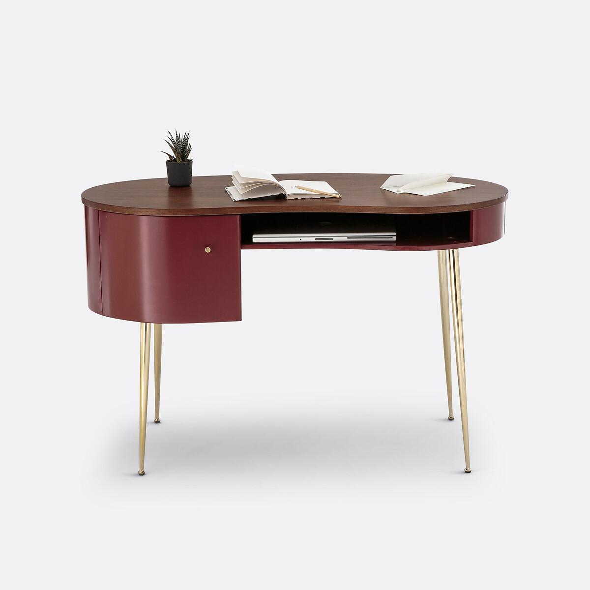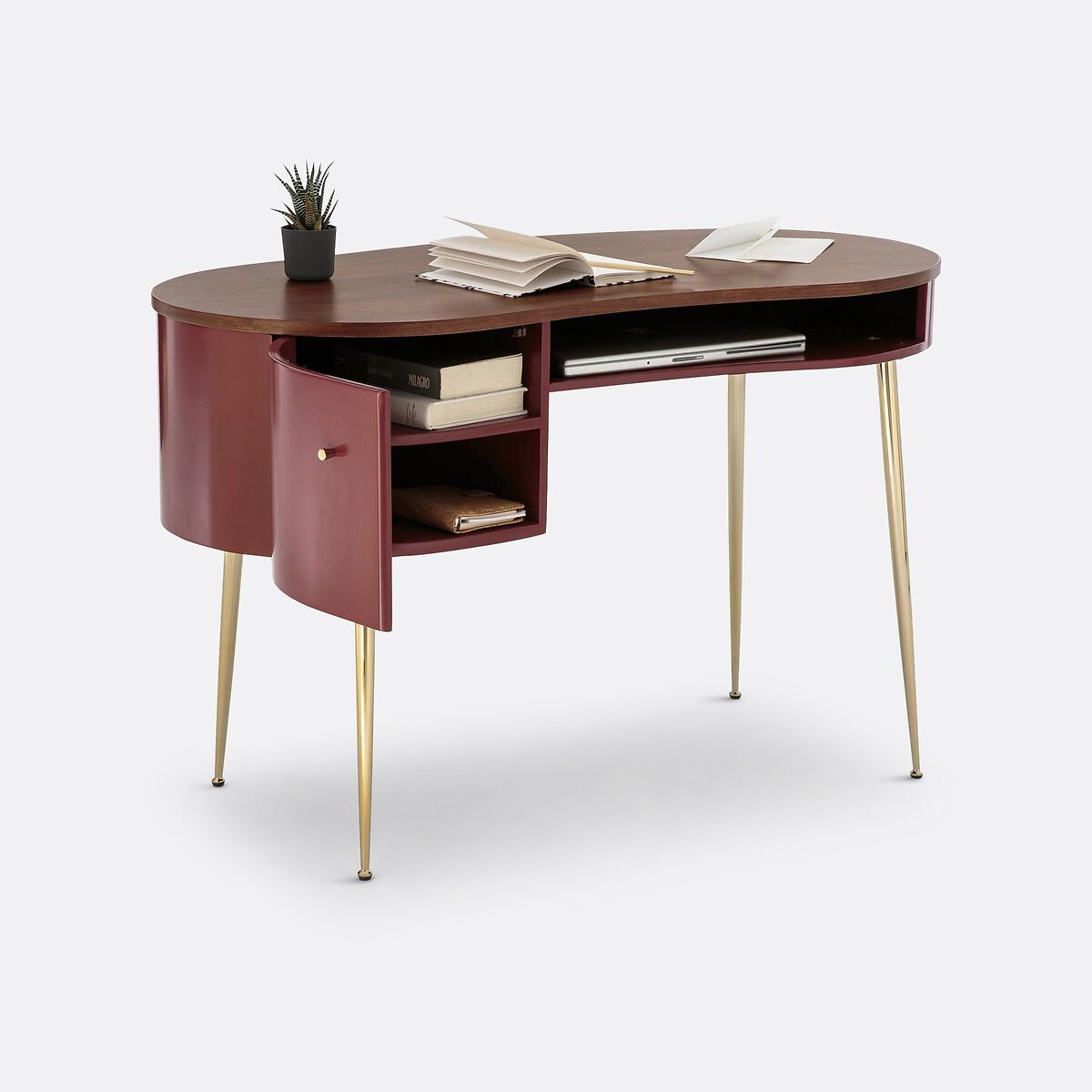 Kidney shape with fine brass legs... vintage style is reinterpreted in the most beautiful way. An exclusive creation by our in-house designers. Product Details • Walnut veneered MDF top • MDF frame with polyurethane finish lacquer • Brass/gilt metal legs with pads • 1 door • 1 compartment beneath the desk top • Adjustable tapered legs in gilt metal with pads. Dimensions • Width: 120cm • Height: 75.3cm • Depth: 60cm • Interior of unit: L32 x H28 x D50cm • Open compartment: L62 x H8.5 x D48cm • WOOD FROM SUSTAINABLY MANAGED FORESTS. FSC® certified wood comes from forests that are environmentally, socially and economically well managed. Parcel Dimensions: • 1 parcel • L128 x H40 x D70cm, 34.5kg