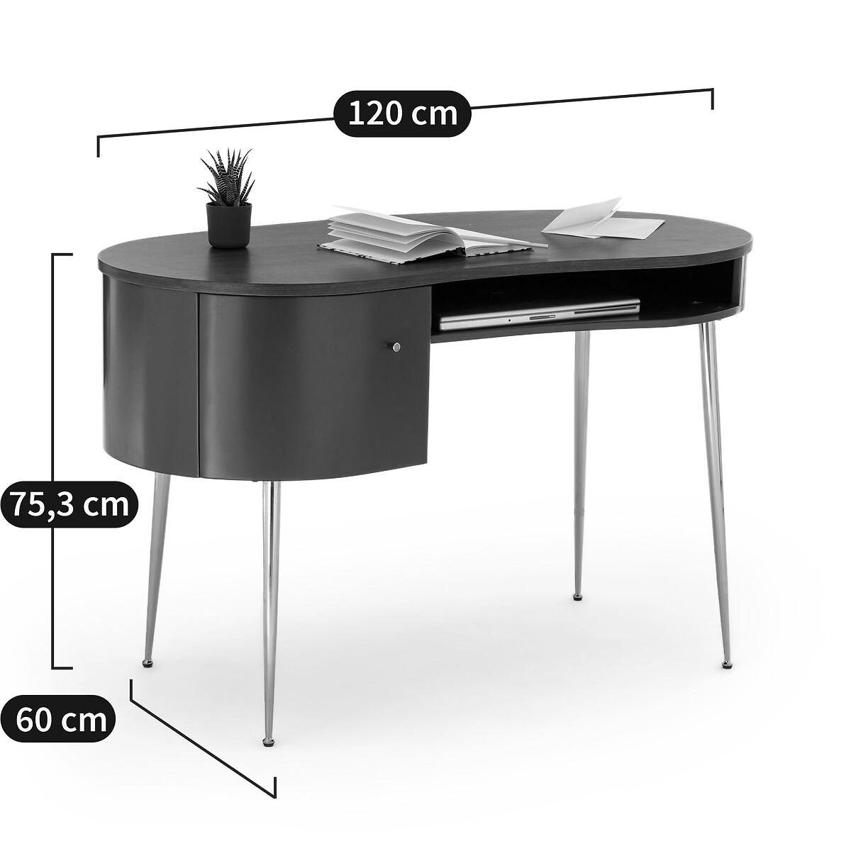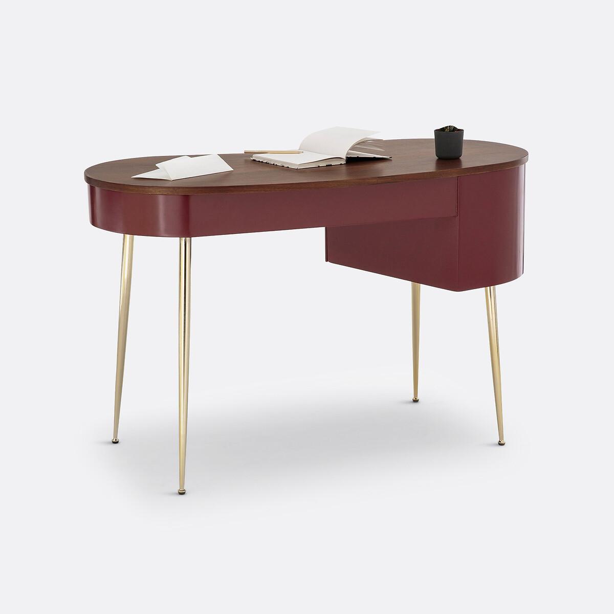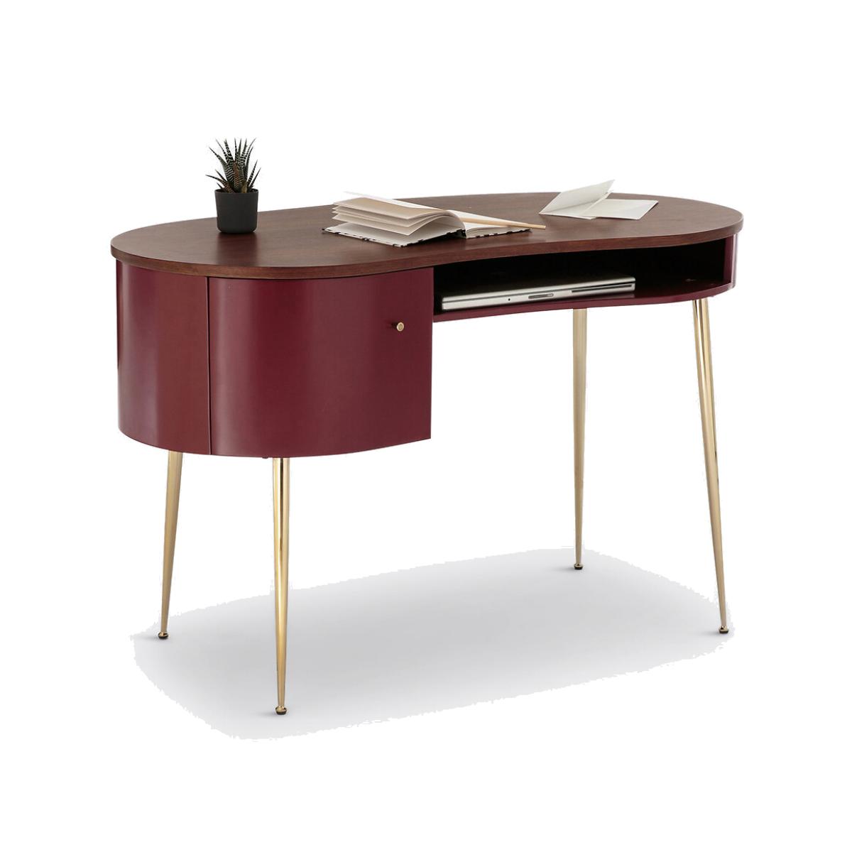 Kidney shape with fine brass legs... vintage style is reinterpreted in the most beautiful way. An exclusive creation by our in-house designers. Product Details • Walnut veneered MDF top • MDF frame with polyurethane finish lacquer • Brass/gilt metal legs with pads • 1 door • 1 compartment beneath the desk top • Adjustable tapered legs in gilt metal with pads. Dimensions • Width: 120cm • Height: 75.3cm • Depth: 60cm • Interior of unit: L32 x H28 x D50cm • Open compartment: L62 x H8.5 x D48cm • WOOD FROM SUSTAINABLY MANAGED FORESTS. FSC® certified wood comes from forests that are environmentally, socially and economically well managed. Parcel Dimensions: • 1 parcel • L128 x H40 x D70cm, 34.5kg