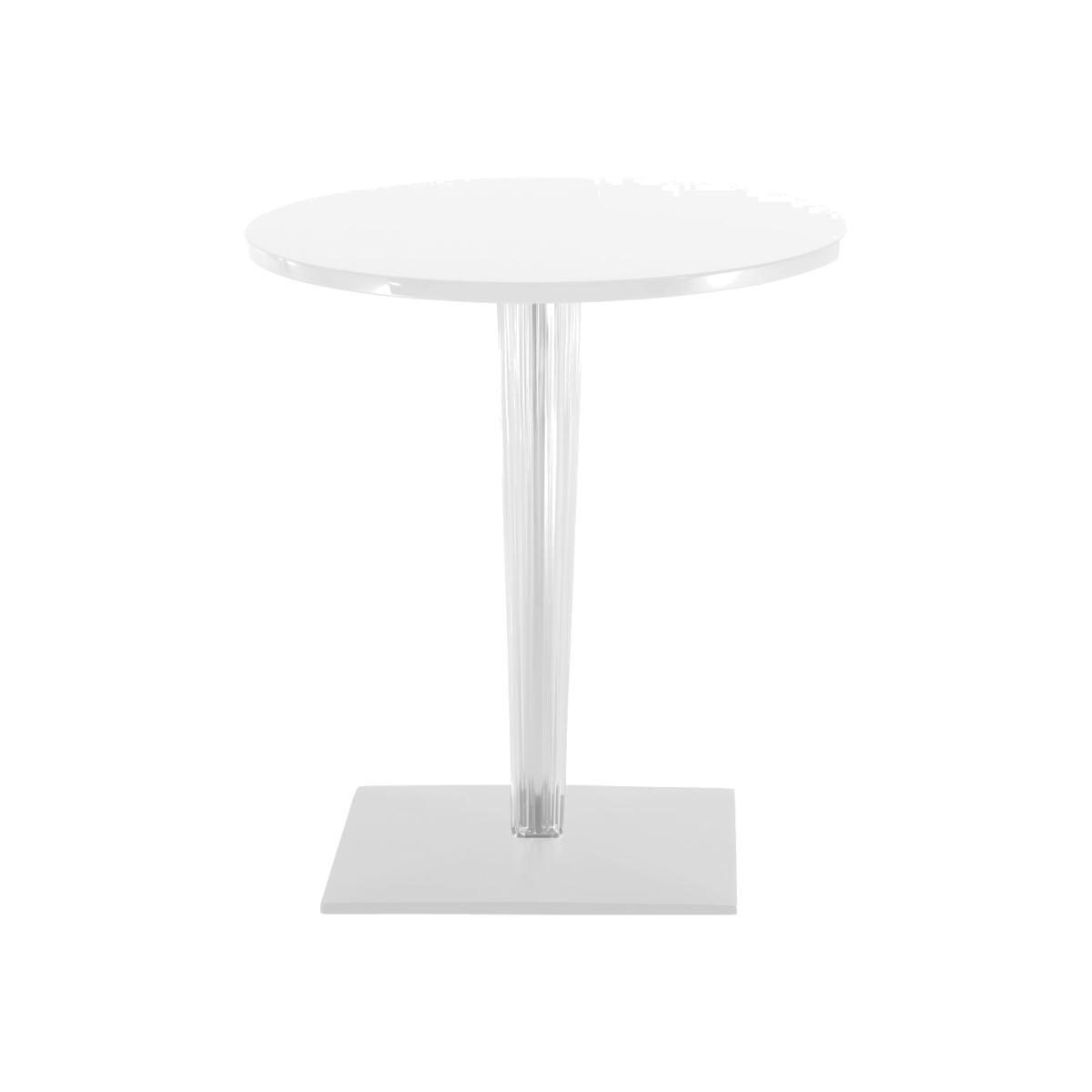 TopTop, Roundor square table. The Top Top table line is a Philippe Starck's creation. It is distinguished by its aternation of opaque and transparent surfaces and by an enormous choice of dimensions, shapes and materials. This version is to perfect to accompany the Starck's chairs Dr Yes. The table is available with a melaminated black or white top and a base with the same colour. The leg can be either a round and smooth or a square and faceted transparent section with a metal core. This model is resistant and can be used outside.