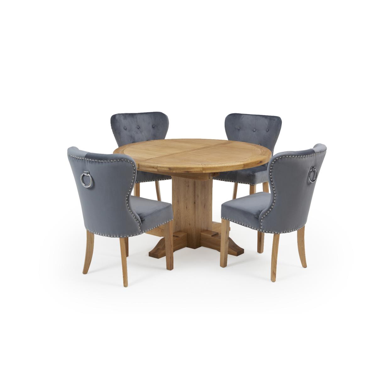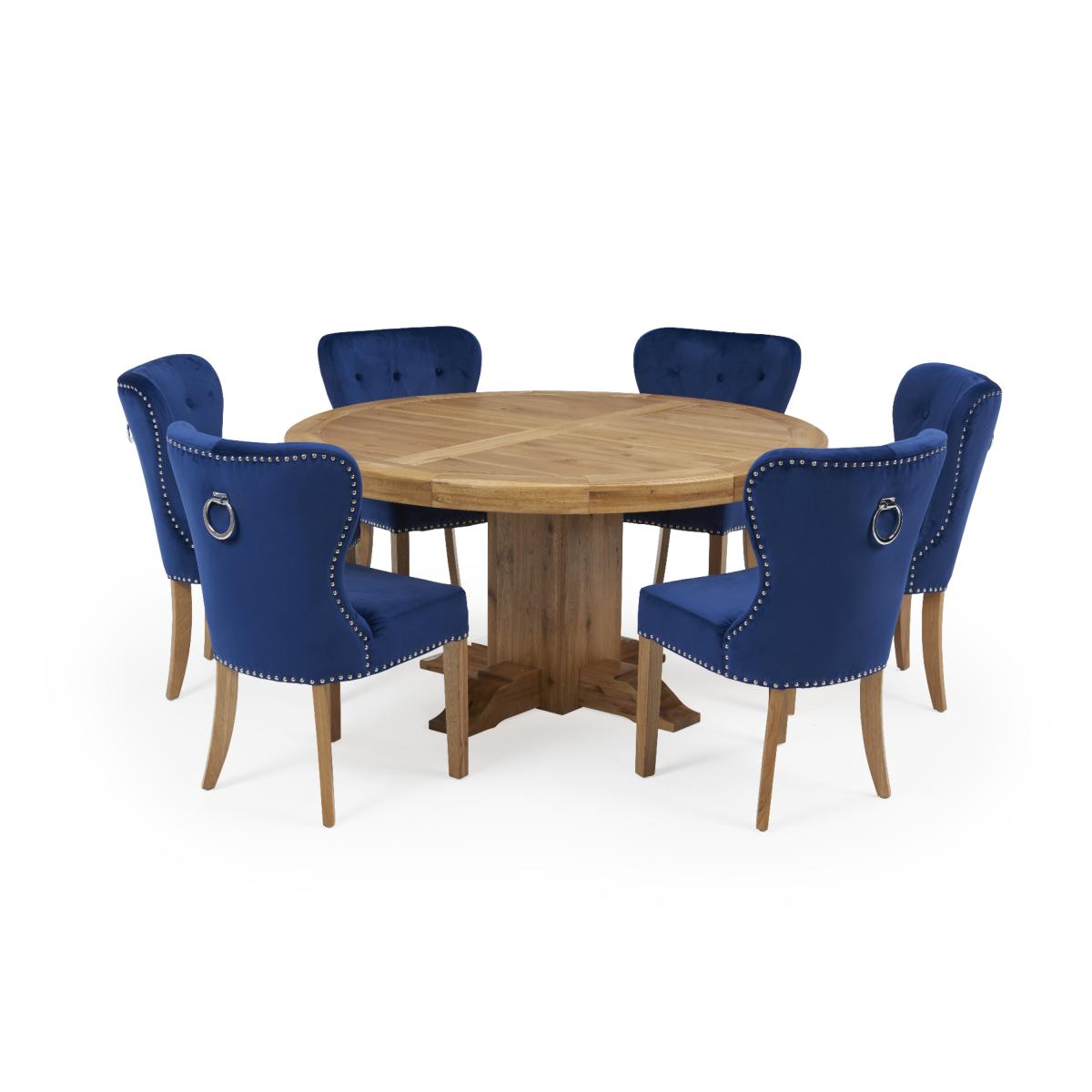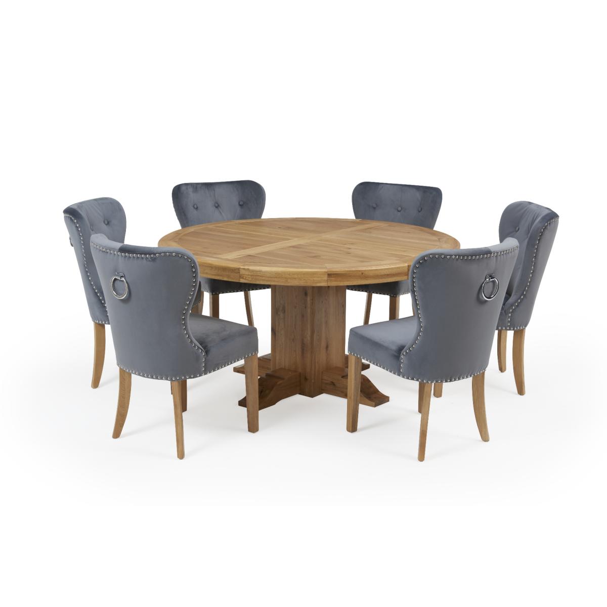 Robust contemporary style and practical design combine to make the Torino 150cm Solid Oak Round Pedestal Dining Table an asset for your home. Seating up to 6 people, the round oak dining table is an ideal setting for any occasion. Crafted from durable solid oak, the round dining table features a thick table top supported by a sturdy central pedestal leg. The Torino dining table is complete with a clear lacquer finish that protects and highlights the oak grain for a stunning natural look. Featuring solid oak legs and velvet upholstery, Knightsbridge Chairs complement the Torino table. Complete with a tufted button design, chrome stud detailing and a chic chrome ring on the backrest, the velvet chairs are available in your choice of grey or blue.