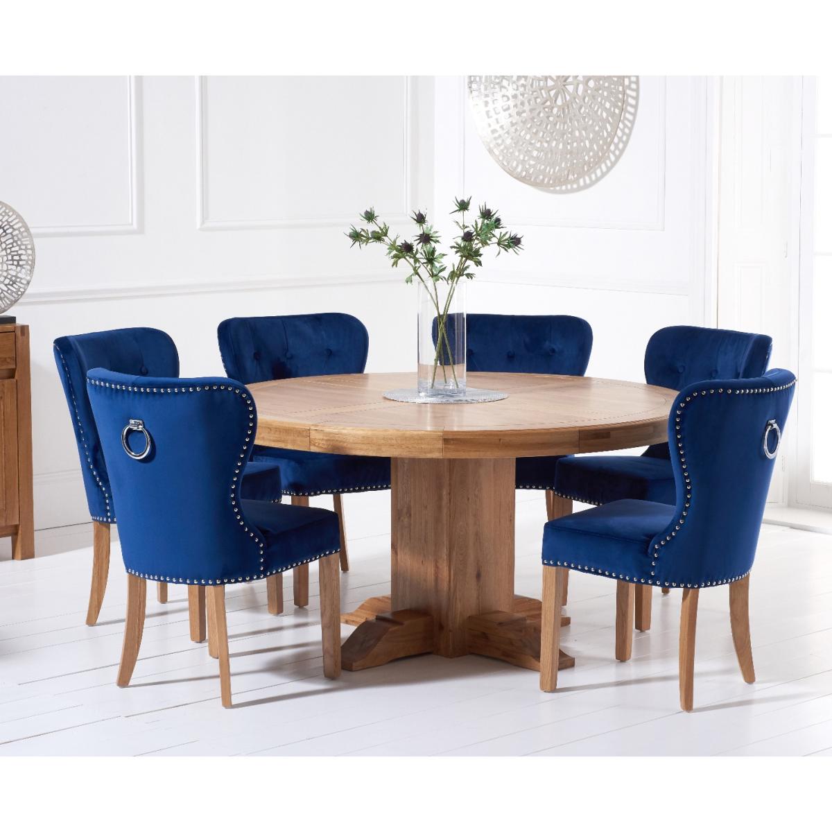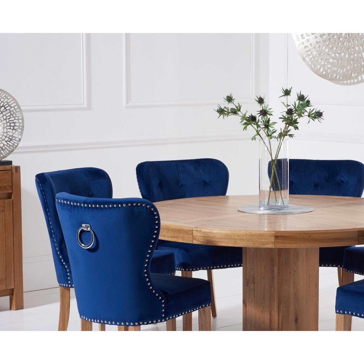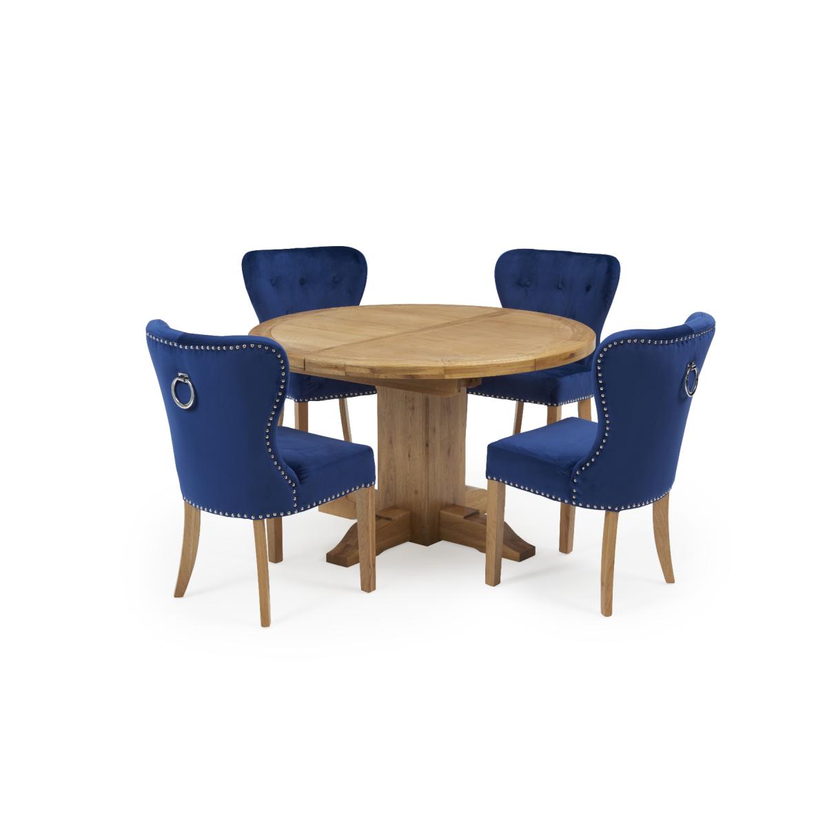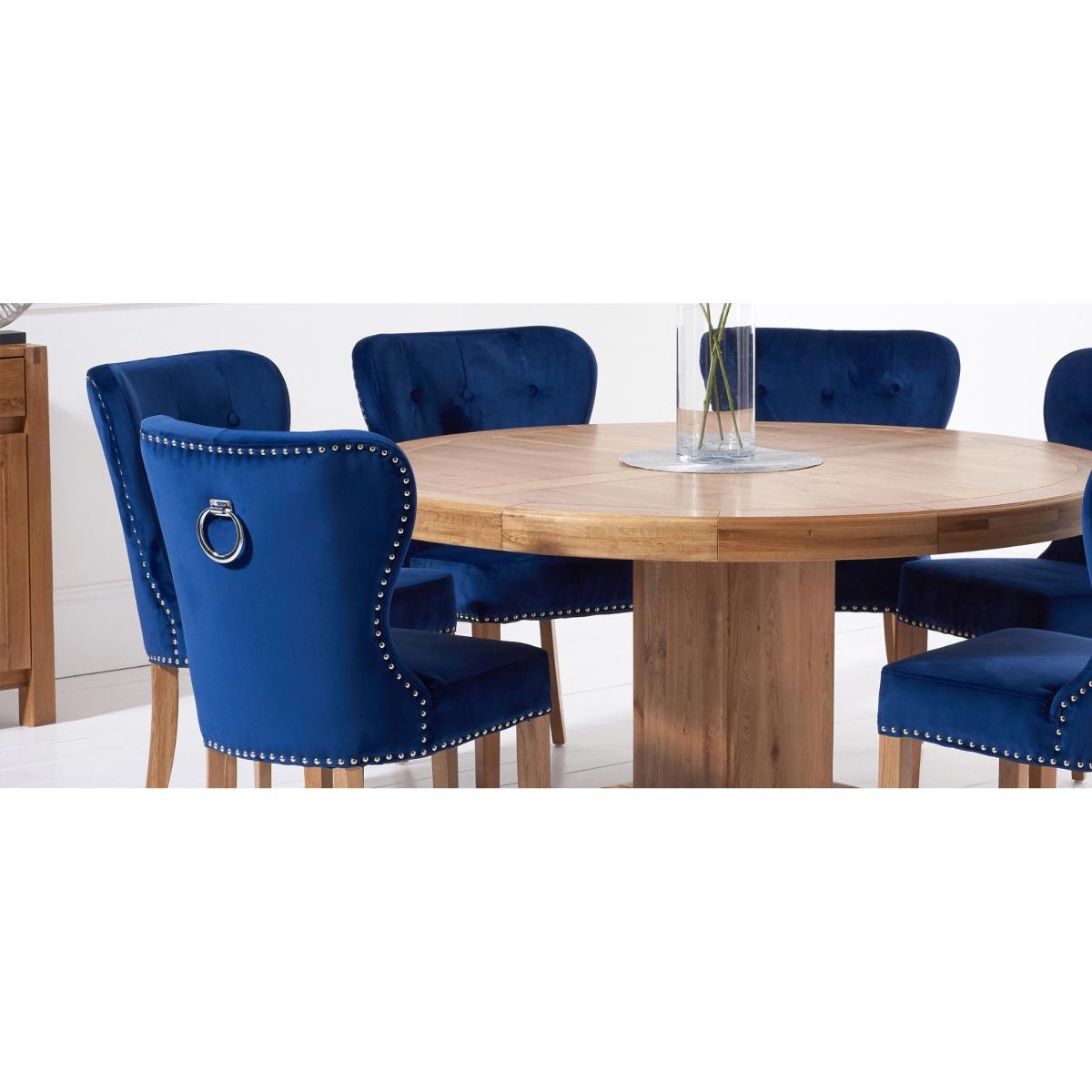 Robust contemporary style and practical design combine to make the Torino 150cm Solid Oak Round Pedestal Dining Table an asset for your home. Seating up to 6 people, the round oak dining table is an ideal setting for any occasion. Crafted from durable solid oak, the round dining table features a thick table top supported by a sturdy central pedestal leg. The Torino dining table is complete with a clear lacquer finish that protects and highlights the oak grain for a stunning natural look. Featuring solid oak legs and velvet upholstery, Knightsbridge Chairs complement the Torino table. Complete with a tufted button design, chrome stud detailing and a chic chrome ring on the backrest, the velvet chairs are available in your choice of grey or blue.