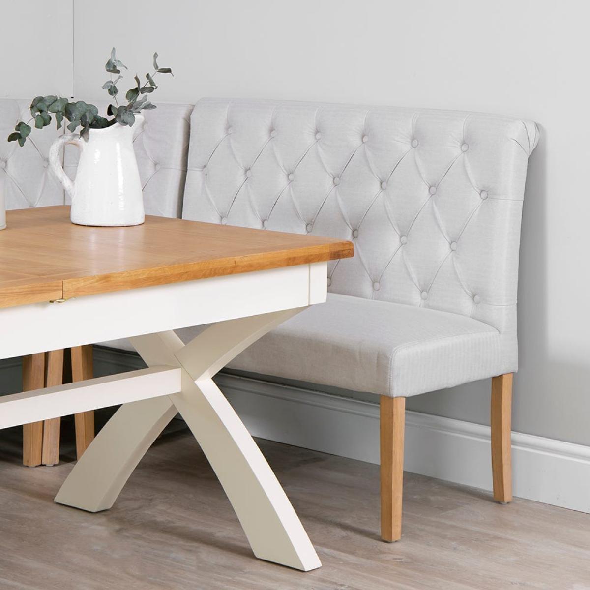 I love this beige scroll back bench for its elegant yet versatile design, making it a great addition to both traditional and contemporary interiors. Its neutral tone offers flexibility in styling, allowing it to complement a variety of colour schemes, while the scroll detailing adds a touch of classic charm. Practical tips include placing it at the end of a dining table or in a hallway for extra seating, and dressing it with textured cushions or throws to soften its look and enhance comfort. It works especially well in cosy breakfast areas, country-style kitchens, or even in a minimalist space where its understated elegance can shine.