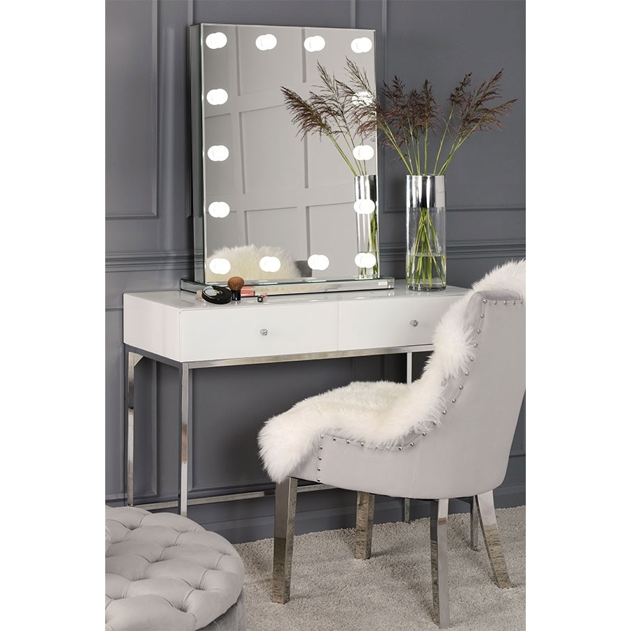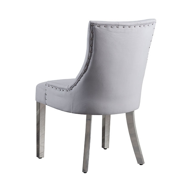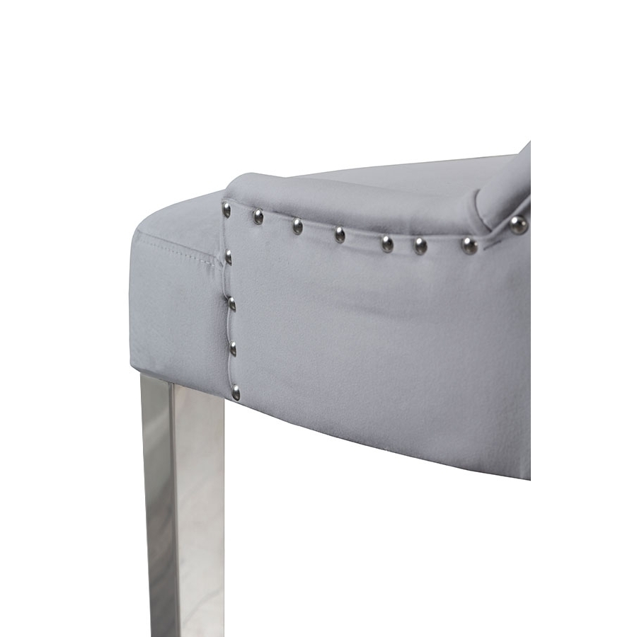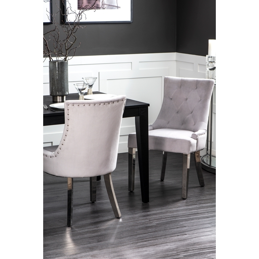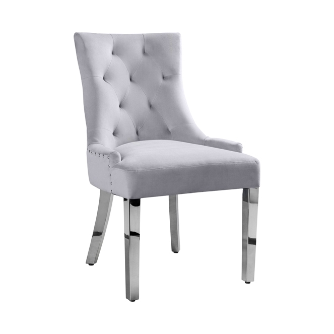 An updated version of our best-selling dining chair Featuring glamourous polished stainless steel legs Will co-ordinate with any style or colour dining table Characterful blind tufting and chrome upholstery tacks Partial assembly required, simply attach the legs