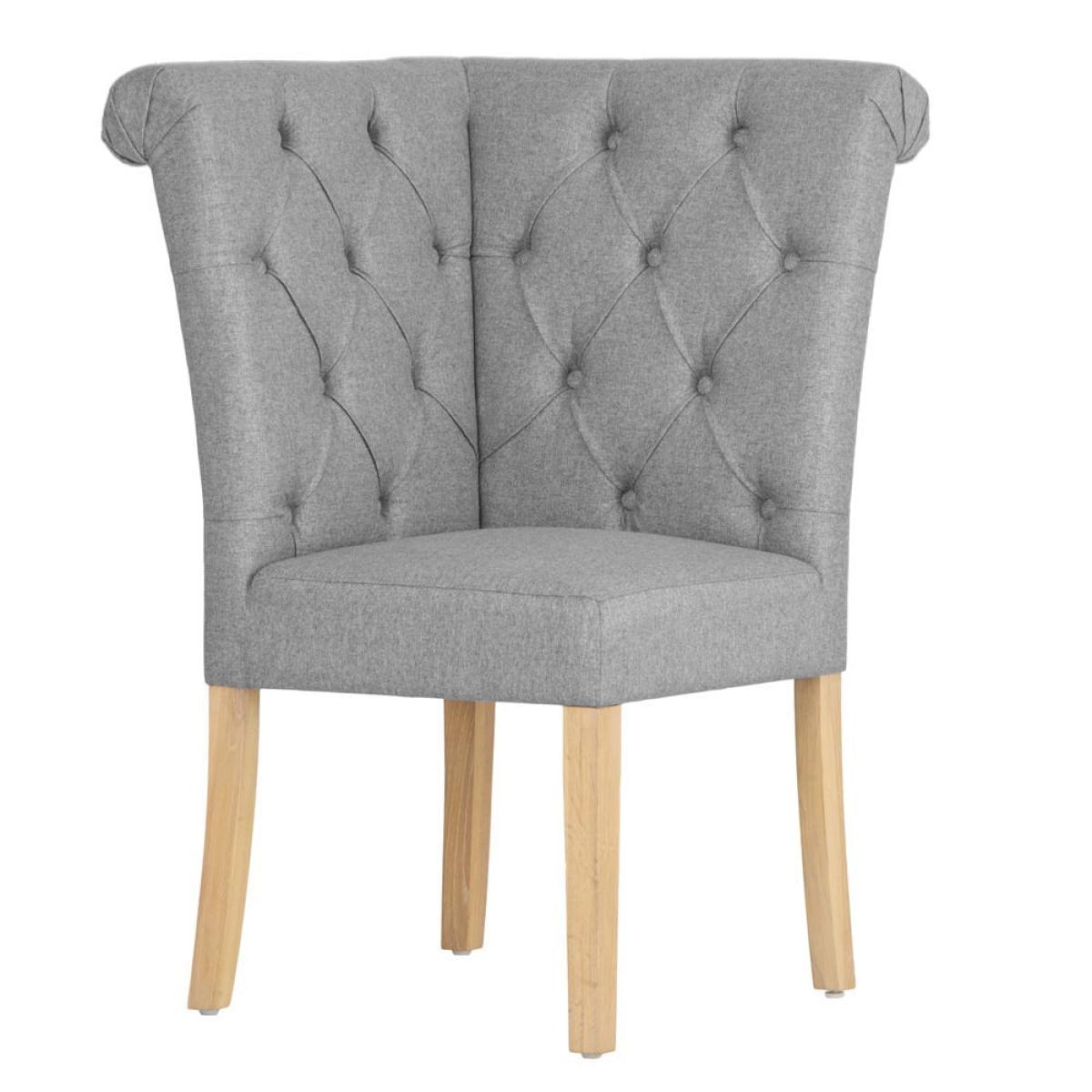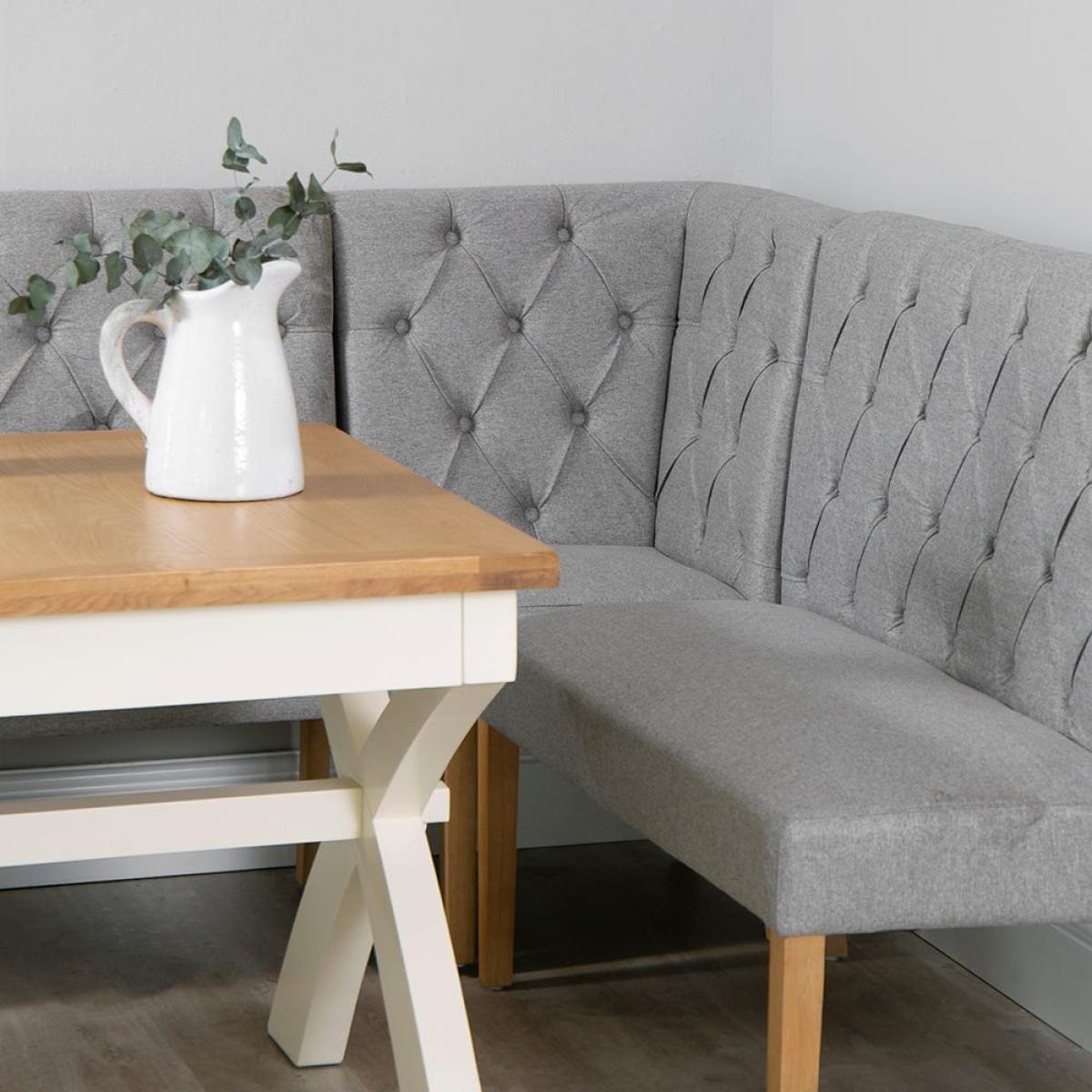 I love this corner bench for its versatile style and understated elegance. The light grey scroll back design brings a classic yet contemporary touch, making it adaptable to a range of interiors from cosy kitchens to open-plan living spaces. It works particularly well in informal dining areas or as a seating option in a breakfast nook, adding a welcoming vibe. Practical styling tips include pairing it with patterned cushions or contrasting throws to add personality, or keeping it minimalist with monochrome tones for a sleek look. The wood legs also lend warmth and help soften the overall aesthetic, making it a practical yet stylish addition.