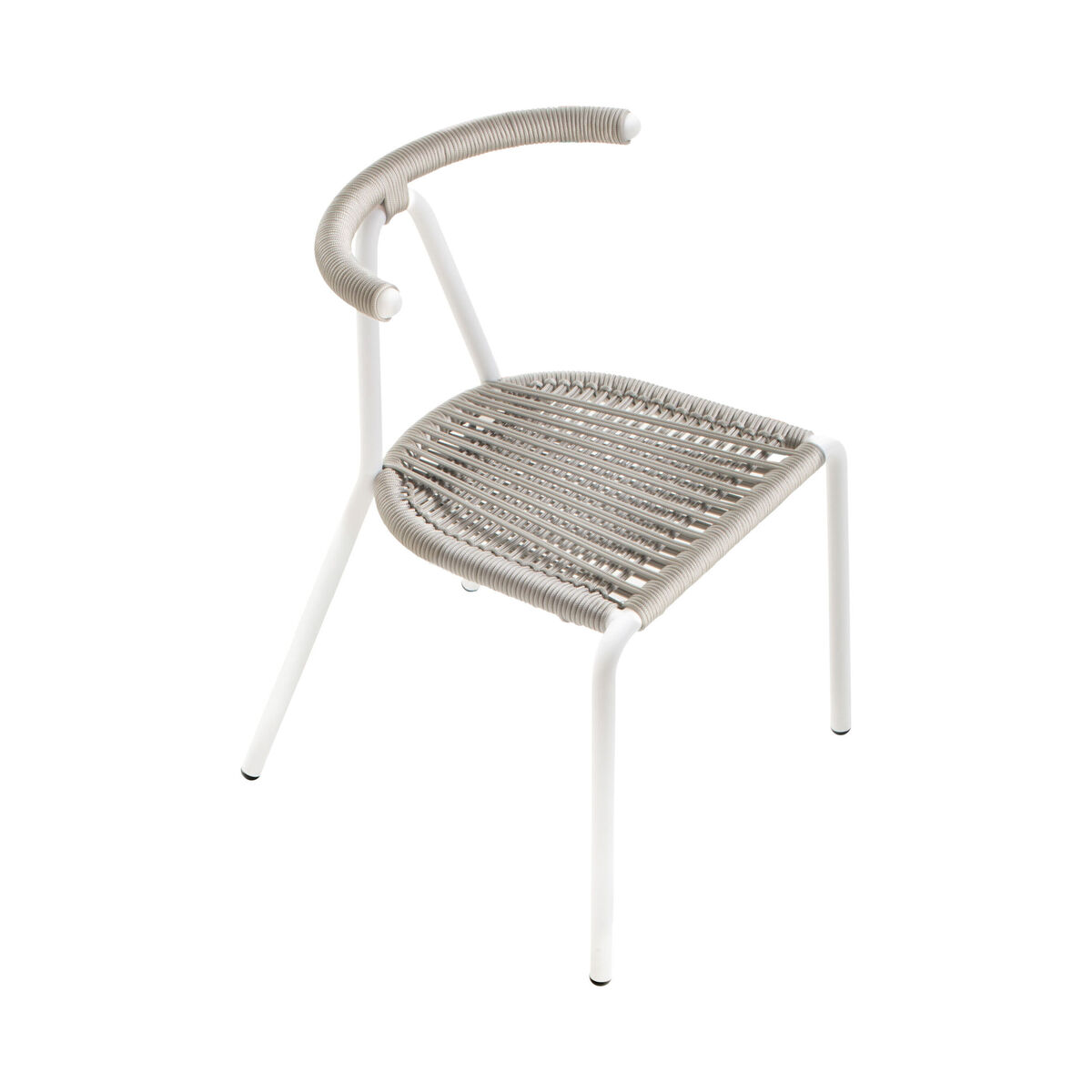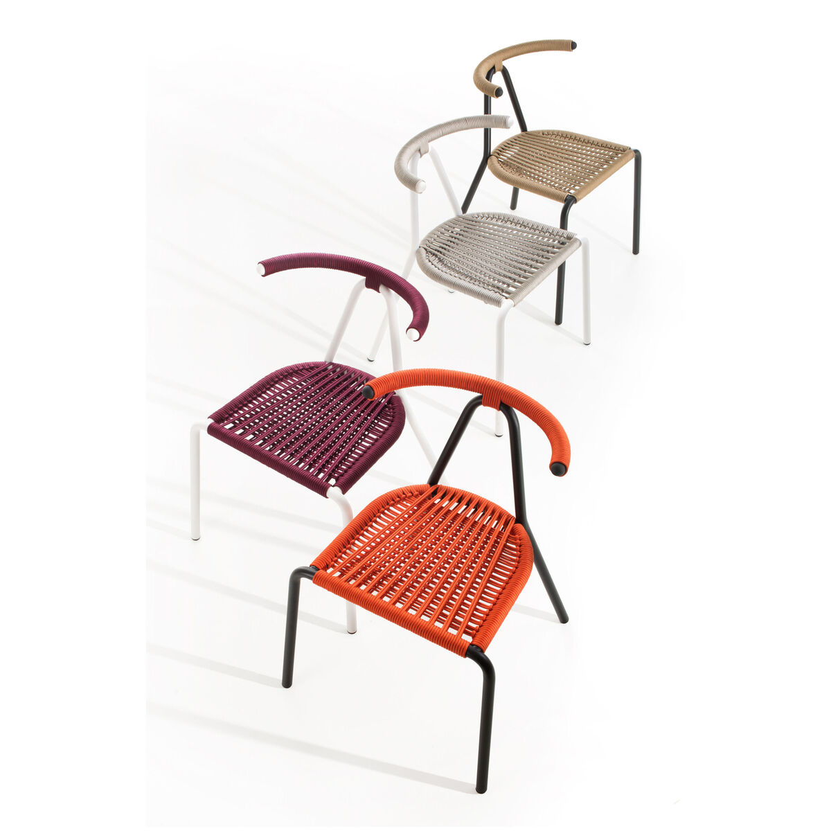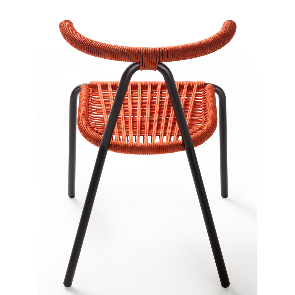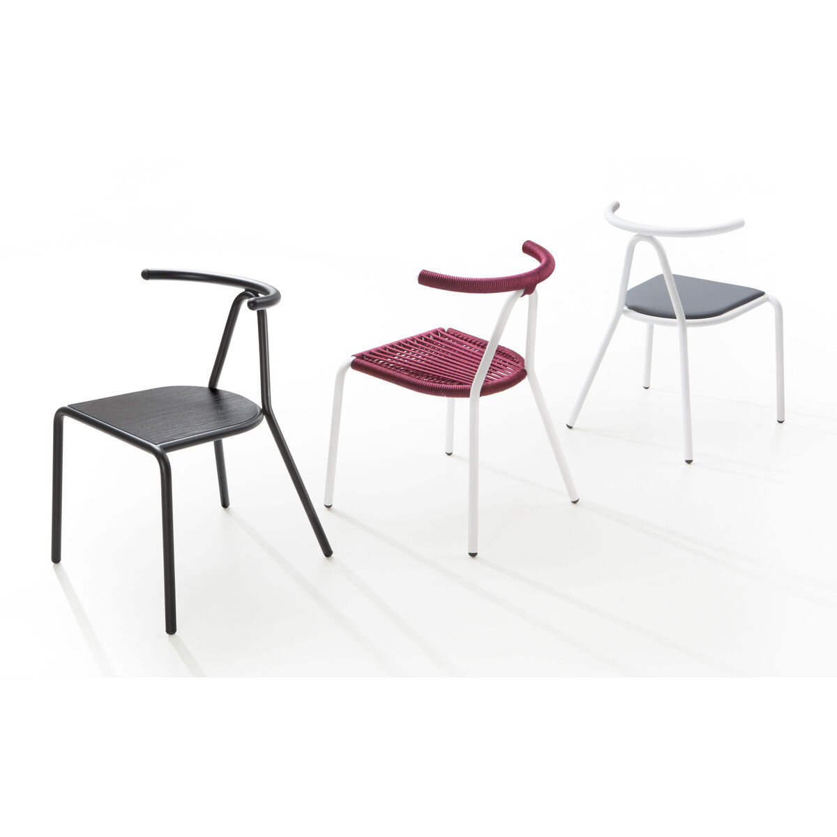 A chair with a distinctive, iconographic shape: the “oversized” tubular structure and simplified design make it stackable, the backrest resembling bull's horns gives it a strong graphic image. The versions with multi-layered wooden and upholstered seats are suitable for indoor use while the outdoor versions feature interwoven seat and backrest and painted galvanised steel structure.