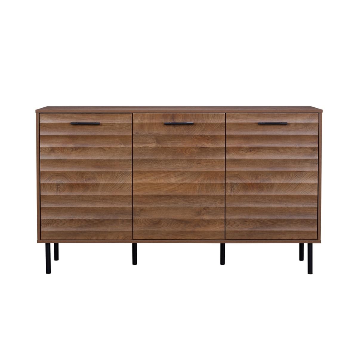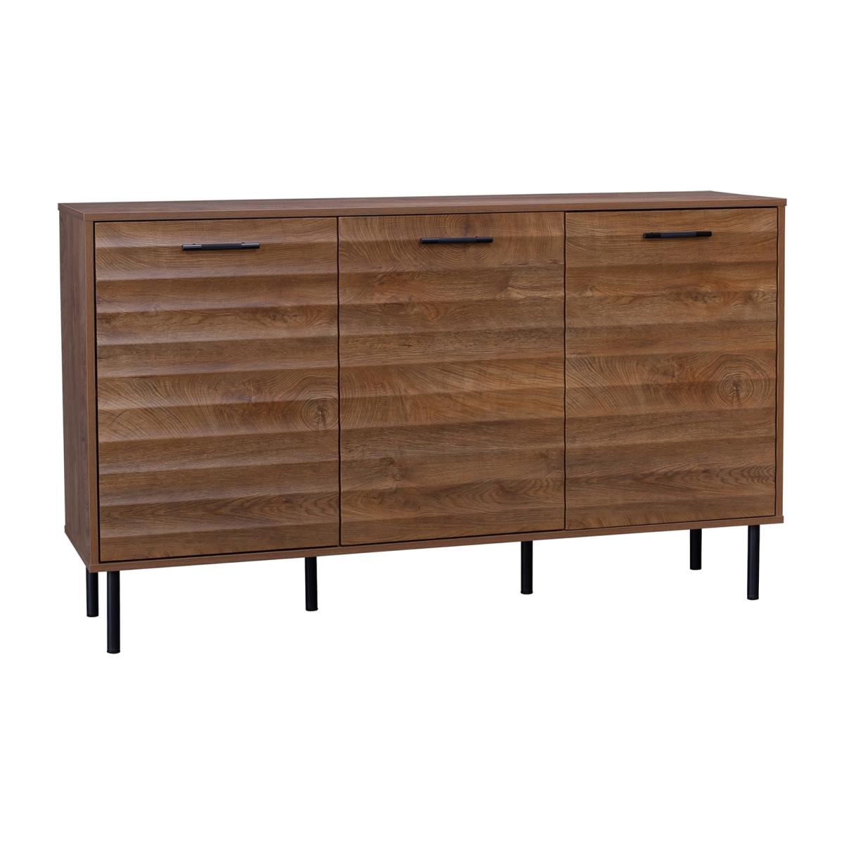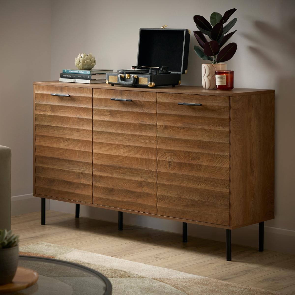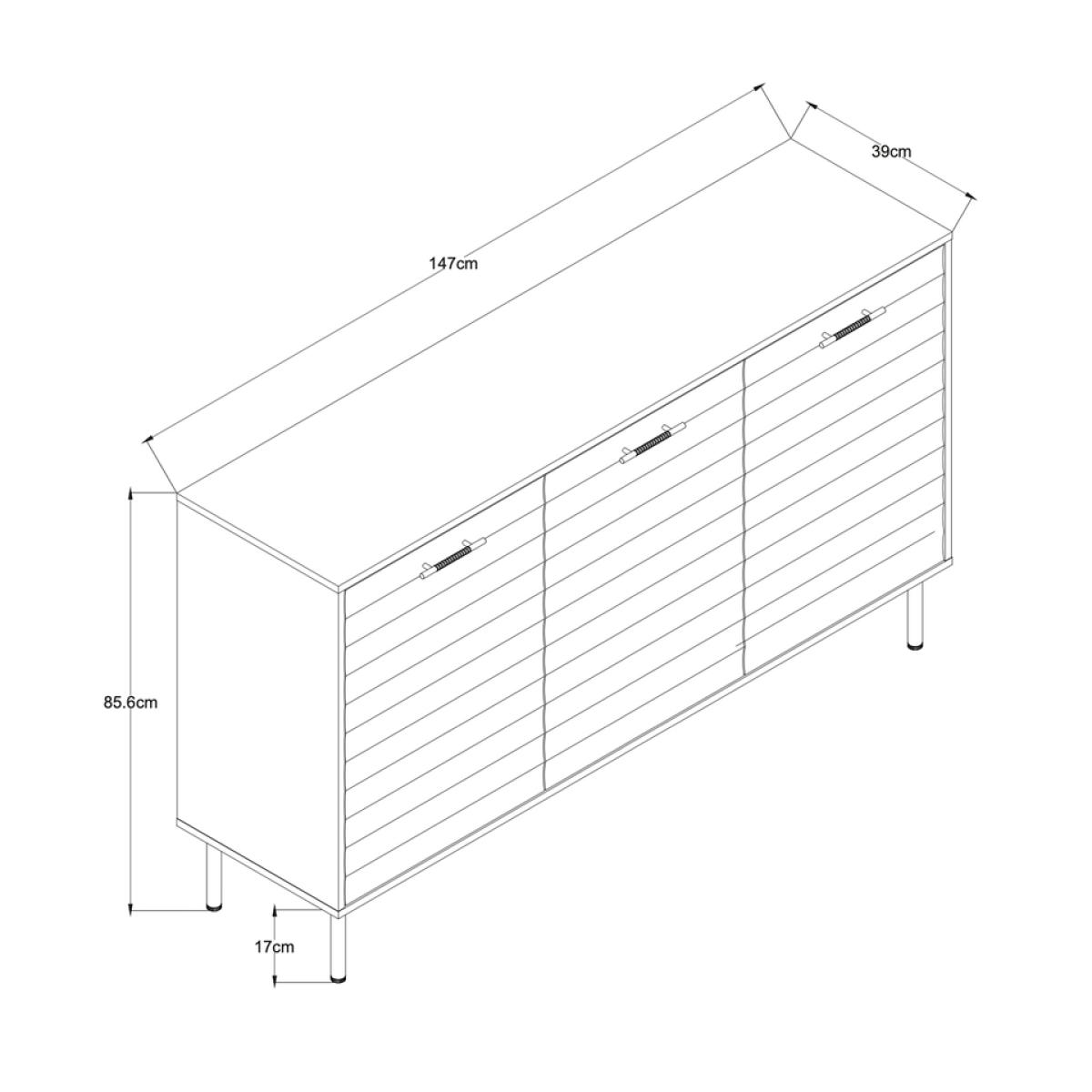 The Toronto wide sideboard is a real tactile treat! The horizontally fluted door fronts give this cabinet a fluid shape while the knurled black metal handles and black metal legs give it an industrial edge. The dark wood grain effect finish give Toronto its sophisticated feel and subtly adds depth and texture to your space. The three fluted doors hide ample storage with internal shelves to help you keep your home clutter free.