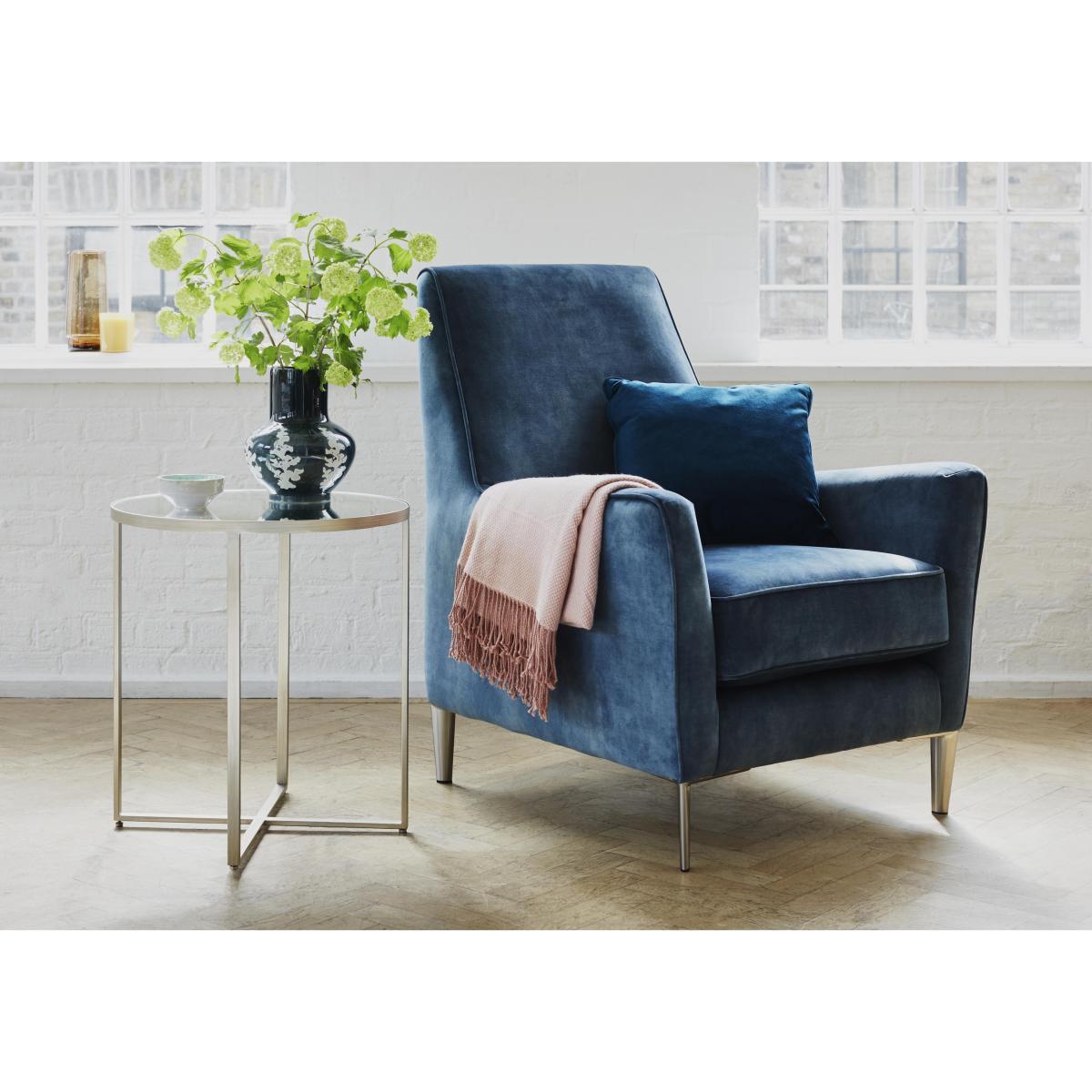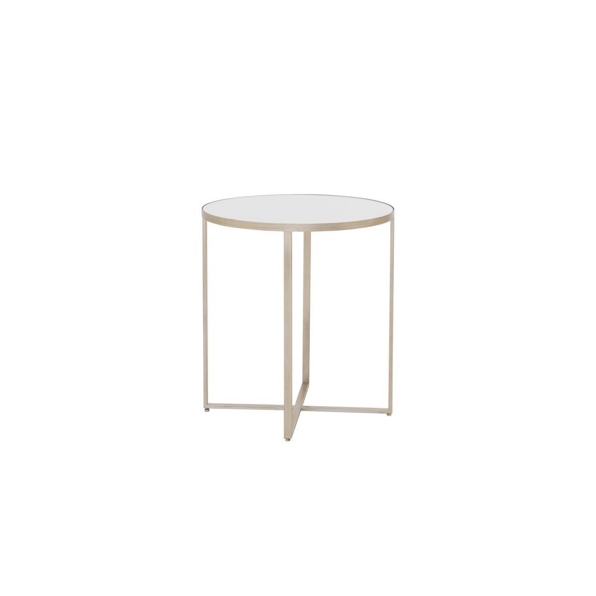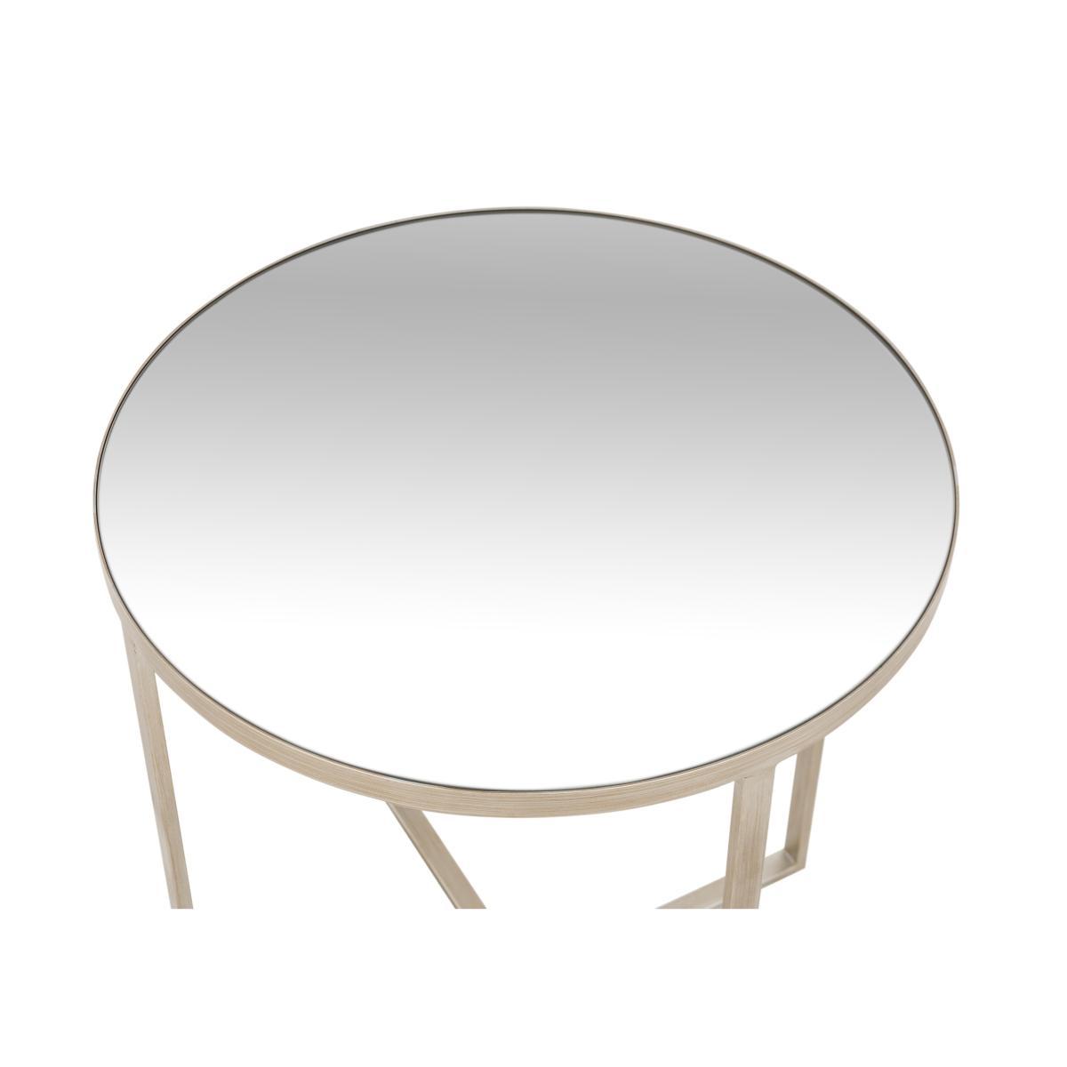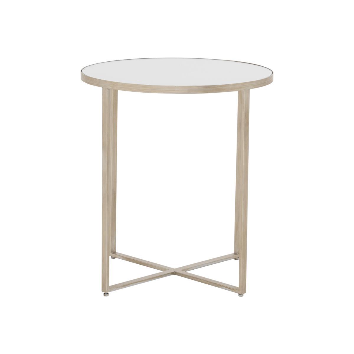 The sophisticated pairing of metal and glass seems to suit most home décor styles, as it’s a combination that presents as both glamorous and luxurious, and fashionable and contemporary depending on the setting. This is particularly true of the versatile Torrance collection of occasional pieces. These round tables feature beautifully-made brushed-effect metal frames with sturdy X-shaped bases and sophisticated mirrored glass tops. A stylish contemporary addition to any home – and at great-value price. Chic contemporary style with a luxe finish. Brushed-effect metal with mirrored glass top. Luxe modern style at a great value price. Bring a touch of luxe contemporary style to your living room in the form of the Torrance lamp table. This round end table is versatile and functional as well as being particularly stylish. It features a smooth, continuous metal frame with little sign of welding and has a brushed-effect finish. The inlaid top is made of mirrored glass, a sophisticated touch. Sturdy and stable with a stylish cross-shaped base, this neat side table looks wonderful in a wide variety of settings thanks to its timeless design and high-quality neutral finish. The Torrance lamp table is part of the exceptional-value Torrance collection of occasional tables which also includes the circular metal and mirrored glass-topped Torrance coffee table. Sophisticated luxe style for your fashionable contemporary home. Did you know?. Under direct light, glass surfaces can reveal the polishing process in the form of small scratches. Coasters are recommended.