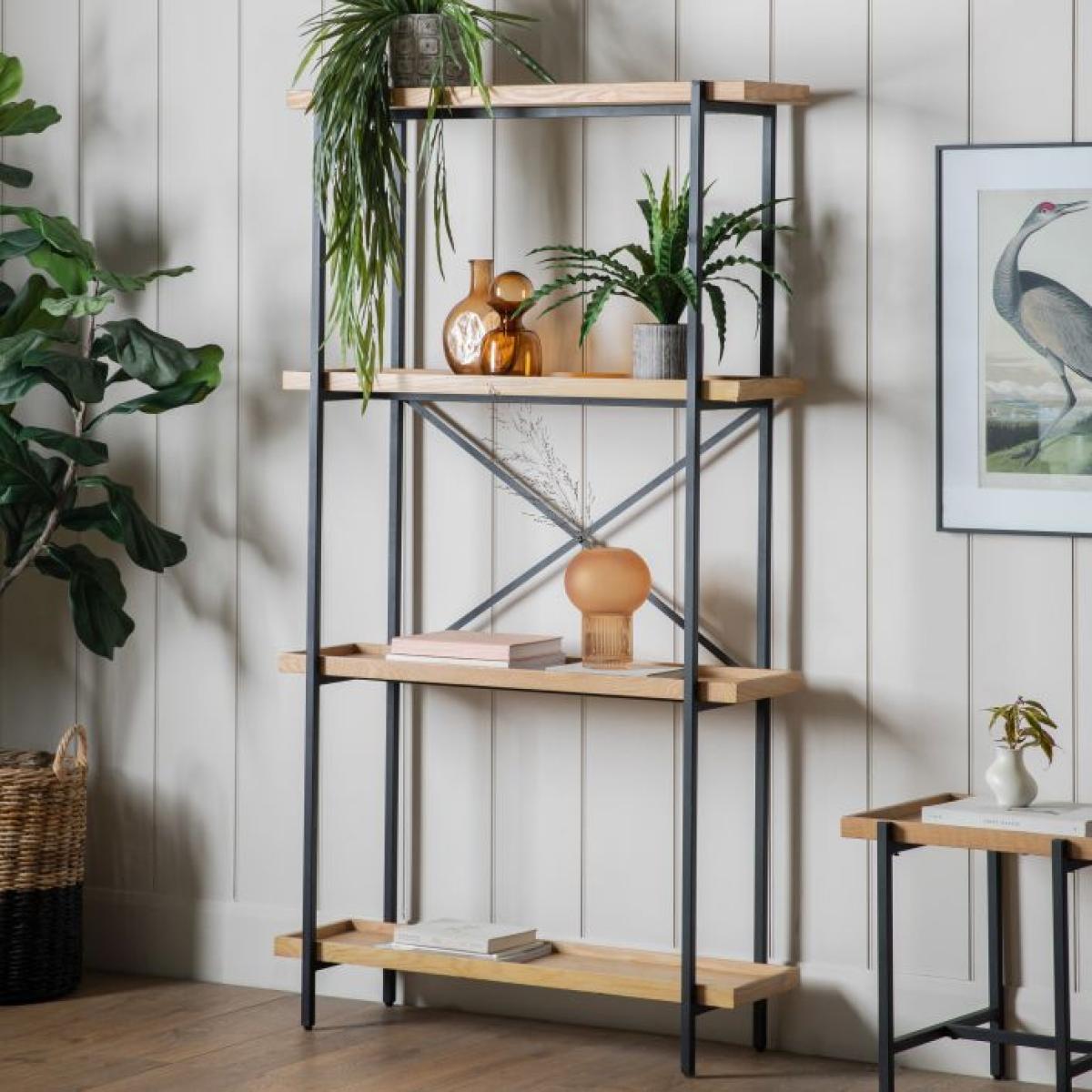 Offering a stunning contemporary look, this large open display unit combines matt black metal with oak. The shelves are tray-style with oak veneer tops and solid oak surrounds. Matching pieces are available. It is part of our Packed-Flat Design Project, offering easy delivery to any room in any property, whilst reducing the packaging needed. Easy assembly is required, but all the tools needed are supplied.