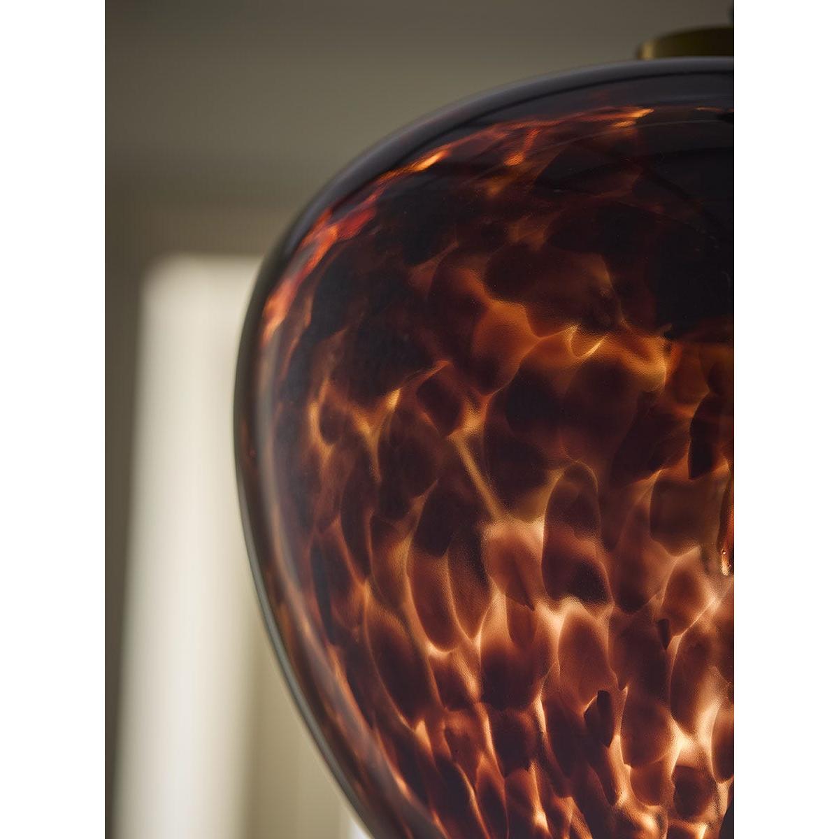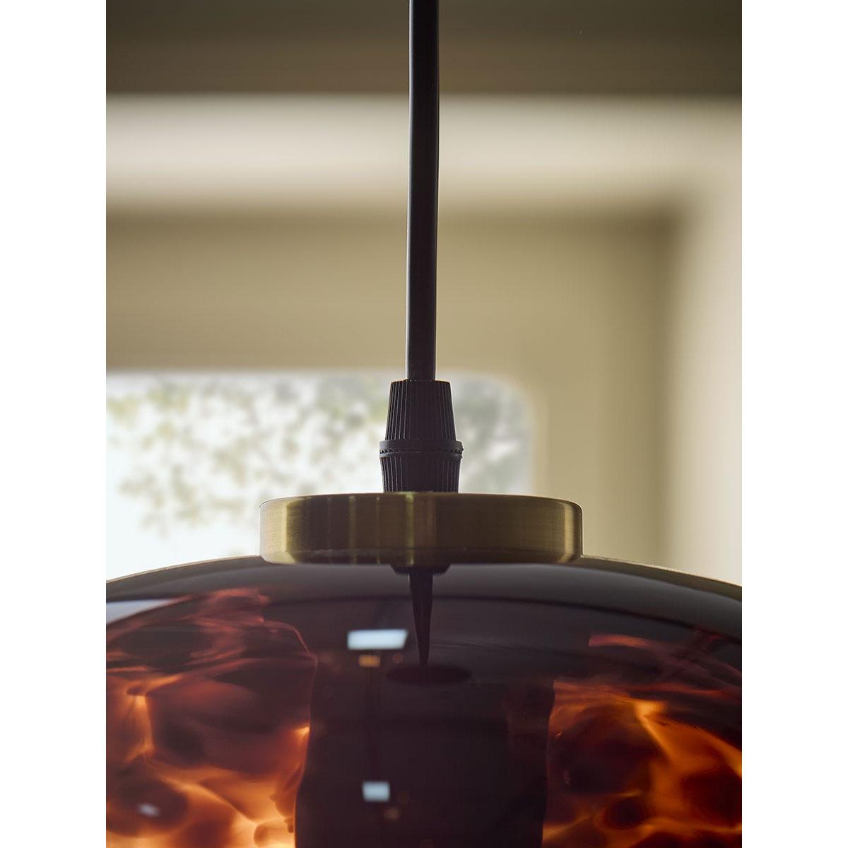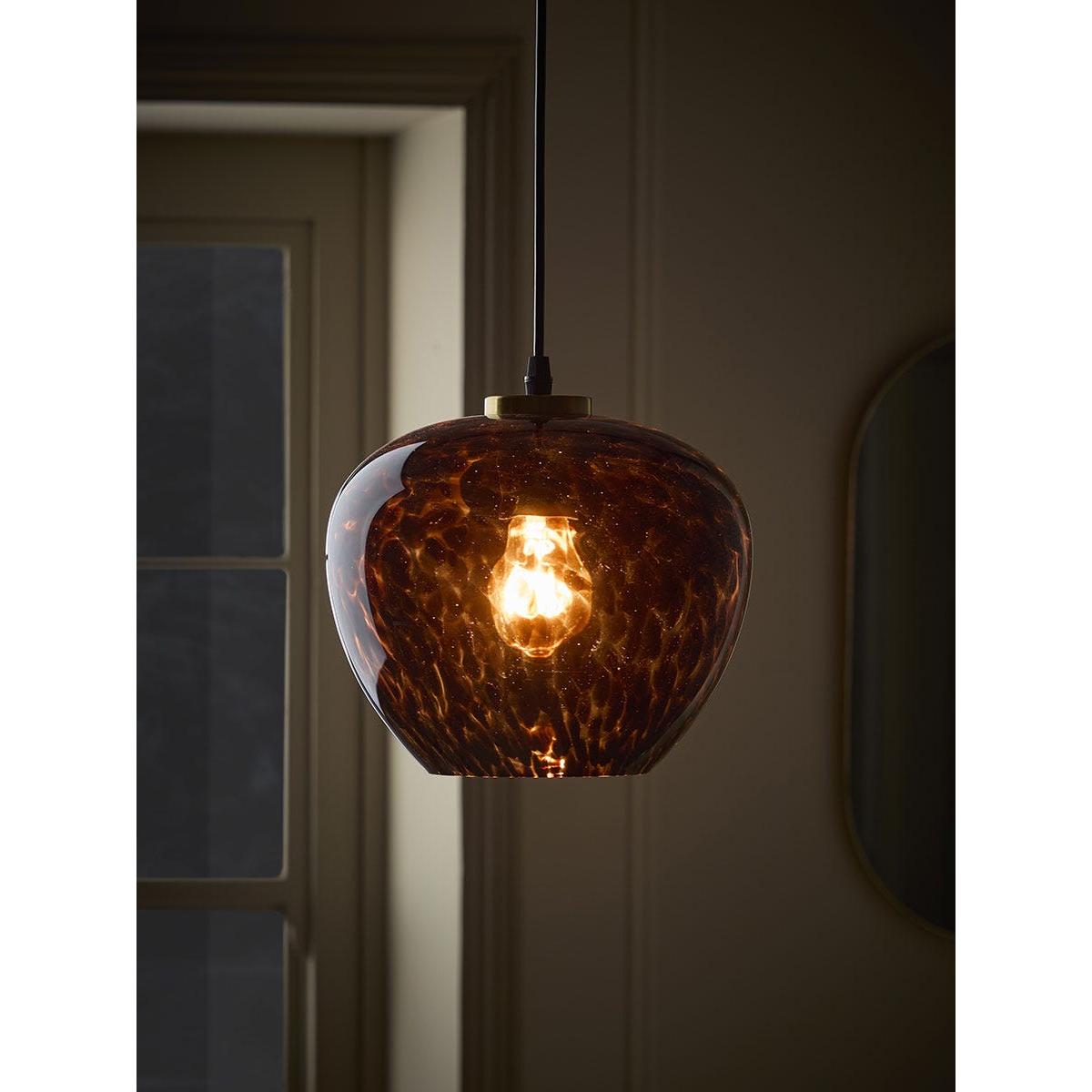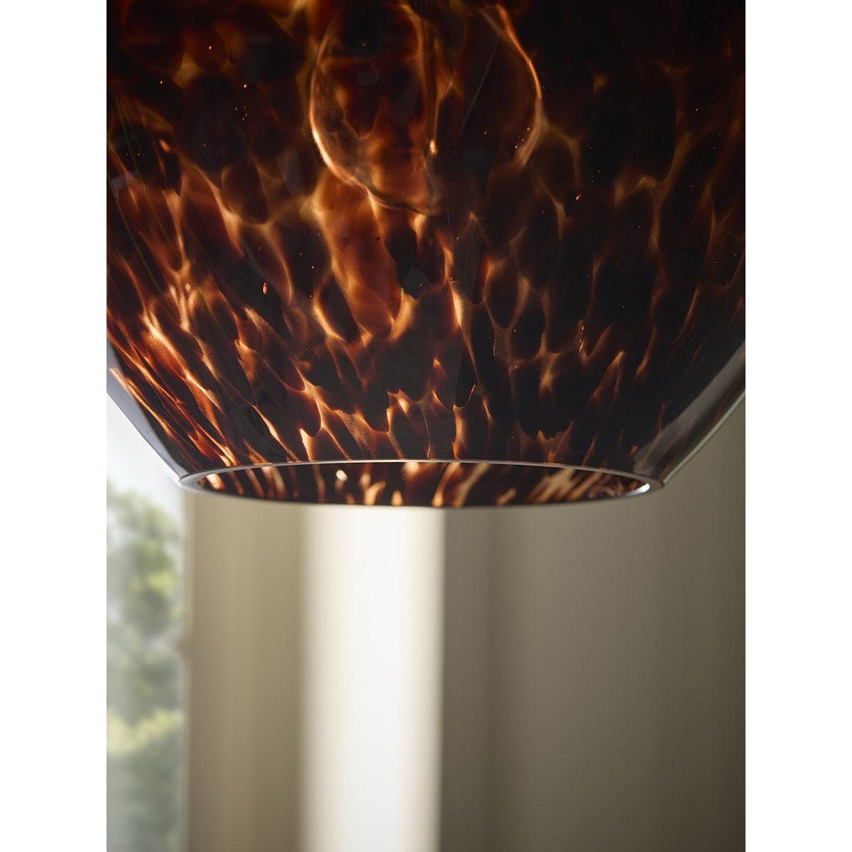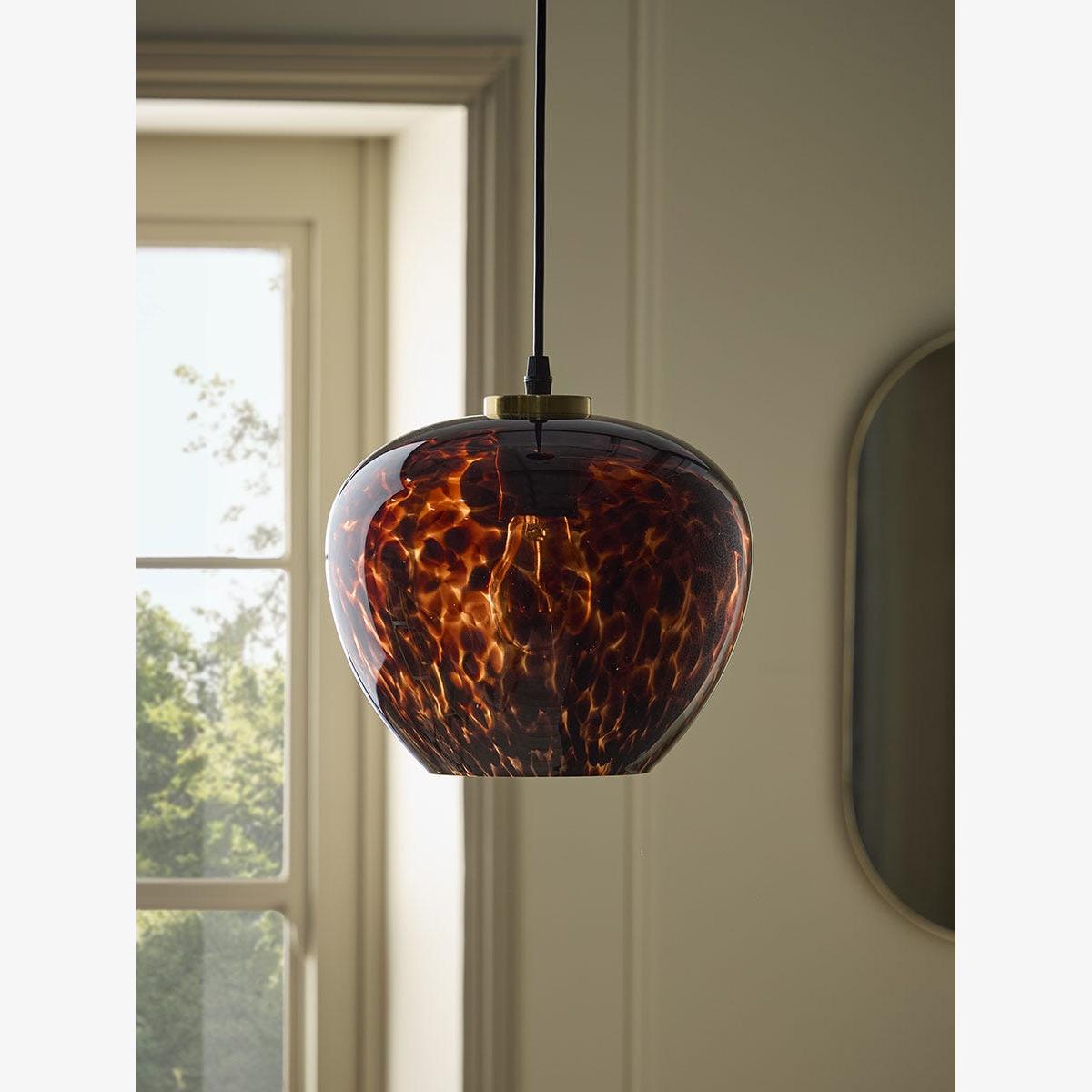 Make an instant impact with this striking glass pendant light.  The rich tortoiseshell design brings warmth and character to your space, while the brushed gold fitting adds a touch of elegance and modern luxury.  The beautifully curved glass shade gives off a soft, ambient glow which is perfect for creating a welcoming atmosphere in any room. Whether you hang it solo over a dining table or style a few together in a hallway or kitchen, this pendant is a statement piece that transforms your space. Stylish, on-trend, and effortlessly sophisticated.